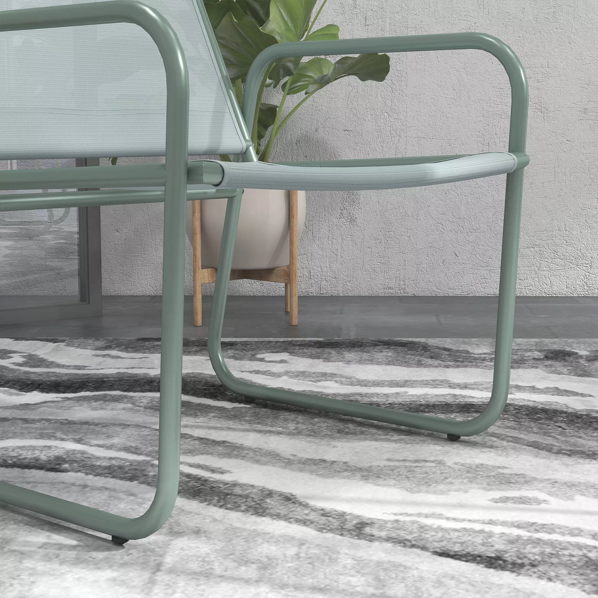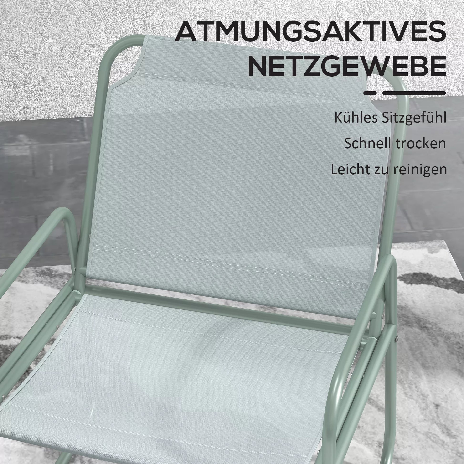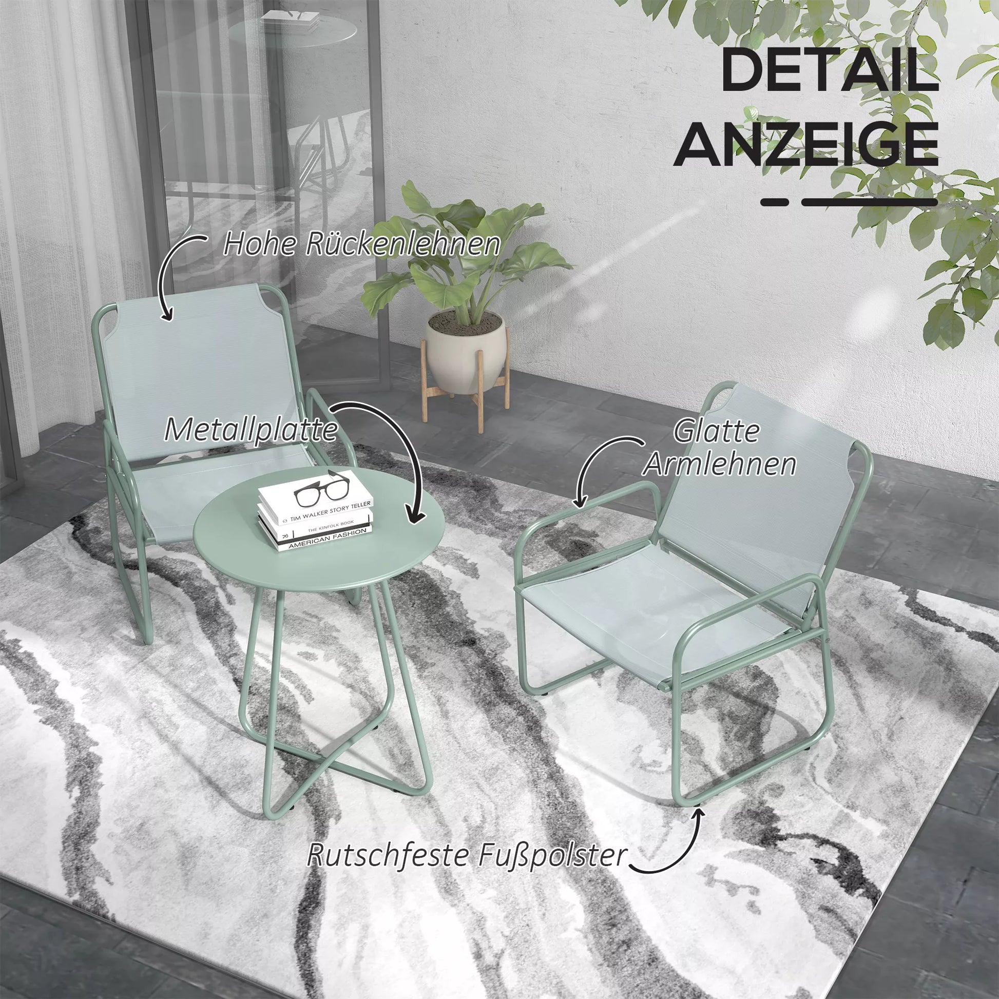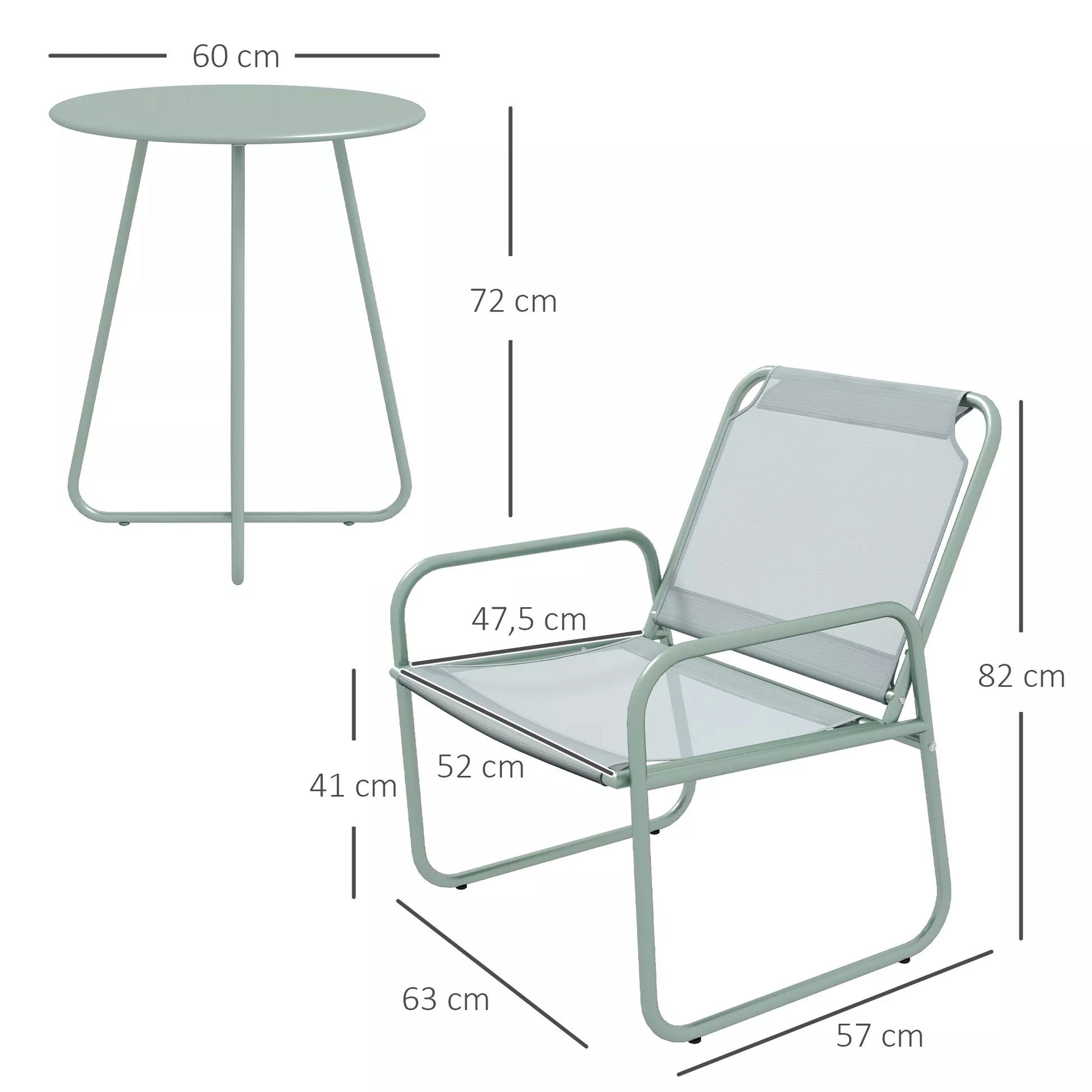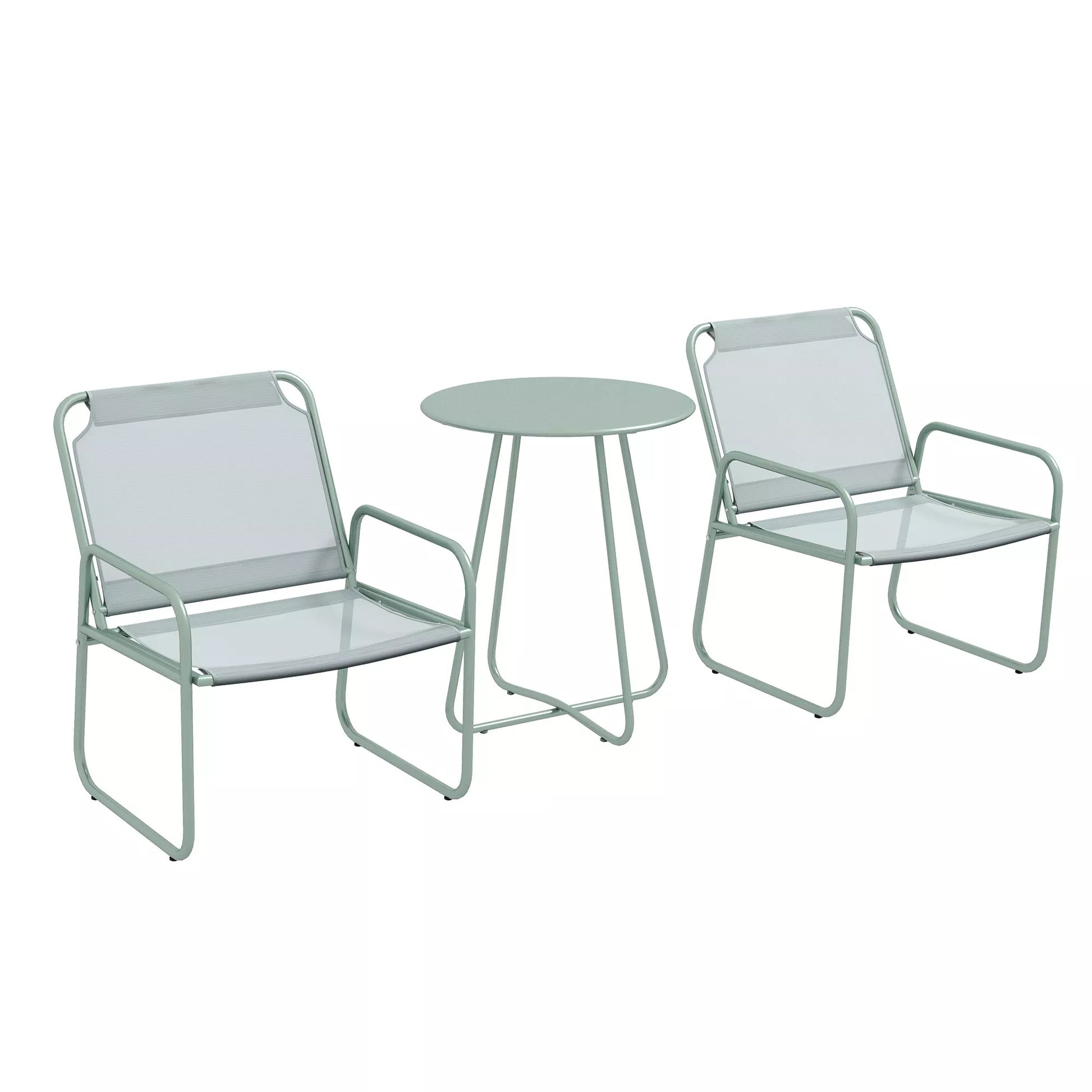 3 dalių sodo baldų komplektas, 2 kėdės su kvėpuojančiu audinio užvalkalu, 1 apvalus stalas Ø60 cm, žalias.