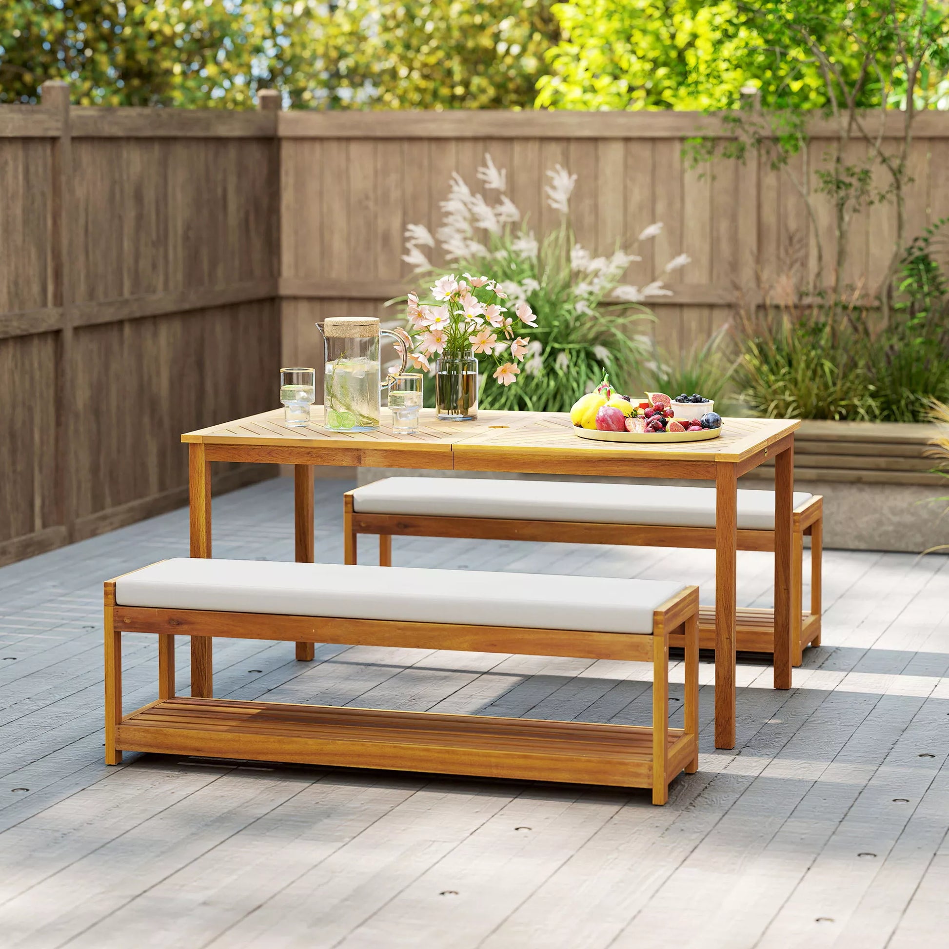 Paverskite savo sodą kviečiančia valgomojo erdve su šiuo sodo stalo ir kėdžių komplektu. Šis žavus sodo baldų komplektas apima stalą ir dvi suolus su minkštais, užtrauktukais užsegamais užvalkalais papildomam komfortui. Sodo poilsio komplekto stalas su 50 mm skersmens skylę skėčiui ir ilgaamžiu, lengvai valomu akacijos medienos lentelių dizainu sujungia stilių ir funkcionalumą.