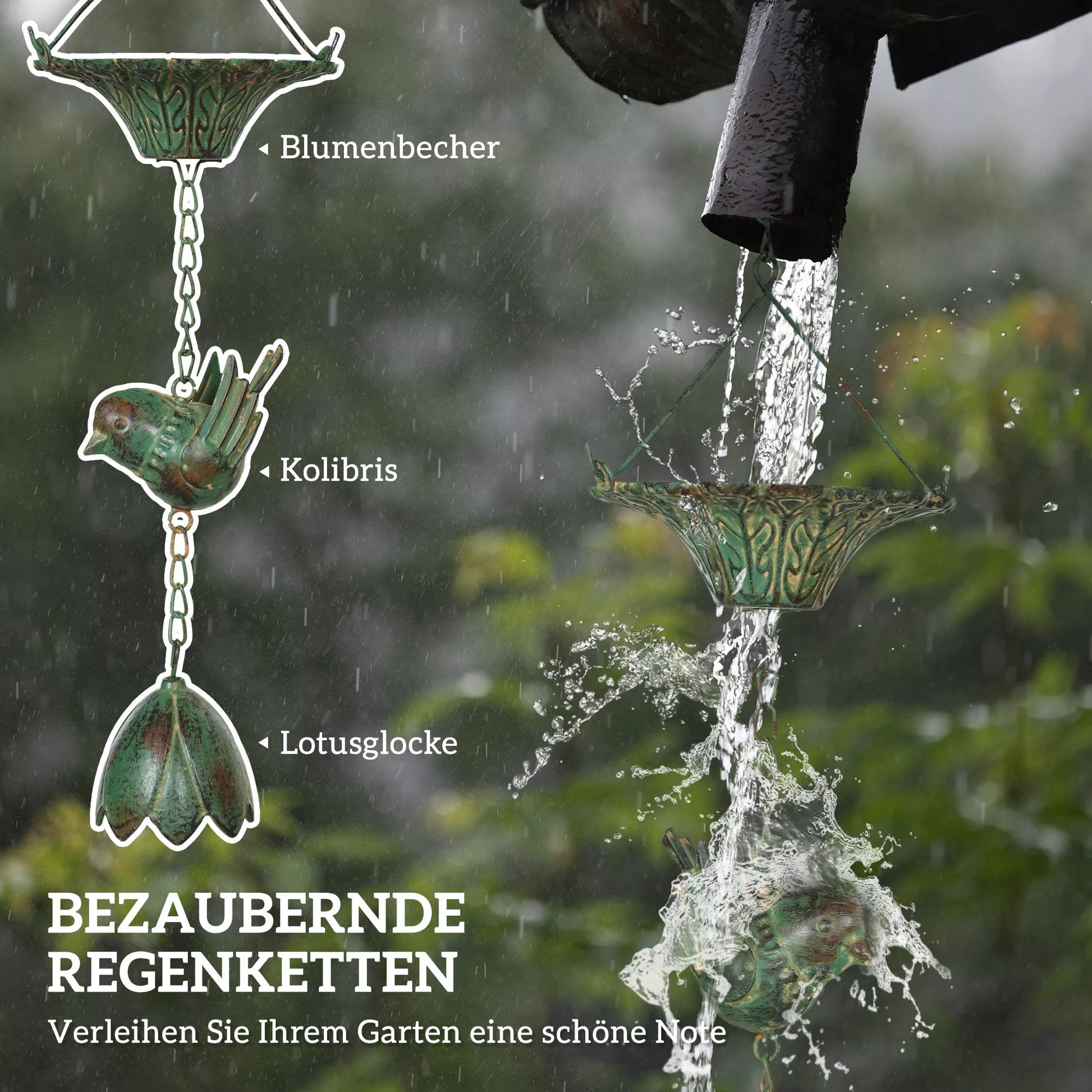 Pagražinkite savo sodą su mūsų trijų lietaus grandinėlių rinkiniu, papuoštu kolibrio, žiedų ir lotoso varpo motyvais. Pagamintos iš korozijai atsparaus metalo, šios lietaus grandinėlės elegantiškai sugauna ir nukreipia lietaus vandenį, suteikdamos jūsų lauko erdvei harmoningo garso. Lengvai sumontuojamos, su lotoso varpu jos suteikia žavingą papildymą jūsų latakams.