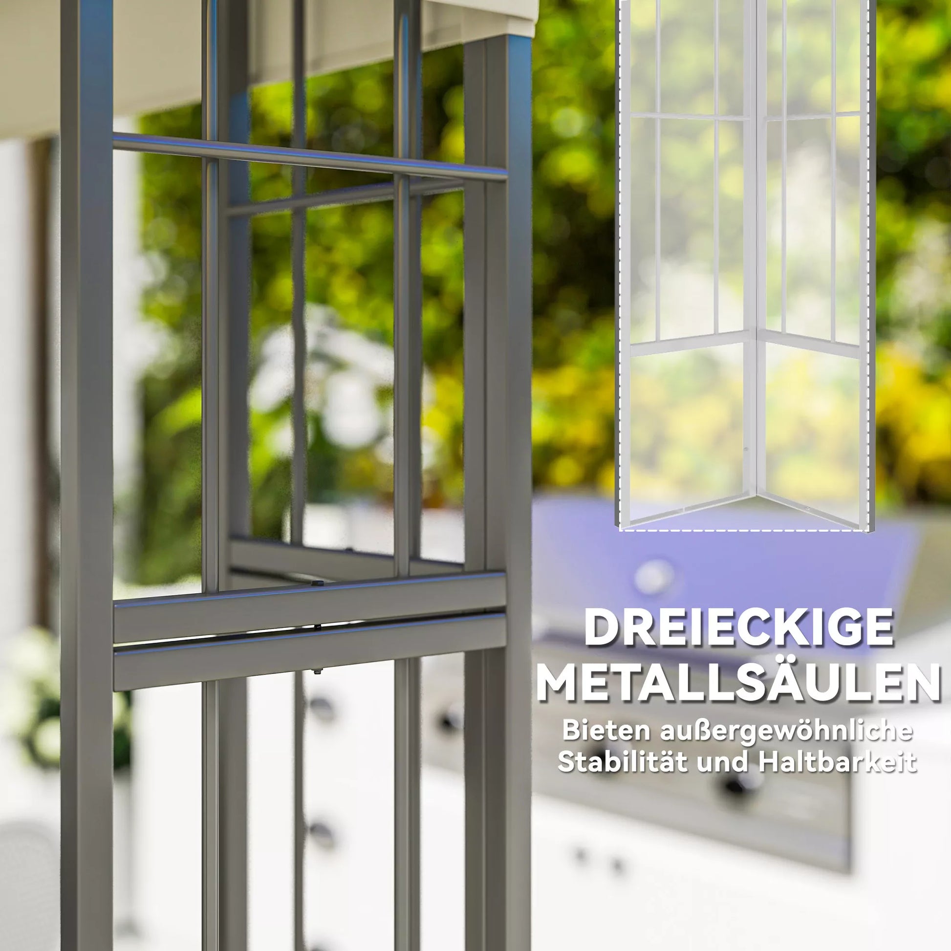 Stabilios, milteliniu būdu dengtos metalinės sodo pavėsinės kolonos užtikrina puikią apsaugą nuo oro sąlygų, o elegantiškas, dviejų pakopų pavėsinės stogas pagerina oro cirkuliaciją. Plastiku dengtas pavėsinės stogas sulaiko 97 % UV spindulių ir suteikia maloniai vėsią apsaugą nuo saulės šilčomis vasaros dienomis.