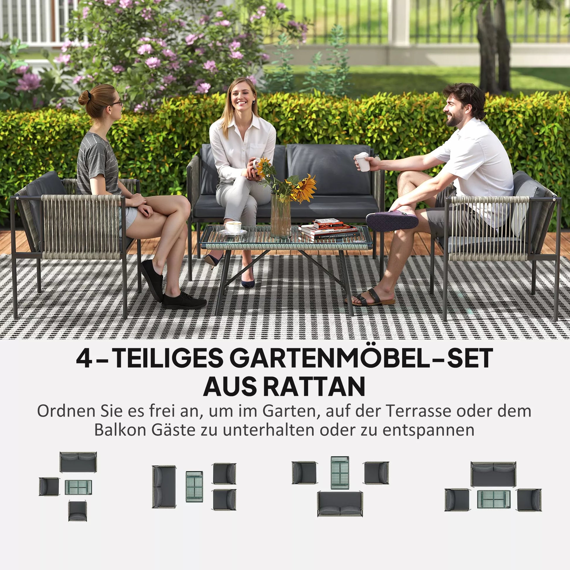 4 dalių lauko baldų komplektas, 1 sofa, 2 foteliai, 1 stalas su stikliniu stalviršiu, pagalvėlės, plieninis rėmas, plastiko rotangas, pilkas