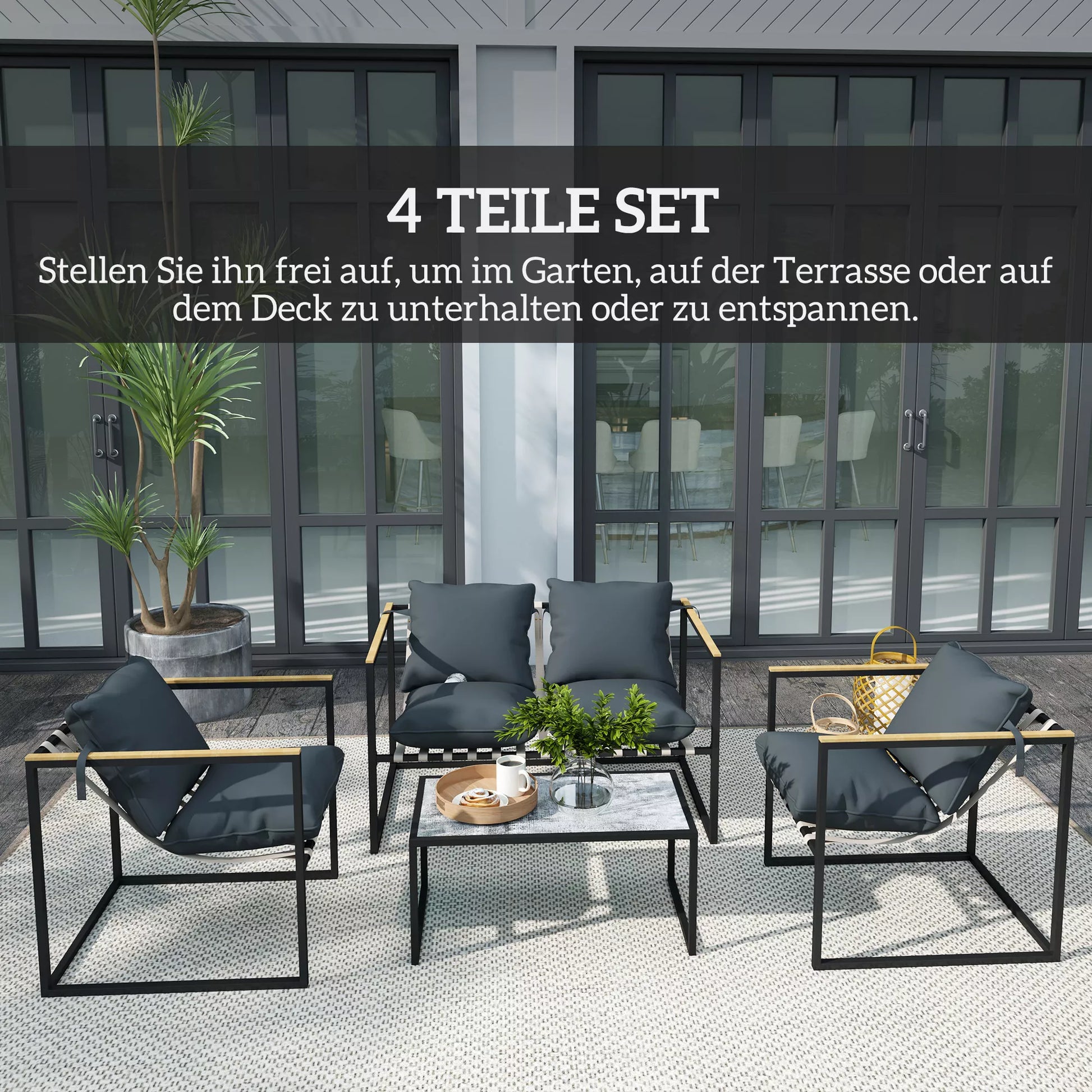 - ✔ Keturių dalių balkono baldų komplektas: apima suolą, du fotelius ir kavos staliuką
