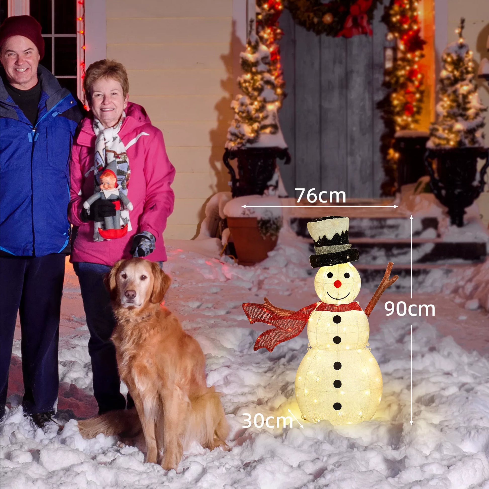 Pajuskite magišką žiemos pasakų pojūtį savo namuose su LED sniego seniu. Šis kalėdinis apšvietimas turi juodą cilindrą, raudoną šalikėlį, morkos nosį ir šakelių rankas – viskas kruopščiai ir detaliai sukurta. Su 78 LED lemputėmis, kurios šviečia tamsoje. Kalėdinė dekoracija pristatoma su 4 kuoliukais ir 6 kabelių jungtimis saugiam pritvirtinimui.