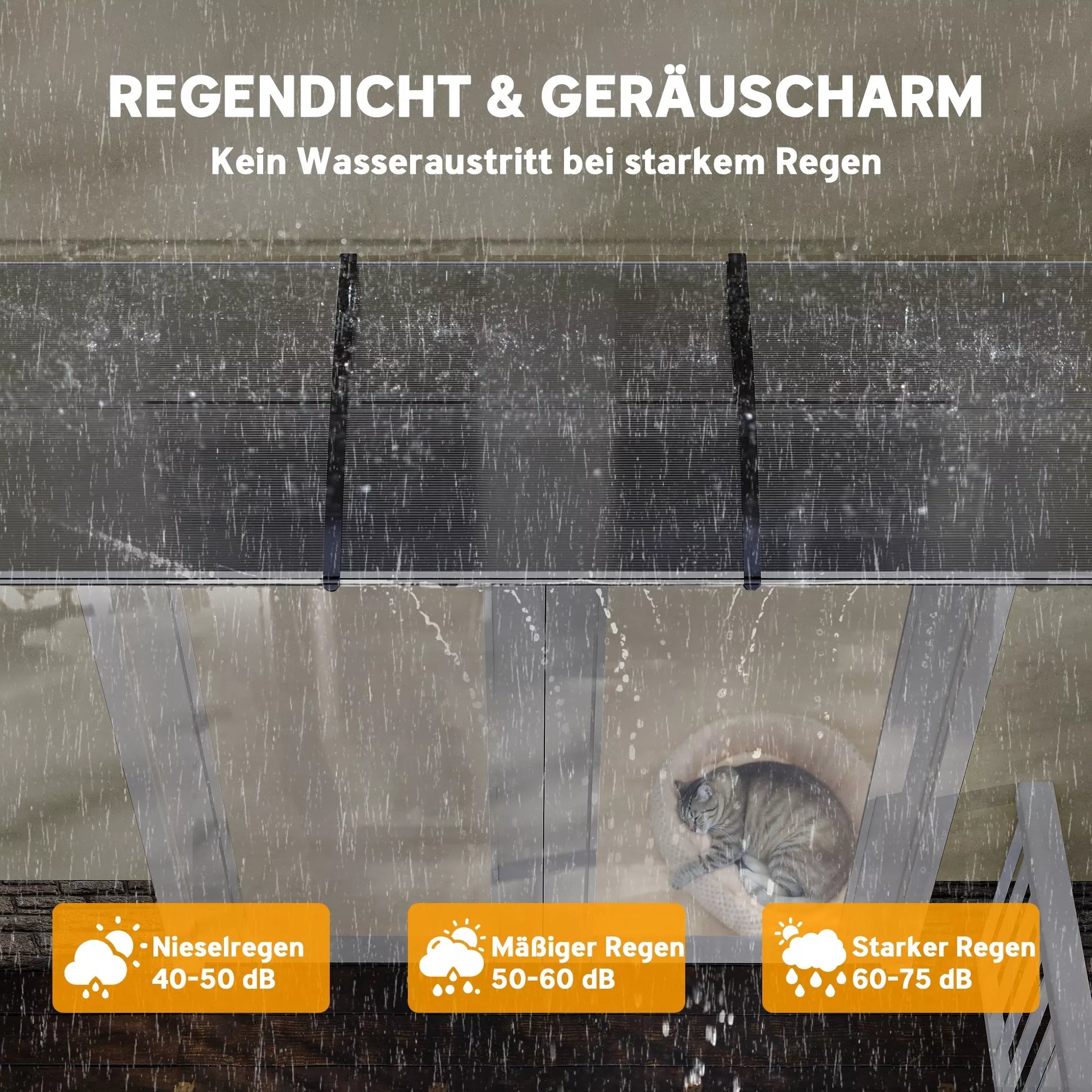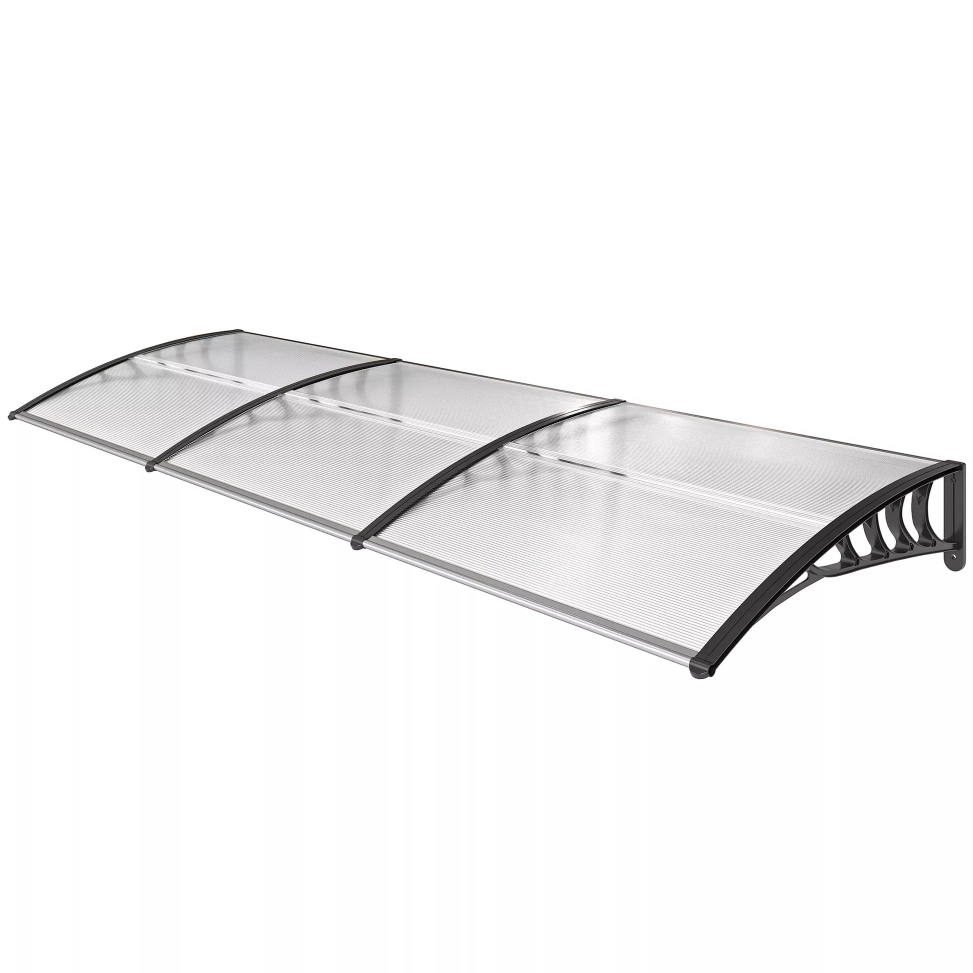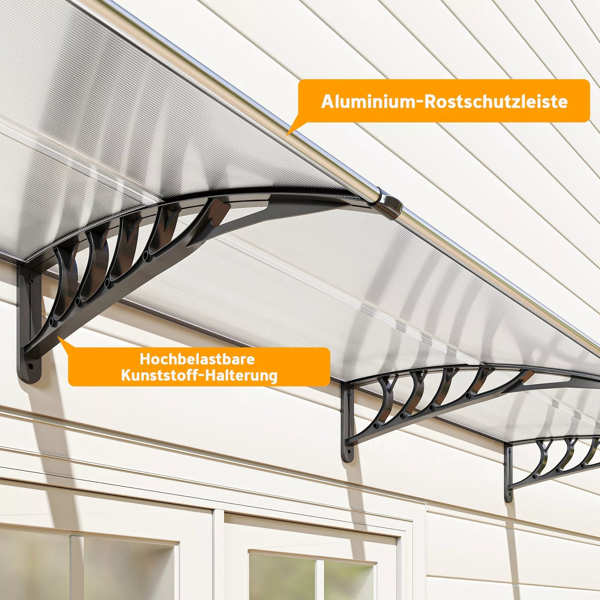 Išlenktas dizainas suteikia geresnę apsaugą. Stogelio galuose yra du tvirti plastikiniai laikikliai, skirti tvirtinti prie sienos, o lengvi aliuminio strypai sujungia galus su polikarbonato plokštėmis, kad be vargo apsaugotų jus nuo stichijų. Viršuje yra UV danga, kuri blokuoja kenksmingus UV spindulius ir padeda išvengti per didelio namų įkaitimo, kai šviečia saulė.