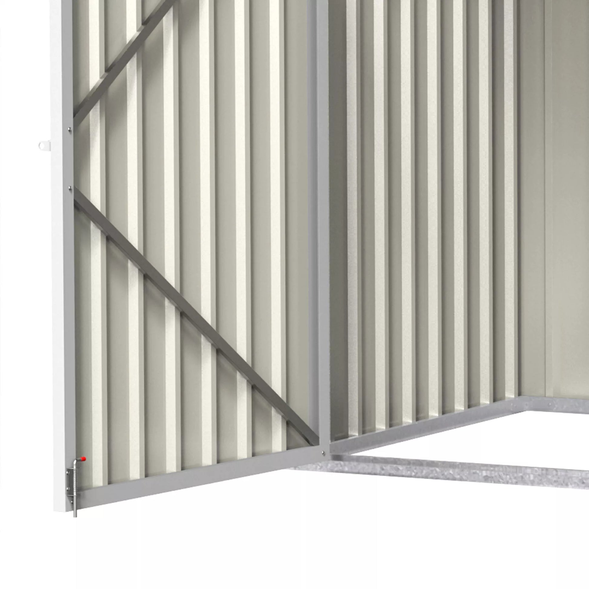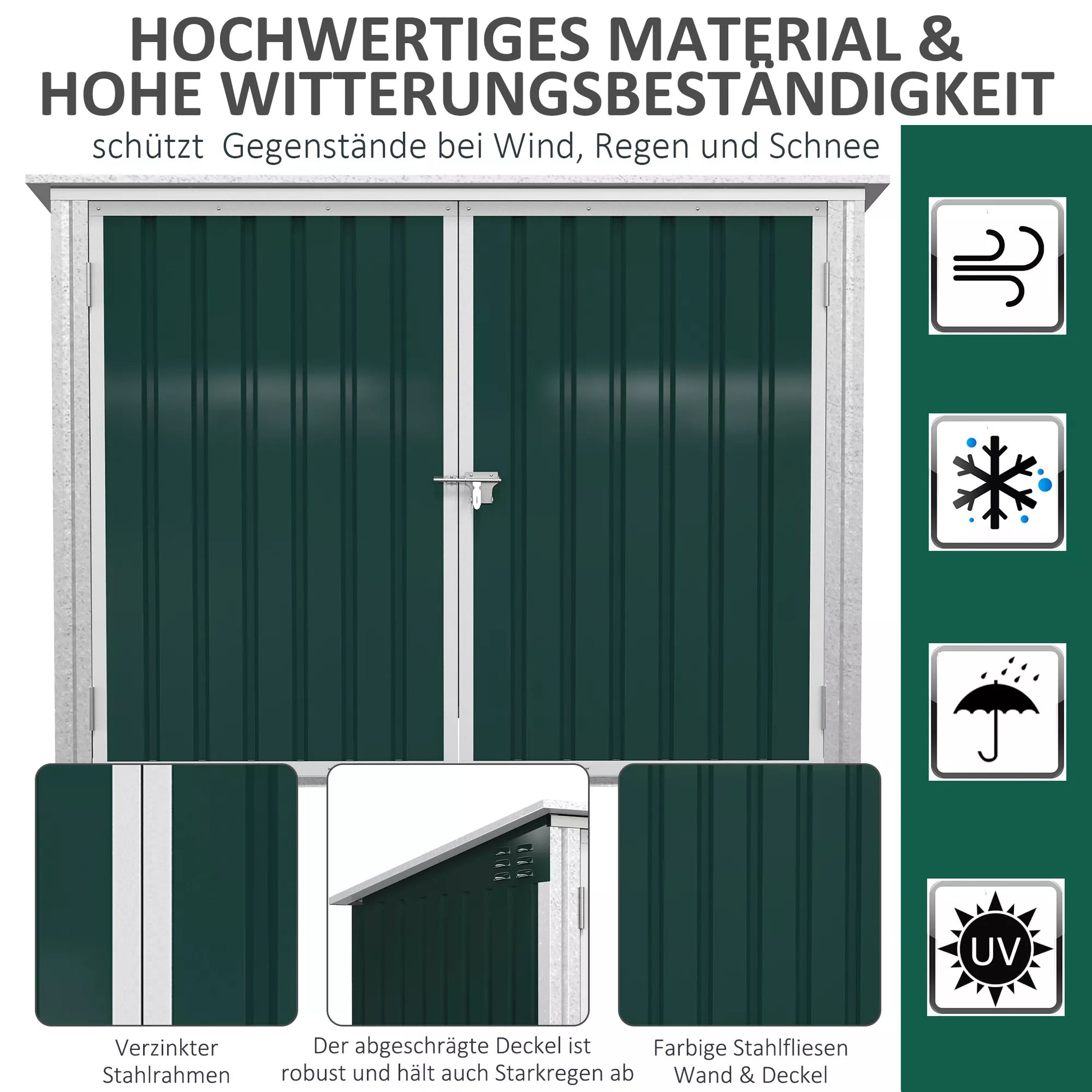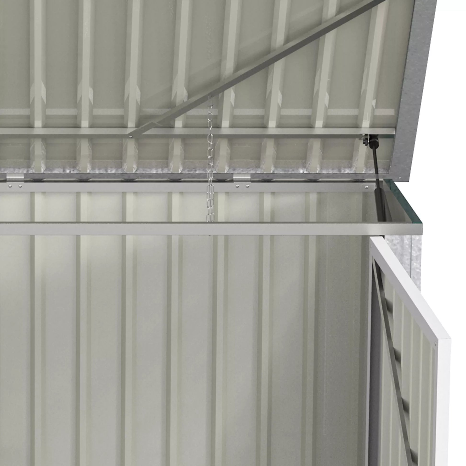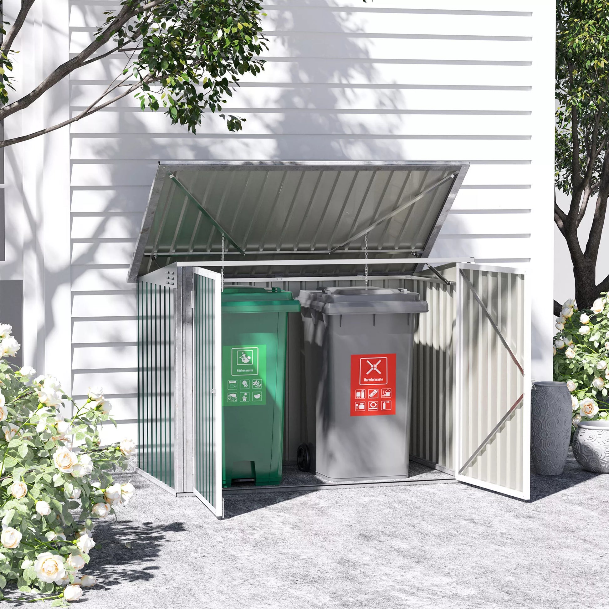 Su šiuo universaliu metaliniu sandėliuku galėsite veiksmingai apsaugoti savo šiukšlių dėžes nuo vėjo arba nepageidaujamų gyvūnų. Užrakinamos dvigubos durys ir pneumatinis stogo atidarymas leidžia patogiai naudotis, todėl šiukšlių dėžes galėsite lengvai įdėti ir išimti. Be to, šoninės ventiliacijos angos užtikrina oro cirkuliaciją ir padeda išvengti nemalonių kvapų.