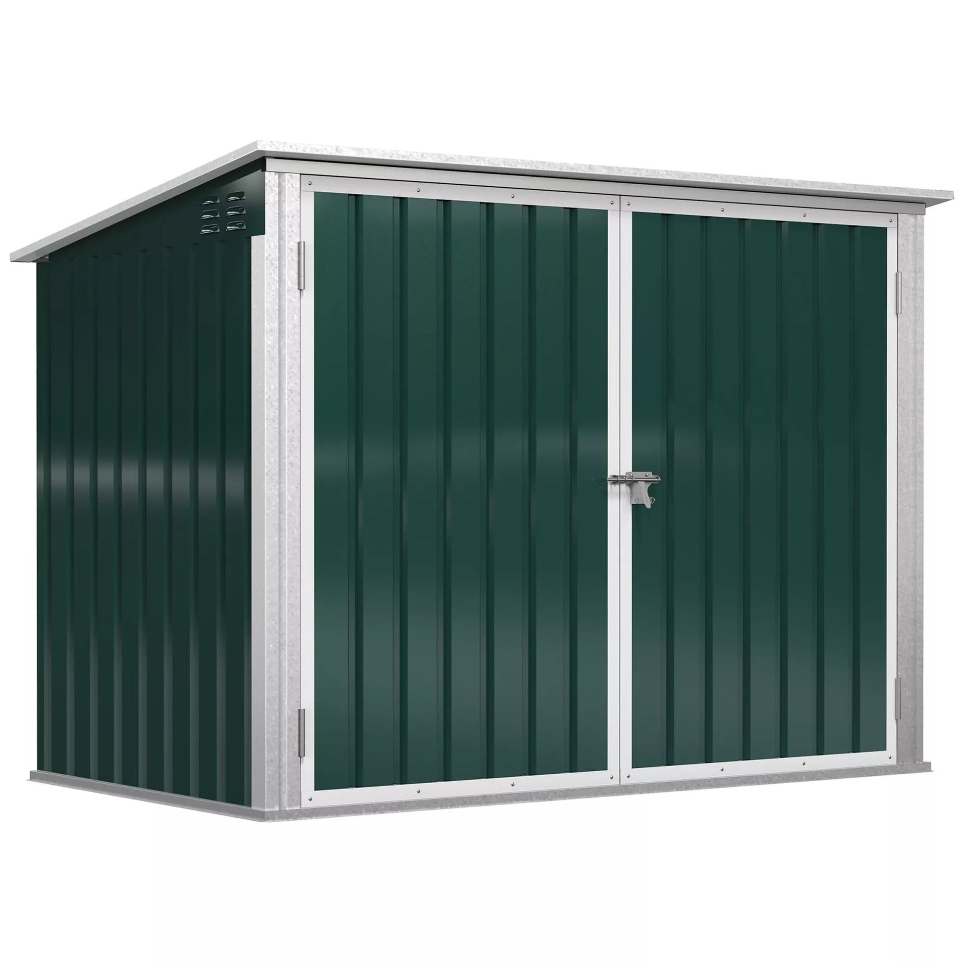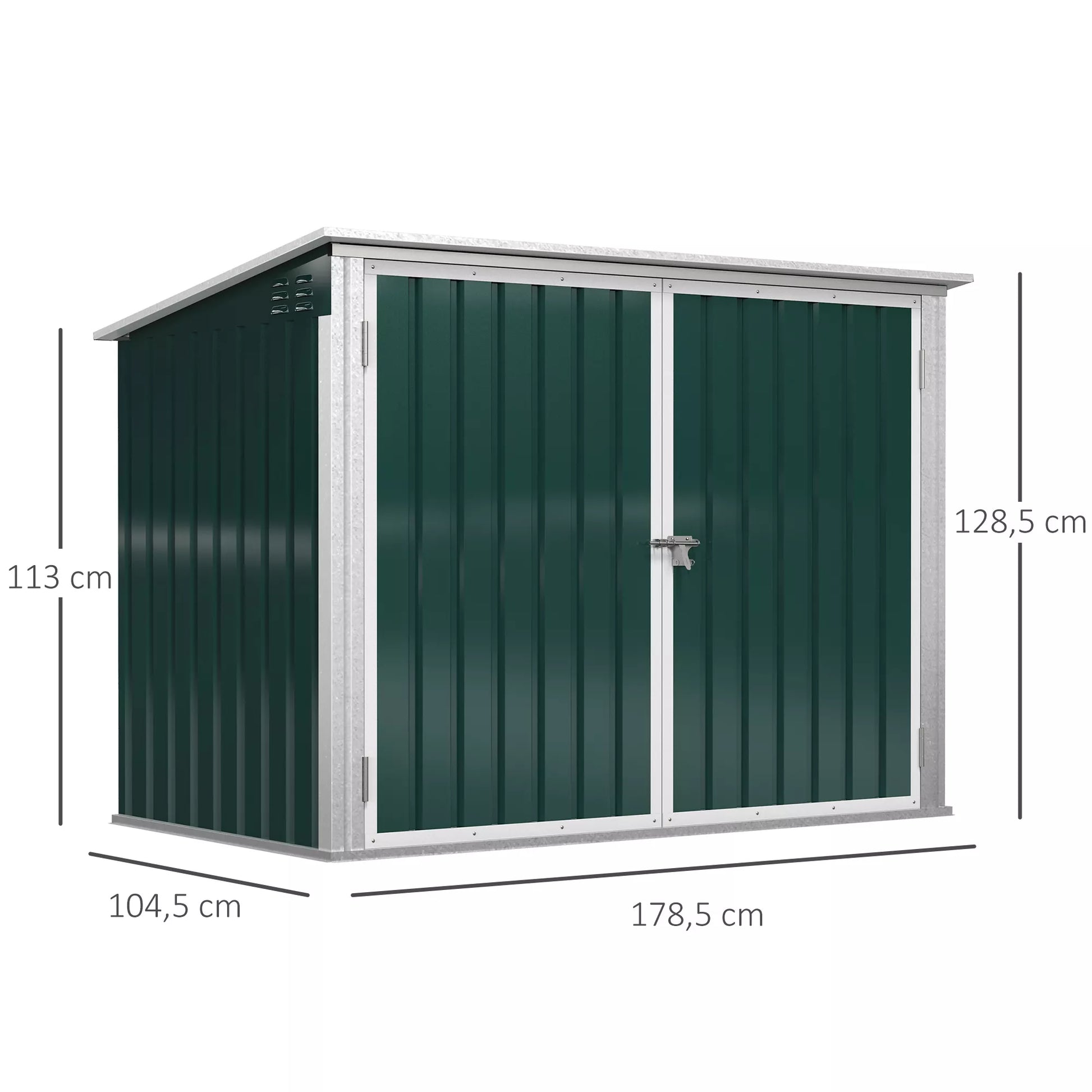 Lauko šiukšliadėžių dėžė Storer, užrakinama laikymo dėžė 2 šiukšliadėžėms, plieninė, 178,5 x 104,5 x 128,5/113 cm, žalia