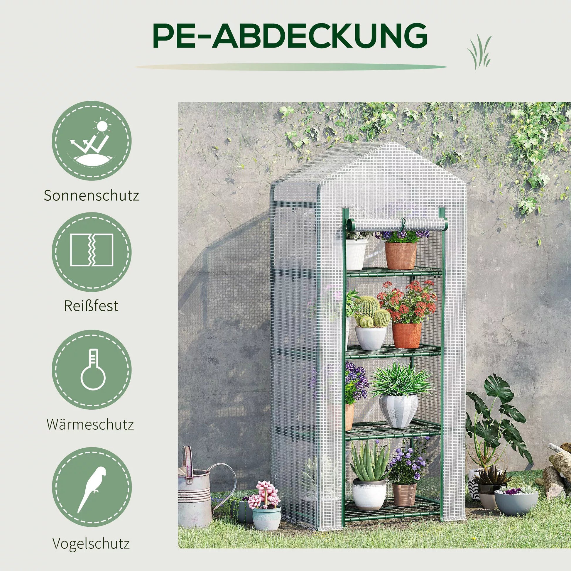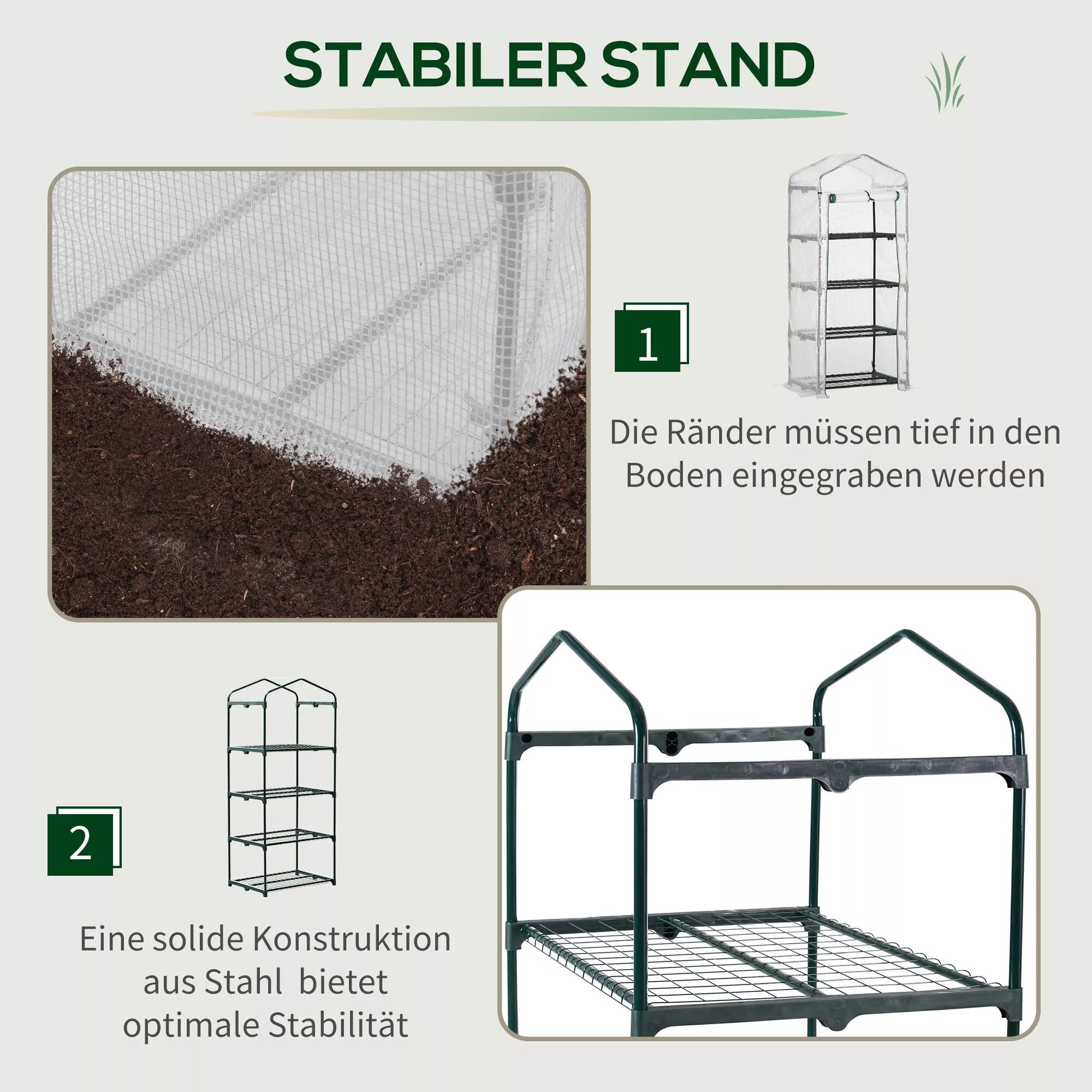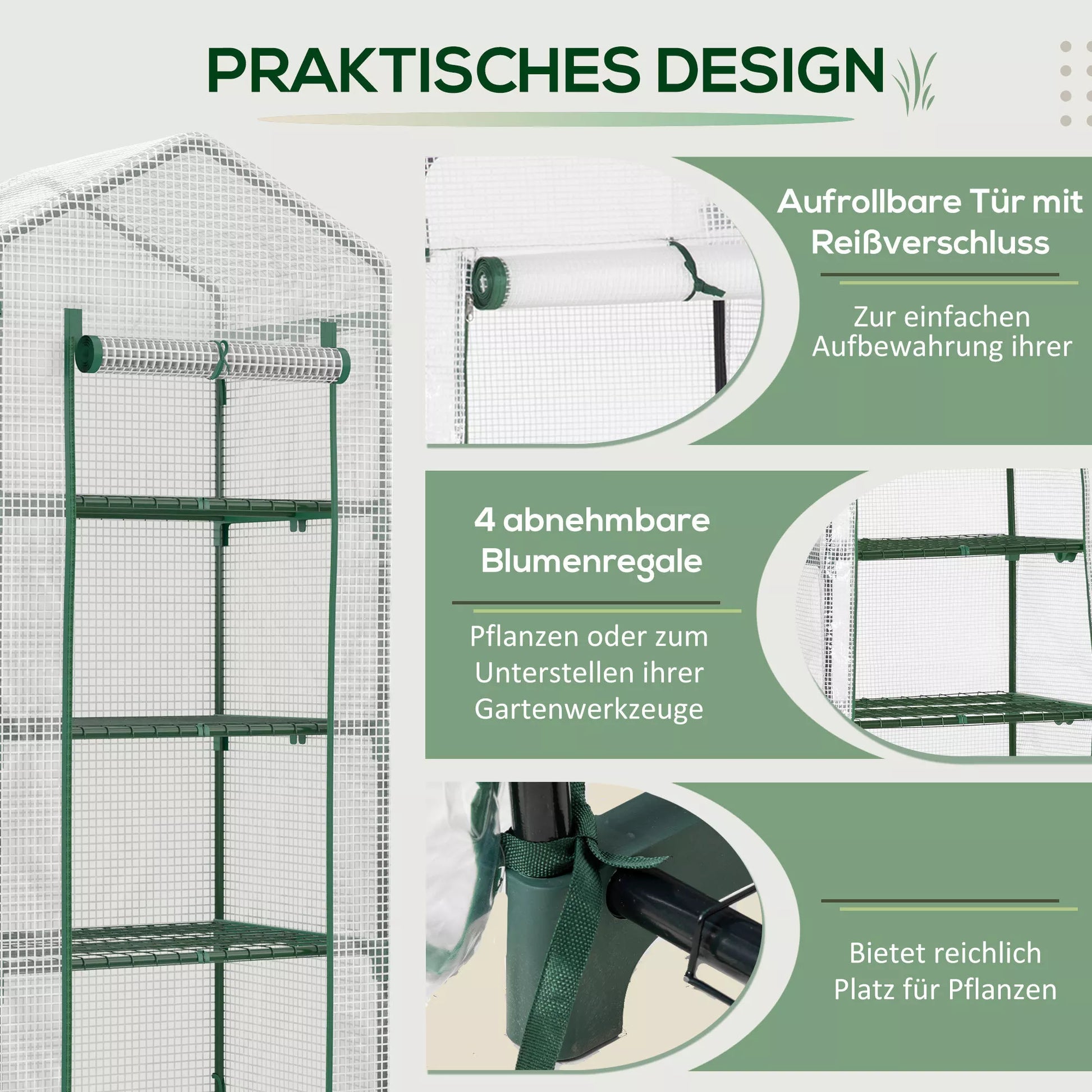 Pasitikite naujus sodininkystės metus užtikrintai: Kompaktiško dydžio mini šiltnamis suteikia daug vietos. Jūsų augalai ras saugią erdvę keturių lentynų šiltnamio augalų lentynose (kiekvienos lentynos aukštis 34 cm, kiekvieną galima apkrauti ne daugiau kaip 15 kg). Šiltnamio pagrindas ir rėmas pagaminti iš milteliniu būdu dengto plieno vamzdžio, todėl yra atsparūs oro sąlygoms ir stabilūs.