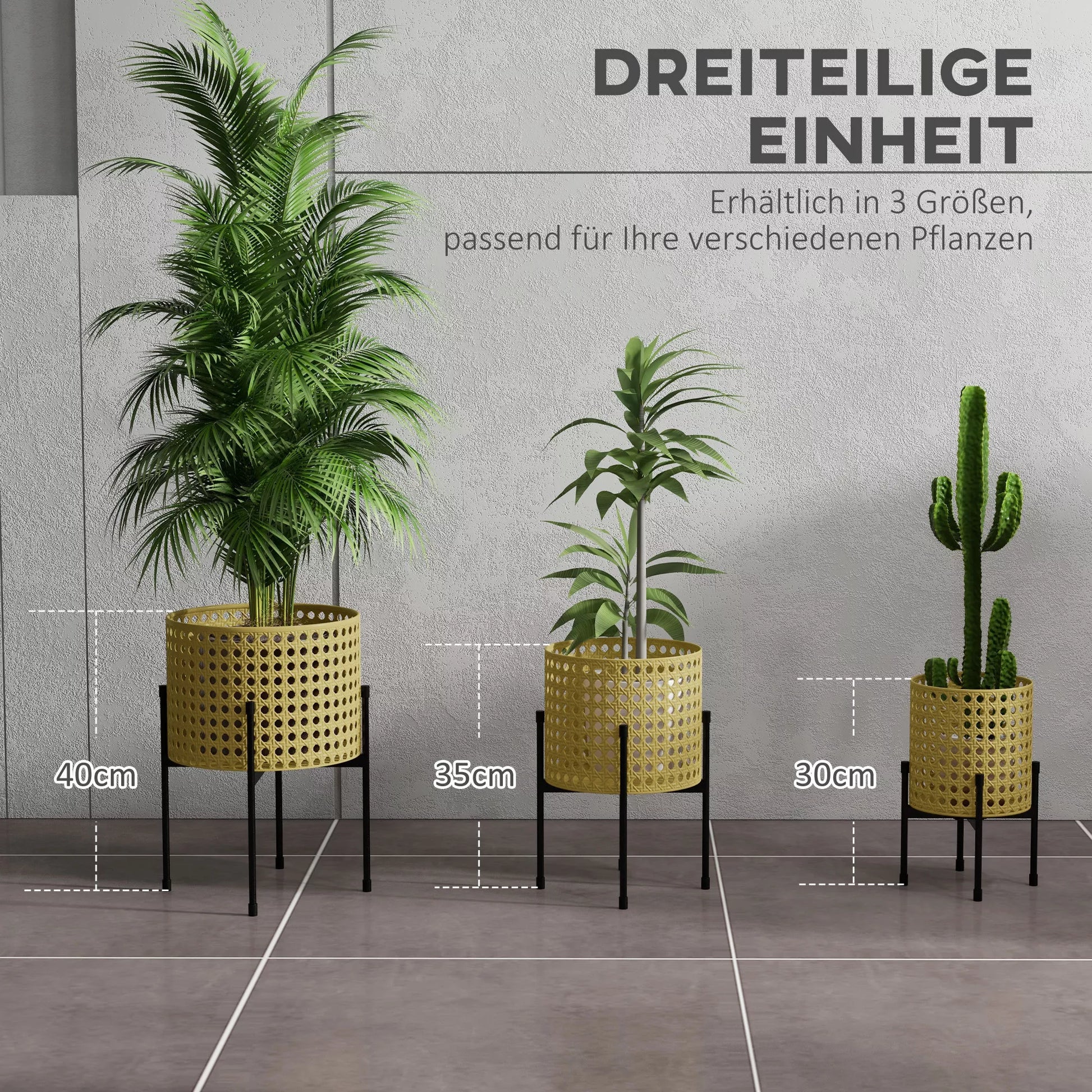 - ✔ 3 gėlių stovų rinkinys, trijų skirtingų dydžių, leidžiantis įvairiapusiškai eksponuoti jūsų augalus