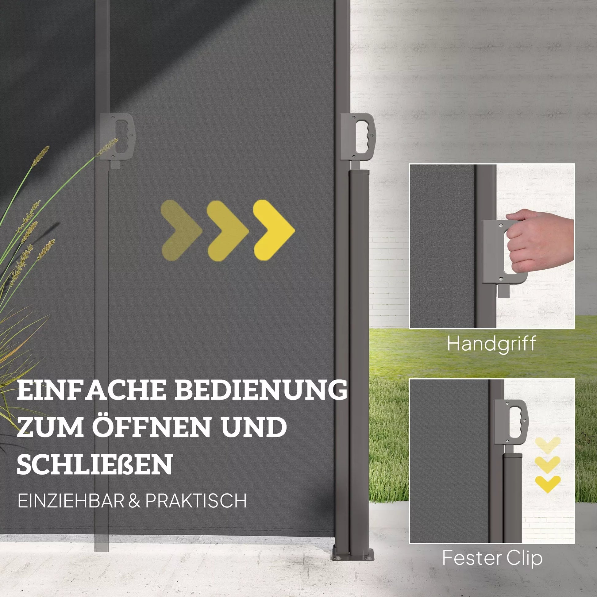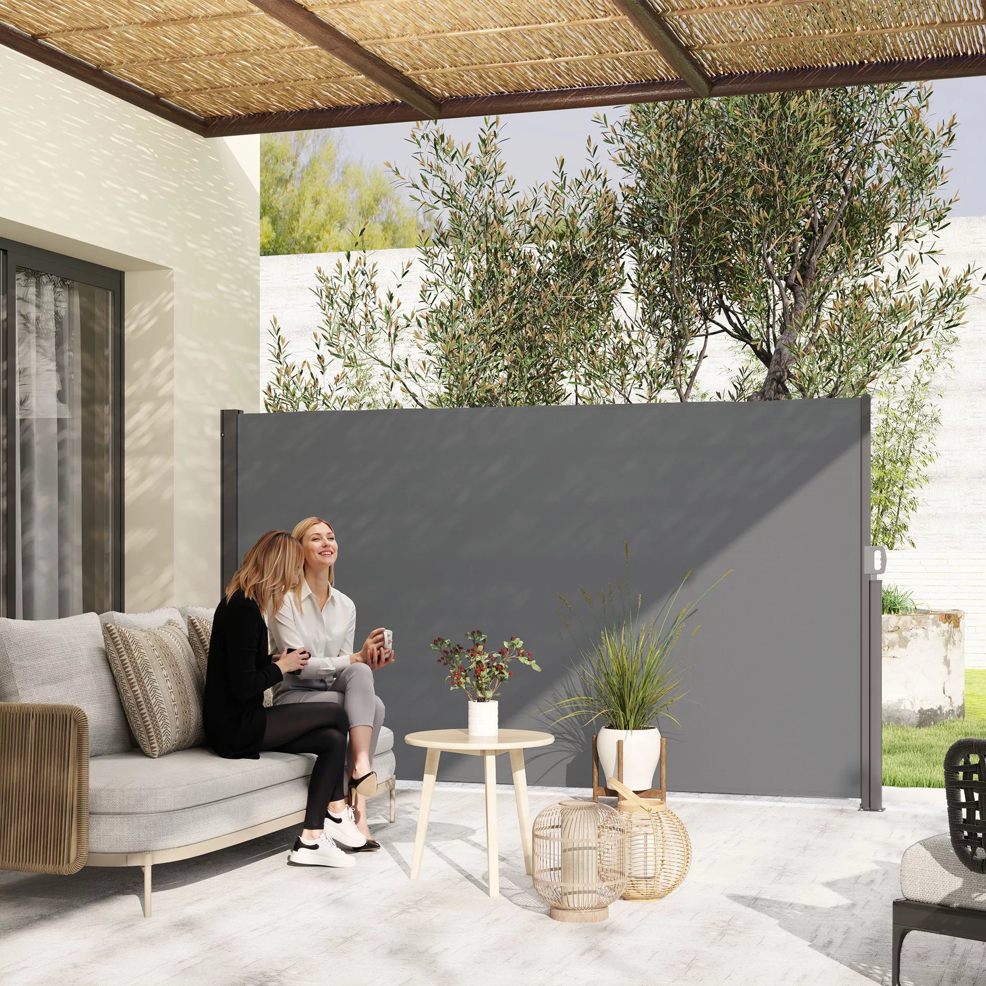 Patirkite universalias lauko erdves su [BRAND NAME] ištraukiama šonine markize. Ištraukiamas apsauginis nuo saulės ir vėjo gaubtas iš 180 g/m² didelio tankio poliesterio apsaugo nuo UV spindulių ir drėgmės. tvirtas aliuminio rėmas atlaiko bet kokį orą. Puikiai tinkantis kaip privatumo ekranas ar erdvės daliklis, šis terasos vėjo skydas sklandžiai įsilieja į balkoną ar terasą, derinant stilių ir praktiškumą.