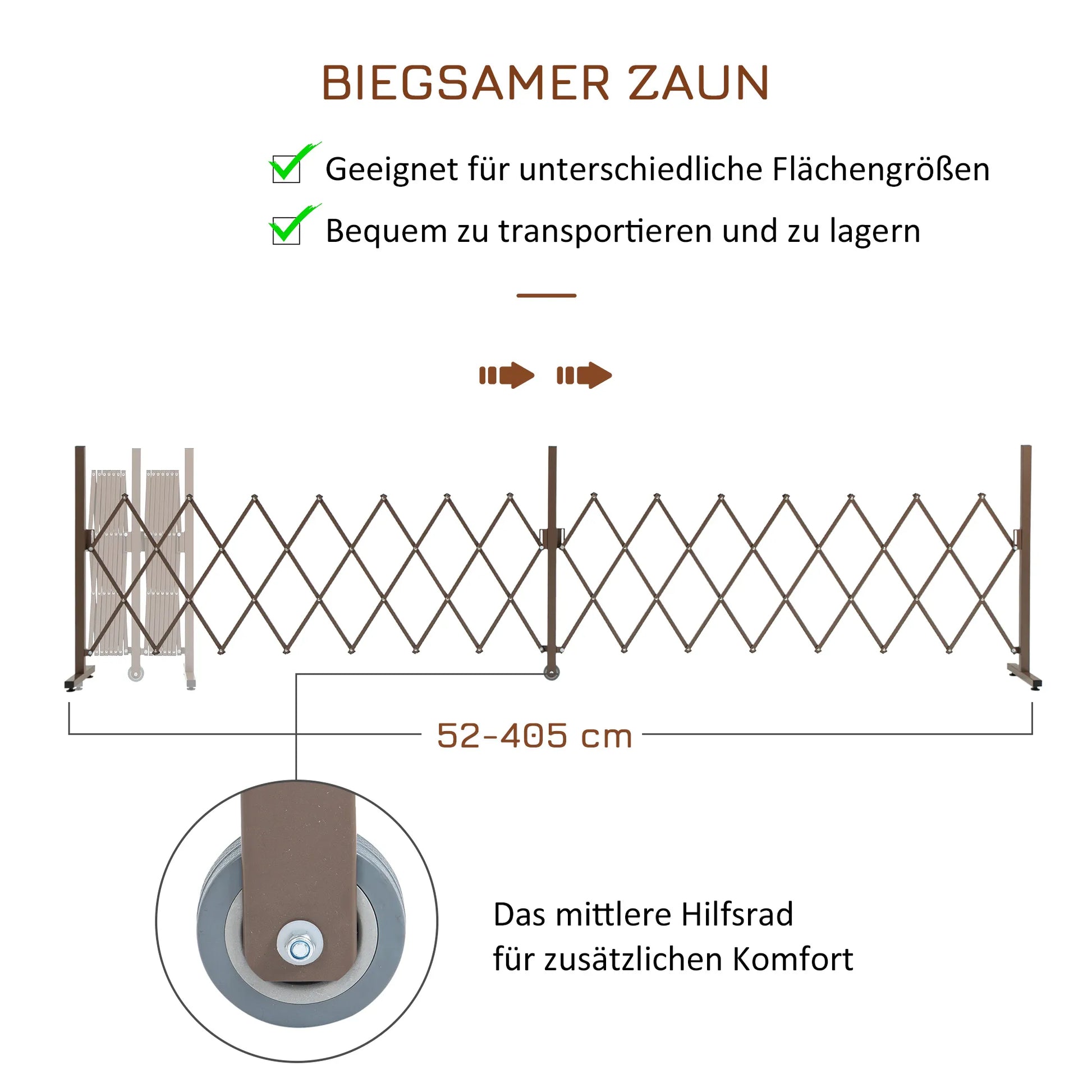 Ištraukiama tvora, barjeras, sulankstoma, 52-405cm, skirta sodui, aliuminio, rudos spalvos, aukštis 103,5cm