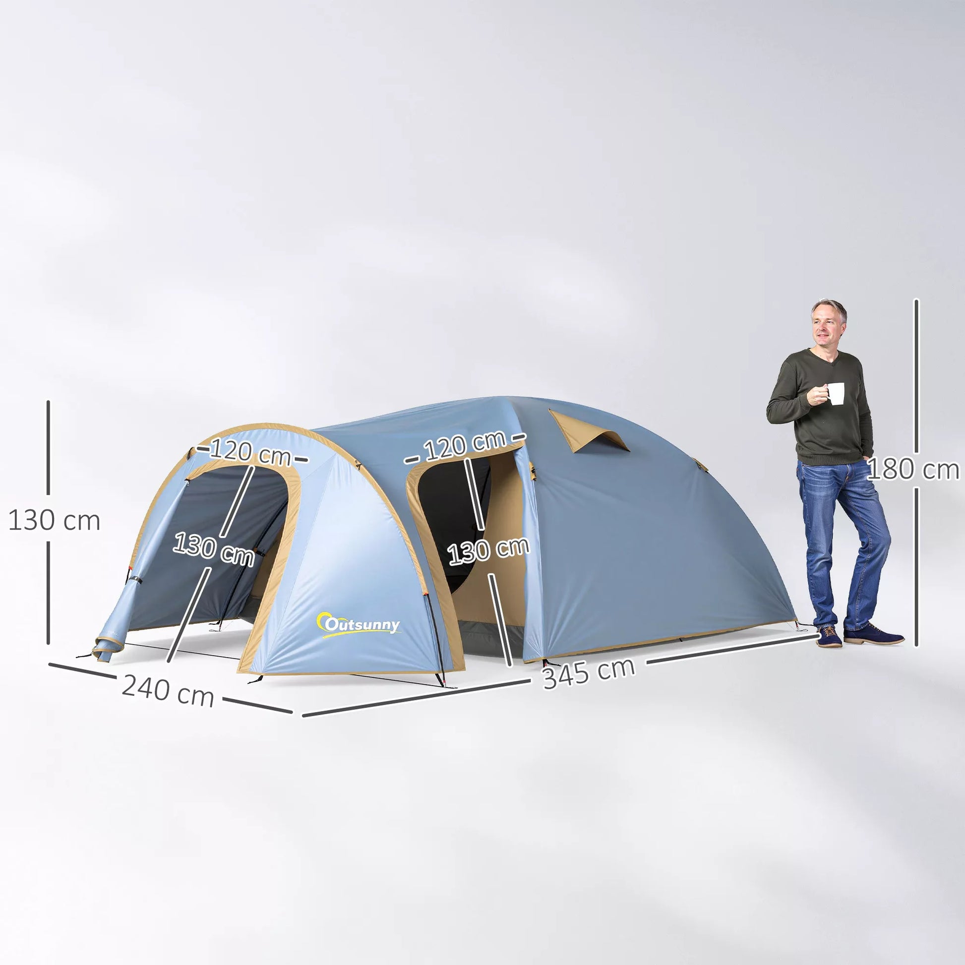 Kempingo palapinė 4 asmenims, vandeniui atspari tunelinė palapinė su 2 durimis, kabliais, bagažine 3,45 x 2,4 x 1,3 m, šviesiai mėlyna