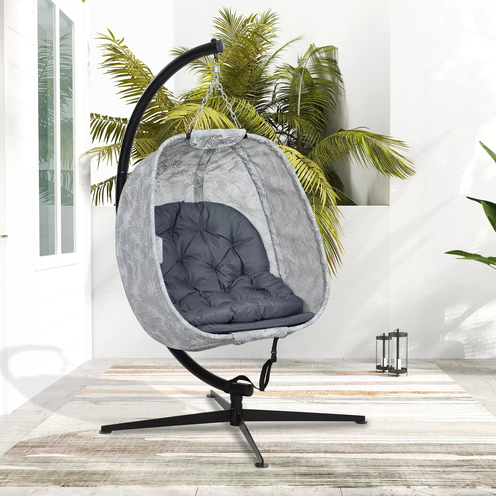 Mėgaukitės aukščiausiu komfortu lauko kiaušinio formos pakabinamoje kėdėje su stovu! Ši pakabinama kėdė su plačia sėdyne, aptraukta „Texteline“ audiniu su subtiliu plunksnų raštu, suteikia kviečiančią, lizdą primenančią atmosferą. Sulankstoma konstrukcija ir puodelių laikiklis daro ją praktišką, o 13 cm storio pagalvėlė ir papildoma grindų pagalvėlė garantuoja neprilygstamą sėdėjimo komfortą. Milteliais dengtas plieninis rėmas ir X formos pagrindas užtikrina stabilų siūbavimąsi. Reguliuojamos grandinėlės leidžia individualiai reguliuoti siūbavimo intensyvumą.
