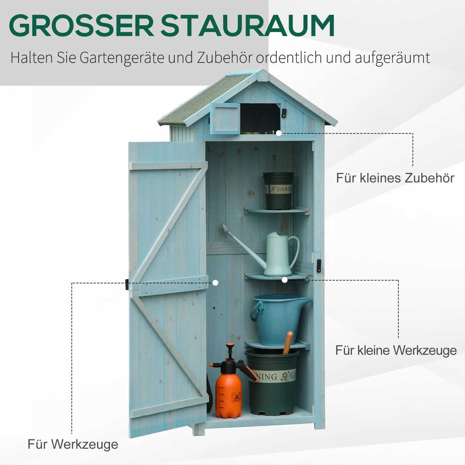 Medinė sodo spinta, lauko sandėliukas atsparus oro sąlygoms 77x54,2x179cm, įrankių namelis su durimis, šlaitiniu stogu, spinta įrankiams su lentynomis, sodui, terasai, šviesiai mėlyna+žalia