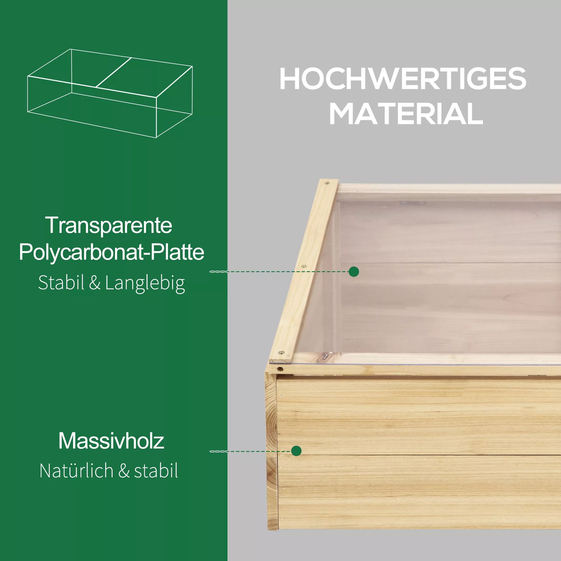 Ši išskirtinė medinė šiltnamio konstrukcija padeda jūsų augalams augti ir klestėti. Aukštos kokybės masyvmedžio rėmas sudaro patikimą mažą šiltnamį. Skaidrios polikarbonato plokštės leidžia maksimaliai praleisti šviesą ir tuo pačiu metu sulaiko šilumą ankstyvam sėklų dygimui arba augalų apsaugai vėlyvuoju sezonu. Ši auginimo dėžė suteikia idealią temperatūrą, kad augalai galėtų mėgautis saulės šviesa ir sveikai augti.