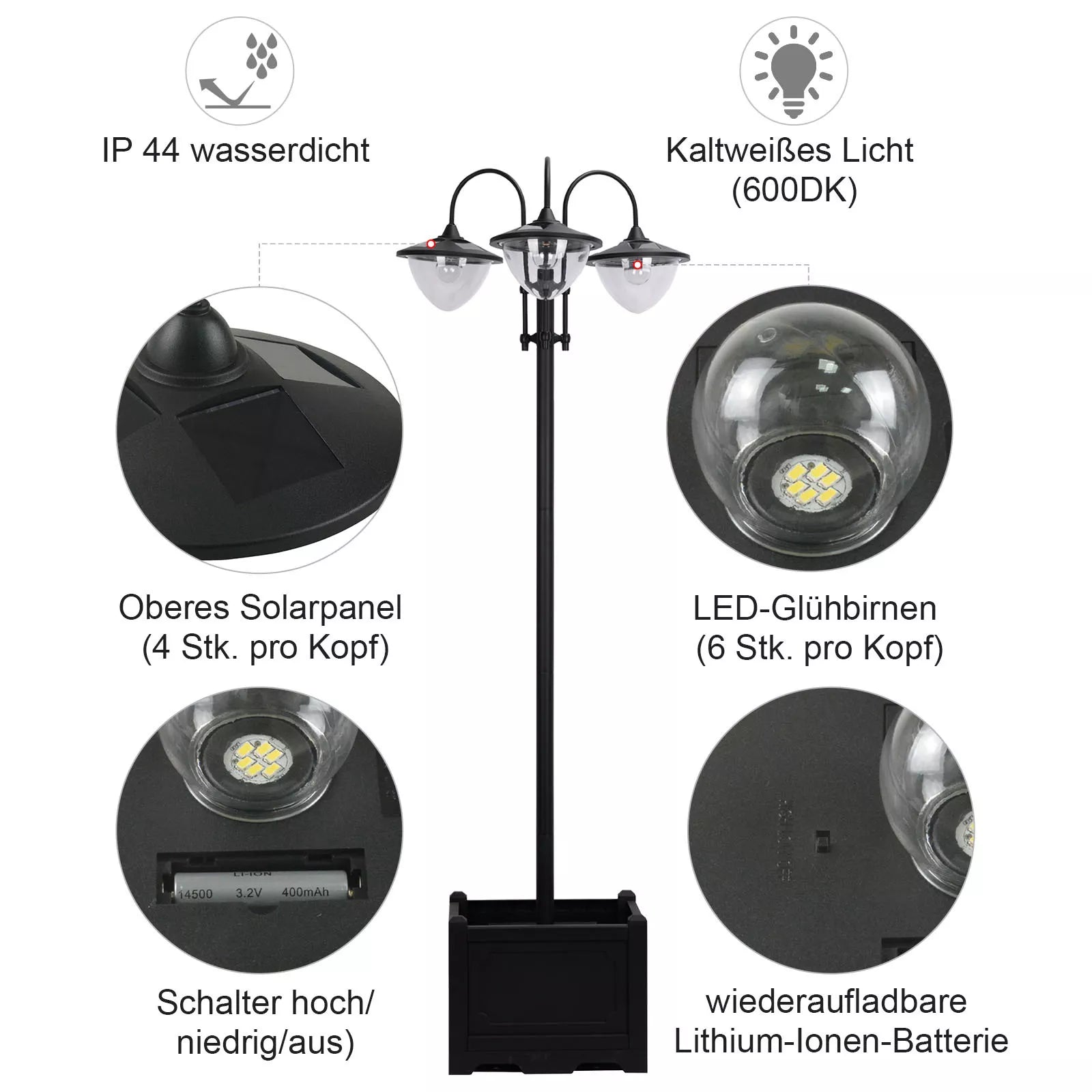 Saulės lauko šviestuvas iš metalo, 189 cm aukščio pastatomas šviestuvas, sodo žibintas su šviesos valdymu, lauko žibintas su puodo pagrindu, atsparus vandeniui IP44, skirtas sodui, balkonui, juodas