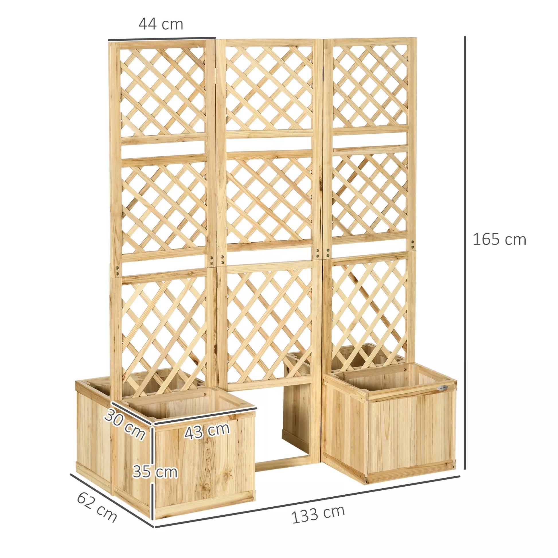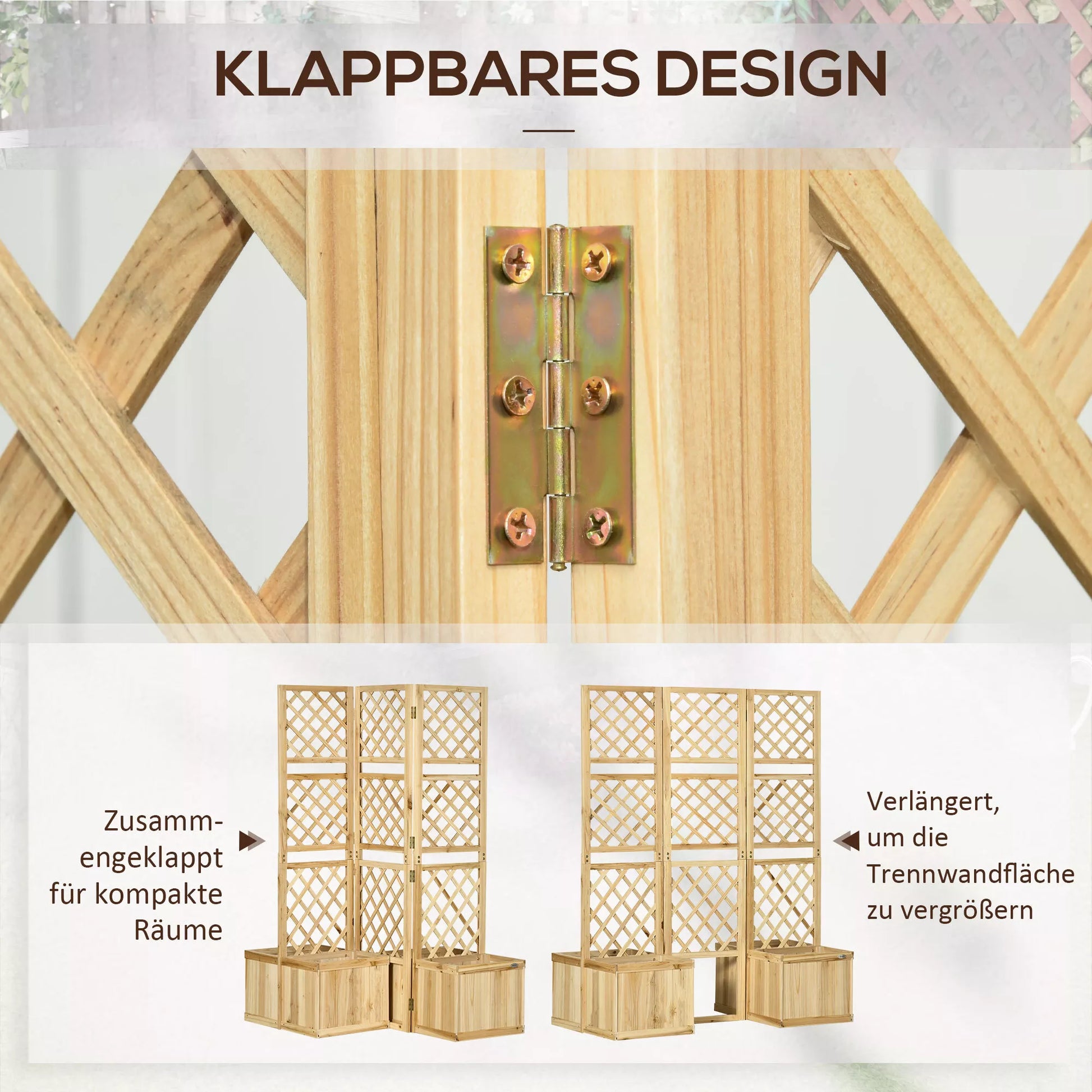Paravanas, sodo pertvara, tris kartus sulankstomas, 4 gėlių dėžės, masyvi mediena, natūrali spalva, 133 x 62 x 165 cm