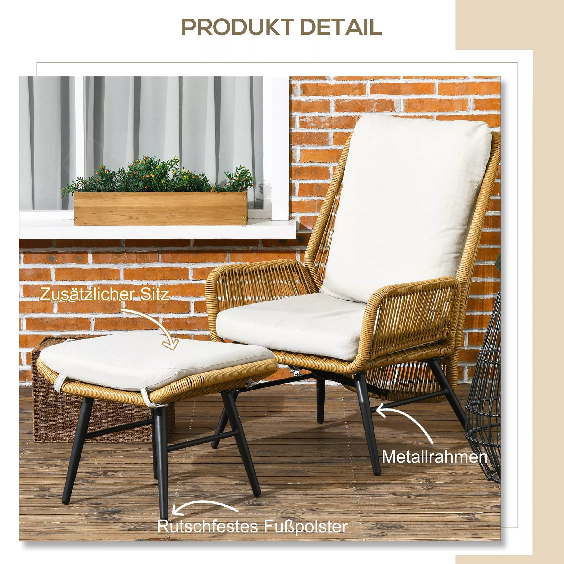 Atsipalaiduokite savo sode su mūsų patogiu poliratano baldų komplektu. Reguliuojamas atlošas gali būti atlenktas nuo 110° iki 140°, todėl akimirksniu rasite idealią sėdėjimo poziciją. Norite kėdę ir pufą naudoti nuolat lauke? Jokių problemų, medžiagos yra tvirtos ir atsparios oro sąlygoms. Neslystantys kojelės ir minkštos, skalbiamos pagalvėlės daro šį komplektą jaukų ir stilingą jūsų terasos priedą.