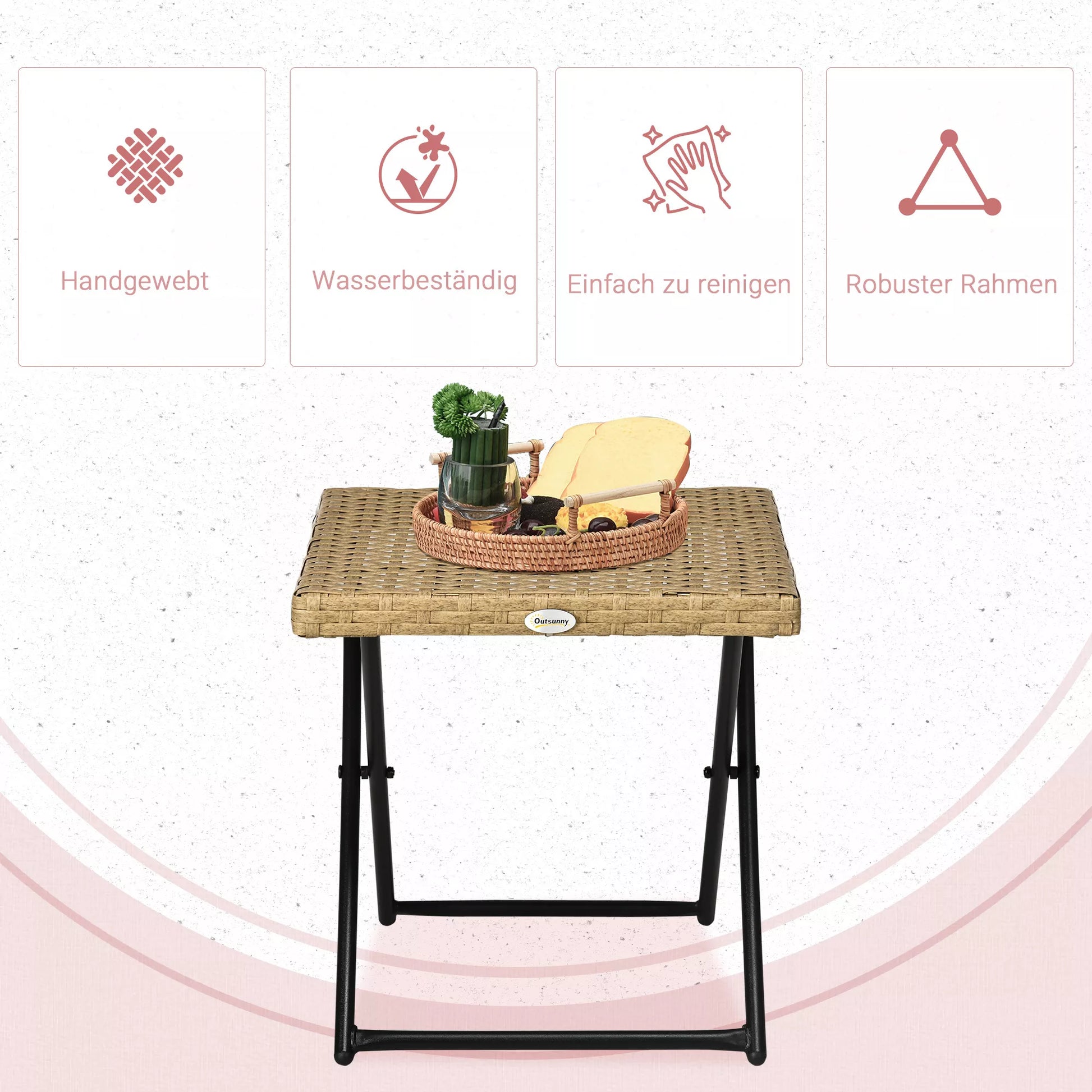 Praturtinkite savo sodo ir terasos aplinką šiuo moderniu sulankstomu stalu, pagamintu iš aukštos kokybės ratano imitacijos, ir ilsėdamiesi lauke visada laikykite mėgstamą knygą bei šildantį gėrimą po ranka. Tvirtas plieninis rėmas ir poliratano stalviršis yra lengvai valomi, todėl šis staliukas gali būti naudojamas ir kaip dekoratyvinis vazonų stovas. Dėl sulankstomų kojų sodo stalą patogu transportuoti ir sutaupyti vietos jį laikant.