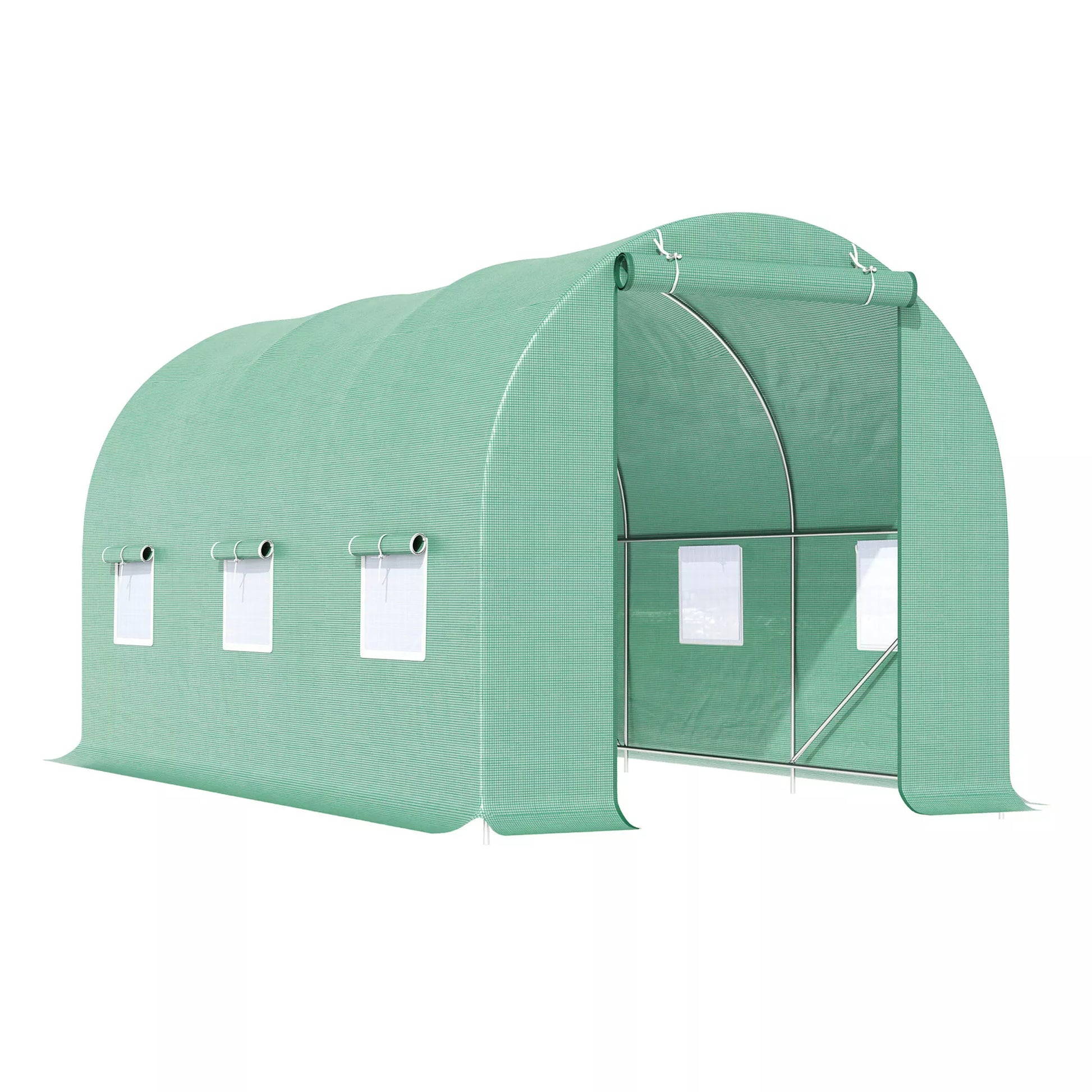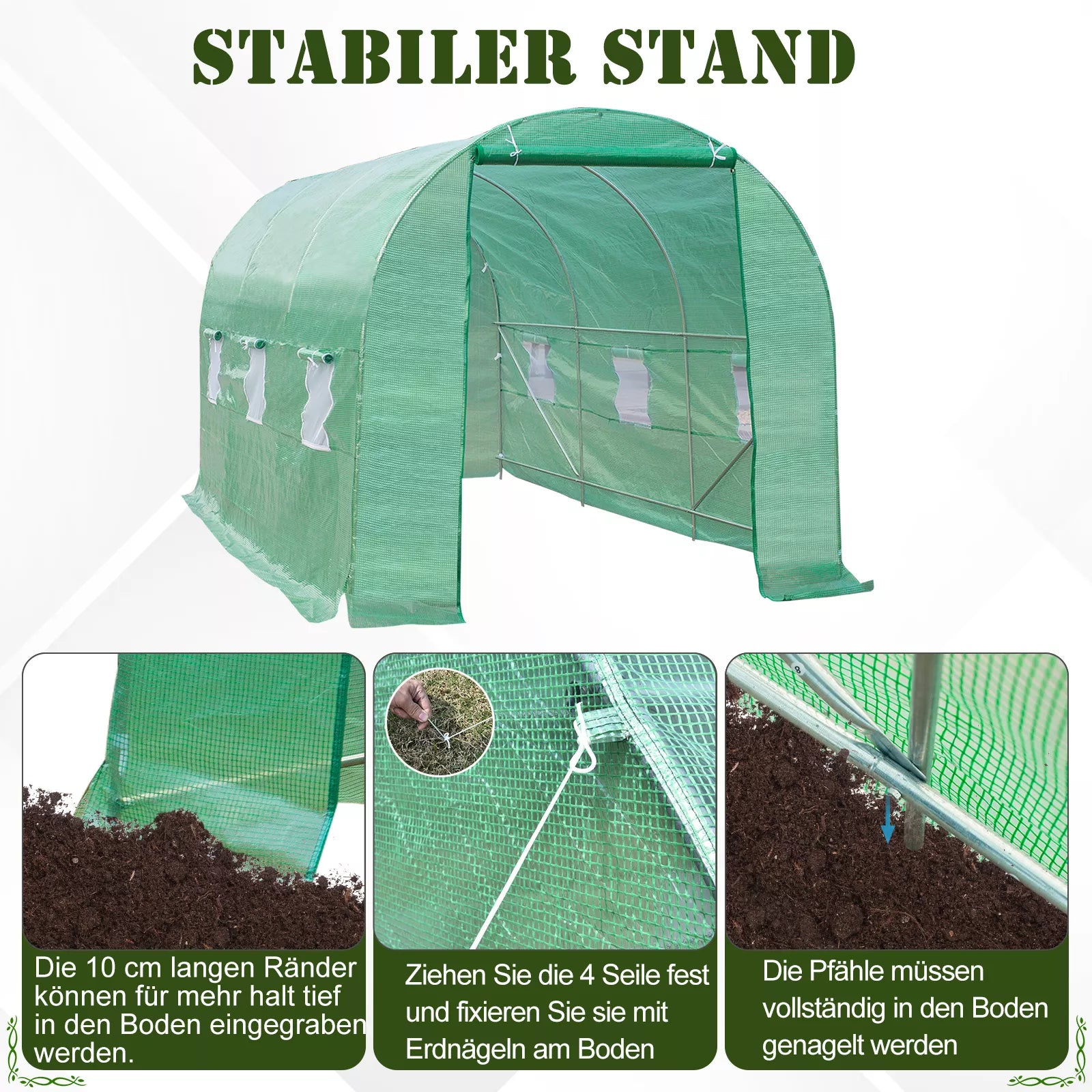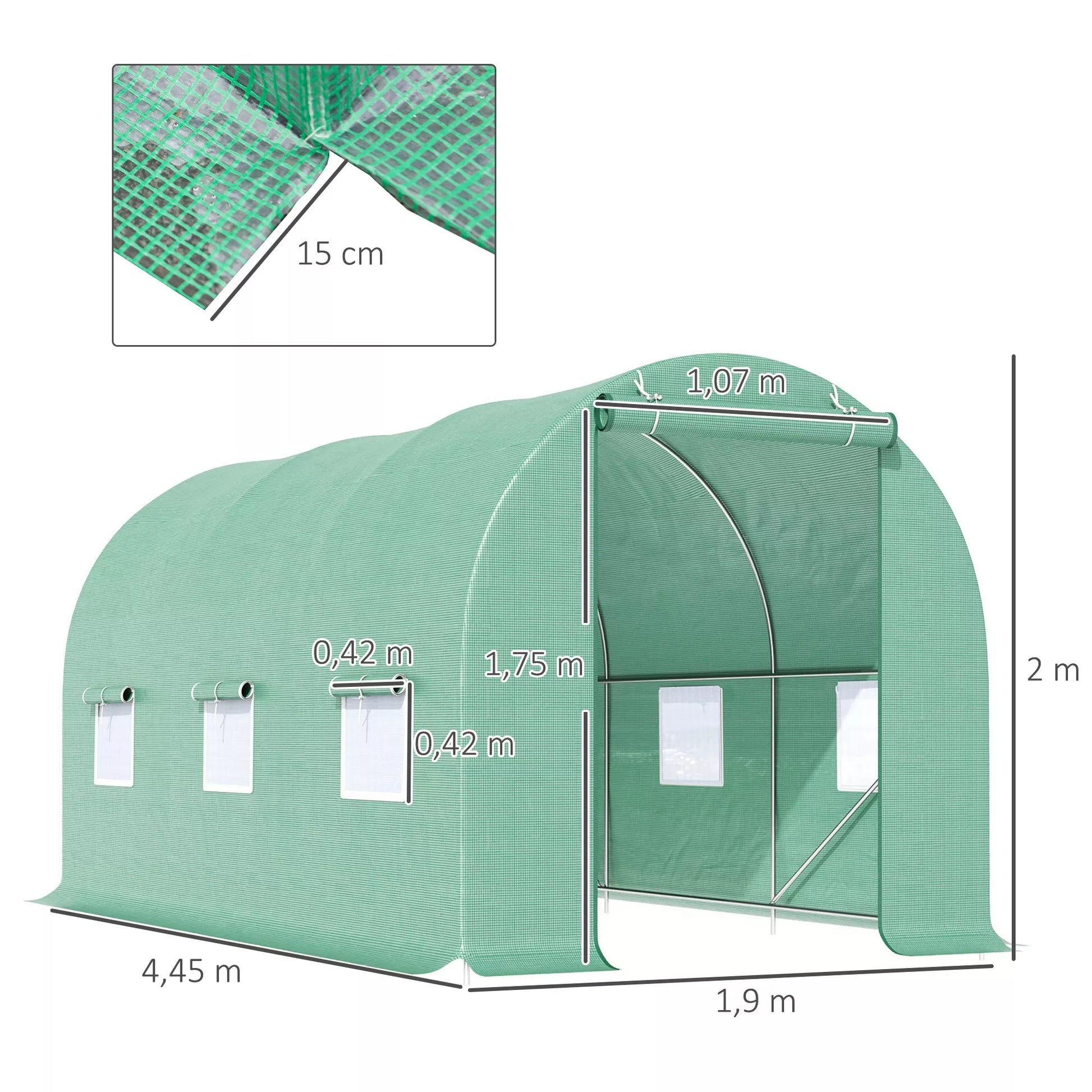 Šiltnamis 445x190x200cm Folijos šiltnamis Pomidorų namelis su durimis ir tinkleliu nuo uodų, langais, folijos tunelis iš cinkuoto plieno, tvirtas augalų tunelis, šiltnamis su įžeminimo inkarais ir virvėmis, žalias