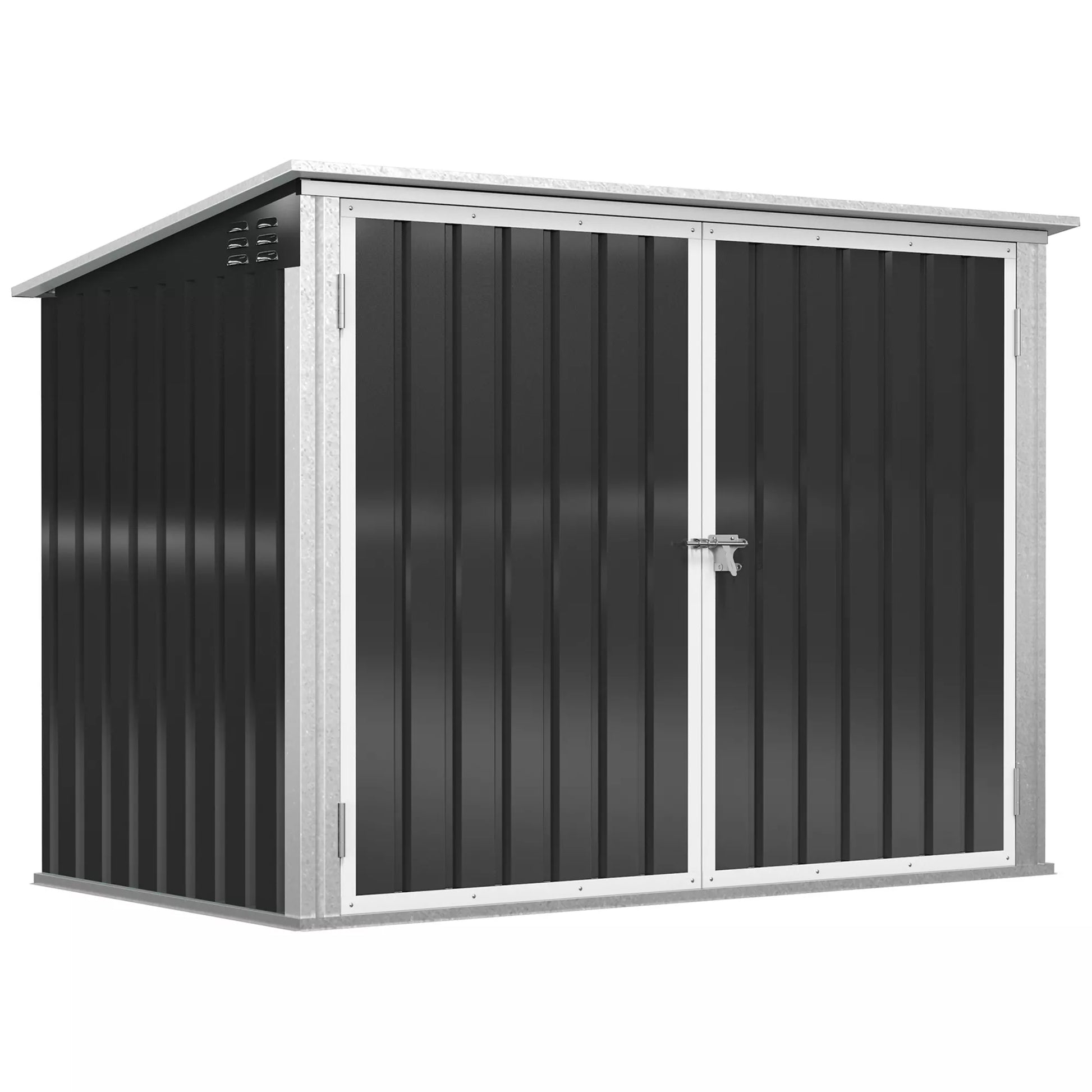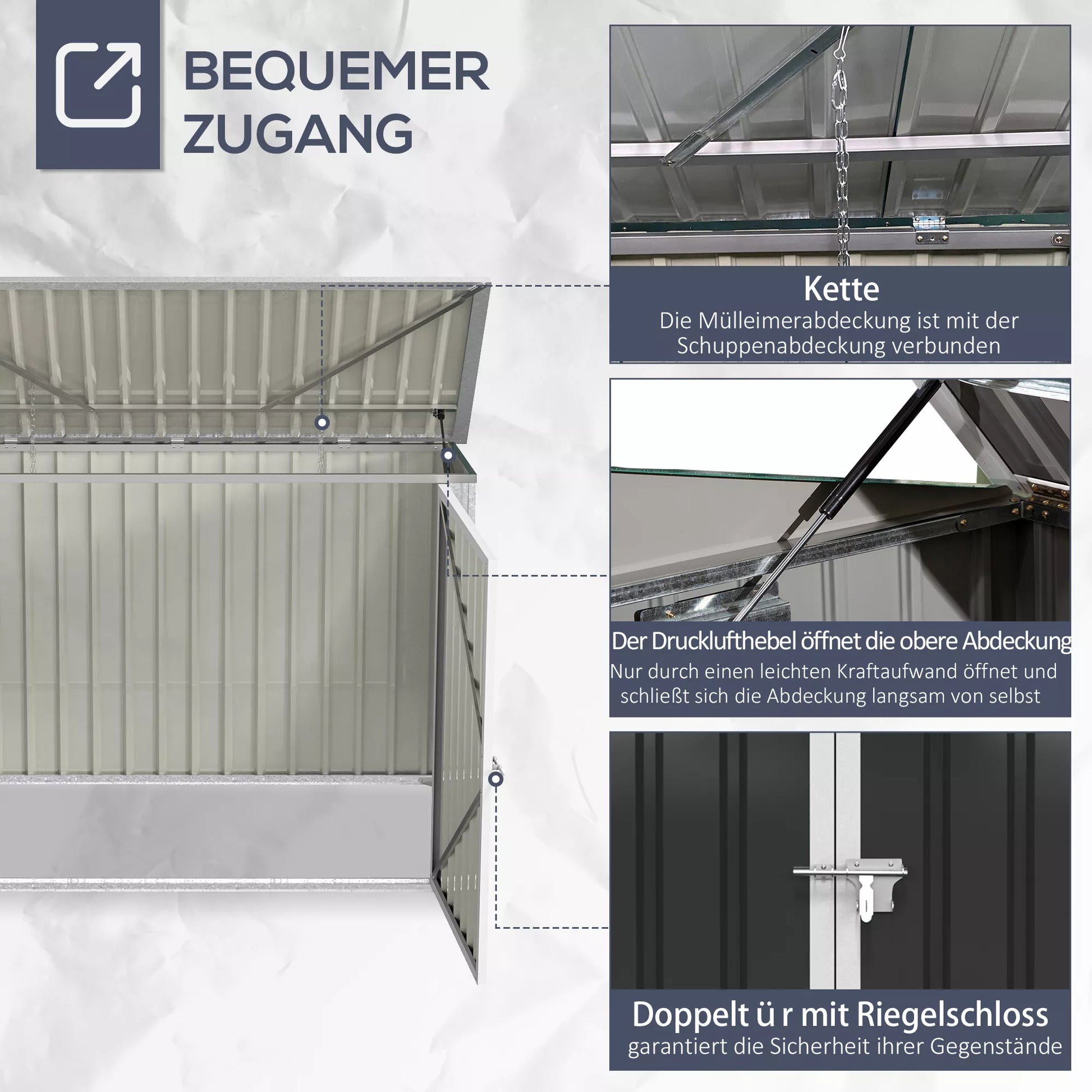 Su šia patogia metaline šiukšliadėžių spinta galėsite efektyviai apsaugoti savo šiukšliadėžes nuo vėjo gūsio ar smalsių gyvūnų. Užrakinamos dvigubos durys ir pneumatinis stogelio atidarymas leidžia patogiai naudotis, todėl šiukšliadėžes galėsite lengvai įdėti ir išimti. Be to, šoninės ventiliacijos angos užtikrina oro cirkuliaciją ir padeda išvengti nemalonių kvapų.