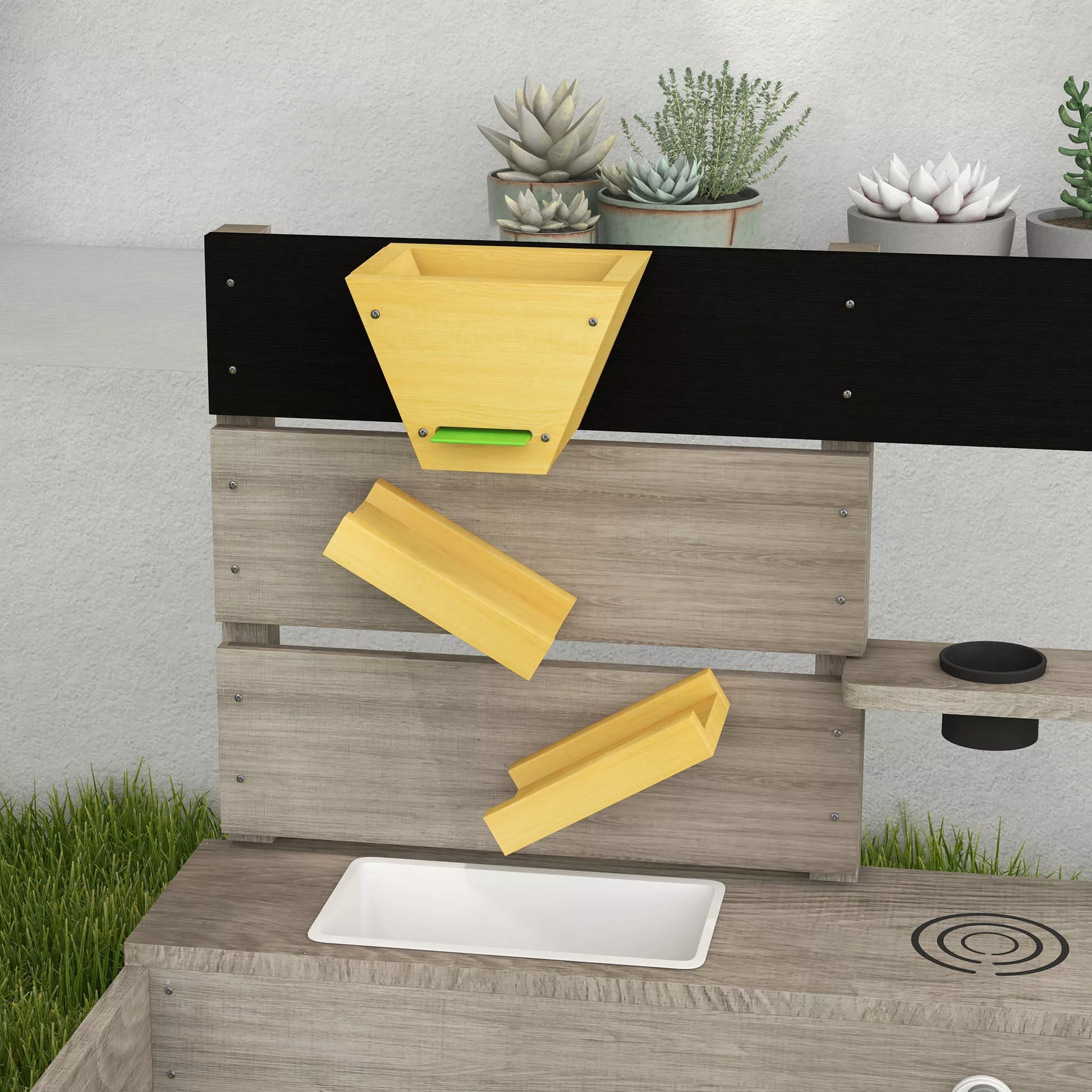 Ši smėlio dėžė yra daugiau nei paprasta smėlio dėžė – tai kompaktiška nuotykių žaidimų aikštelė jūsų nuosavame kieme! Jūsų vaikai bus sužavėti šios smėlio dėžės, ypač jei jie mėgsta žaisti „virtuvėlę“, nes čia yra žaismingas virtuvėlės elementas ir du lysvių/augalų dėklai. Aukšto stabilumo natūralaus medžio rėmas garantuoja saugumą ir stabilumą bet kokiomis oro sąlygomis. Dėl vidinio audinio įdėklo lietaus vanduo laisvai nuteka, todėl smėlis greičiau džiūsta.