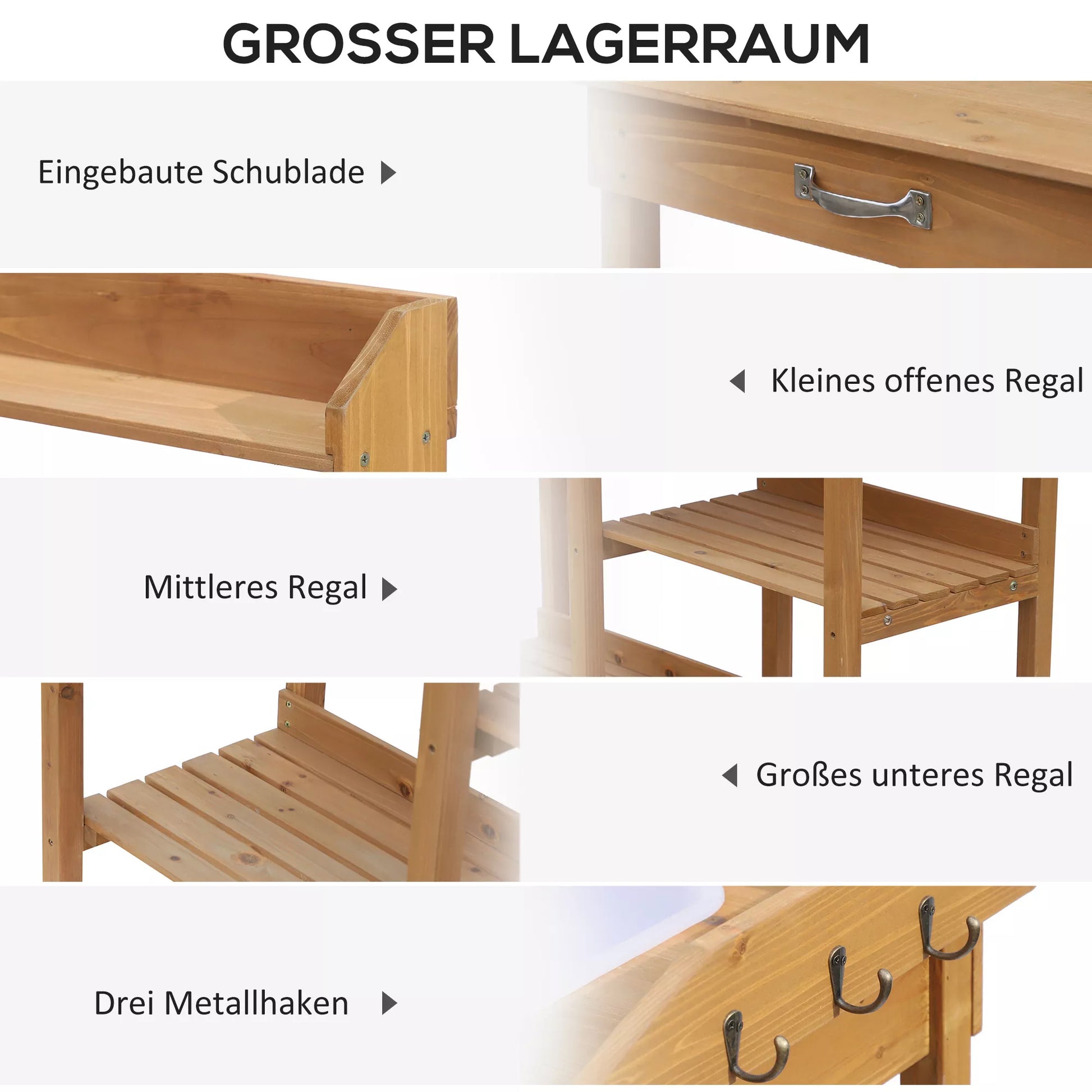 Sodinimo stalas, daržo stalas su praustuve, lauko stalas iš eglių medienos, natūralus, 117 x 45 x 121 cm