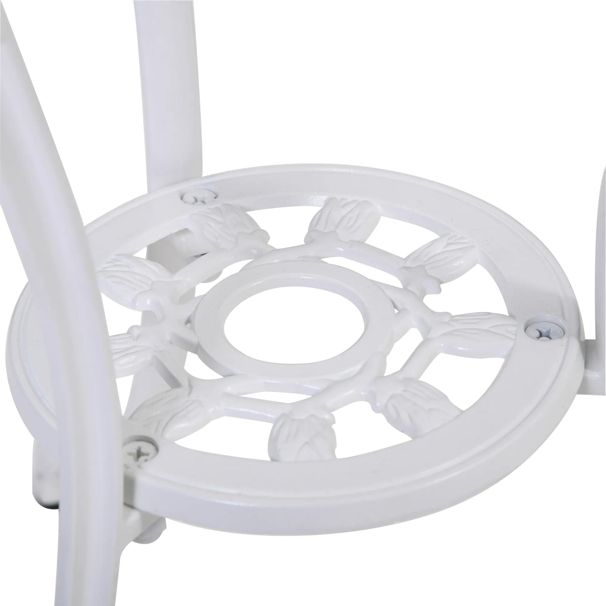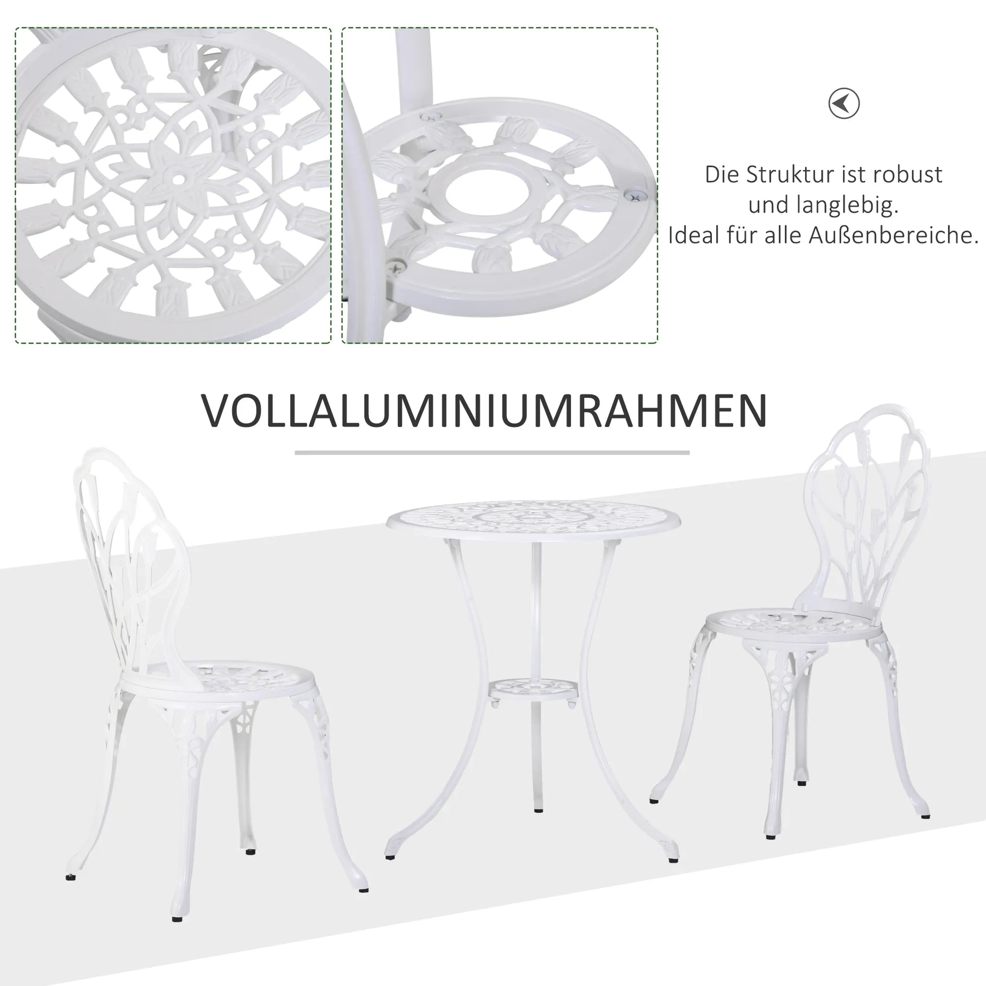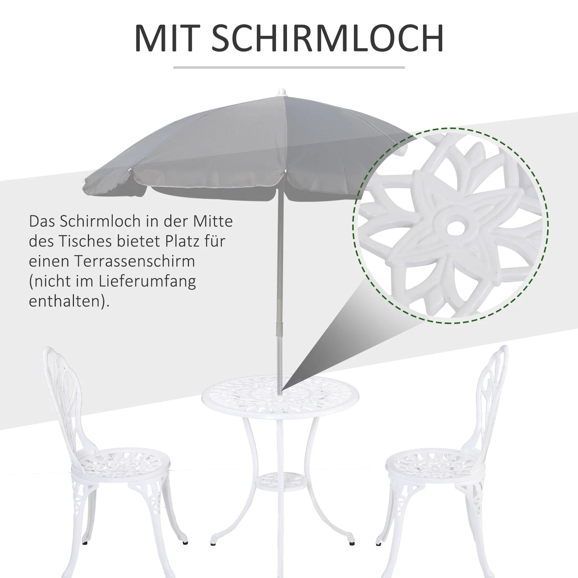Sėdimoji lauko baldų grupė 2 asmenims: 1 stalas + 2 kėdės, su skėčio anga, aliuminio, balta