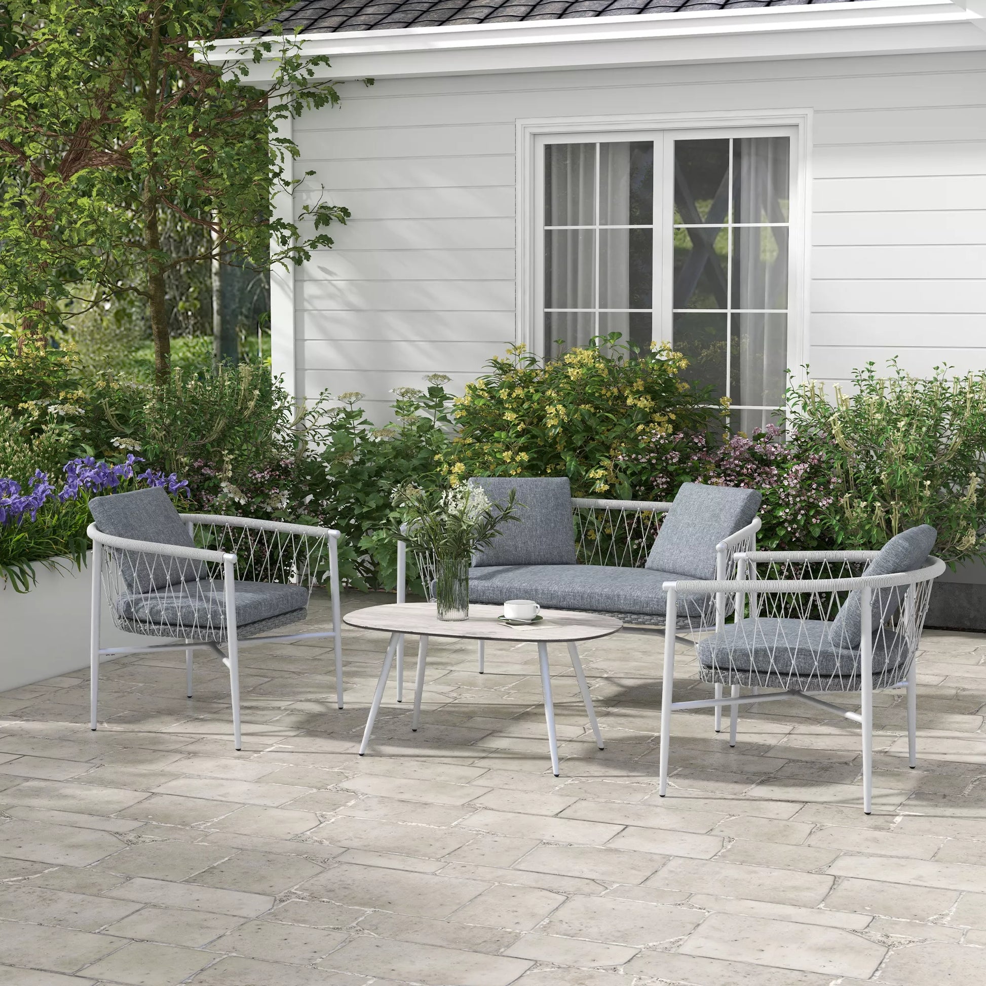 - ✔ 4 dalių rotango lauko baldų komplektas, sudarytas iš dviejų krėslų, dvivietės sofos ir kavos staliuko, skirtas stilingam poilsiui lauke.