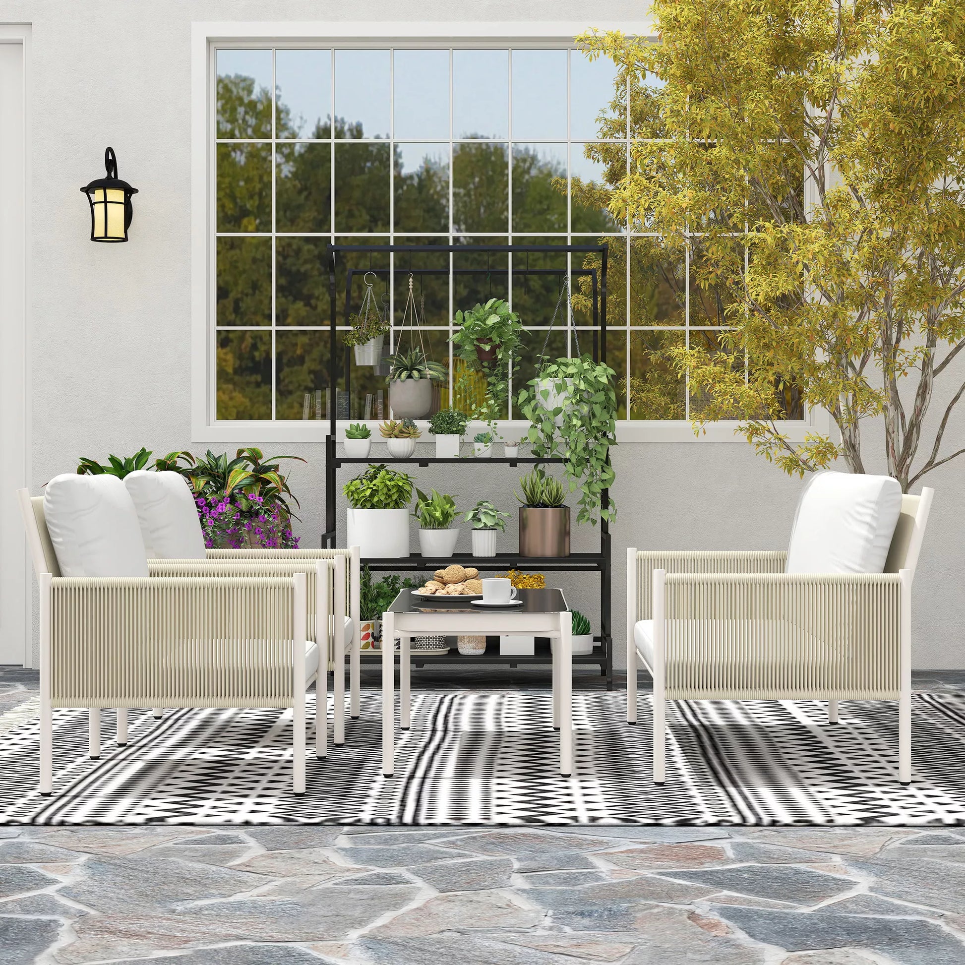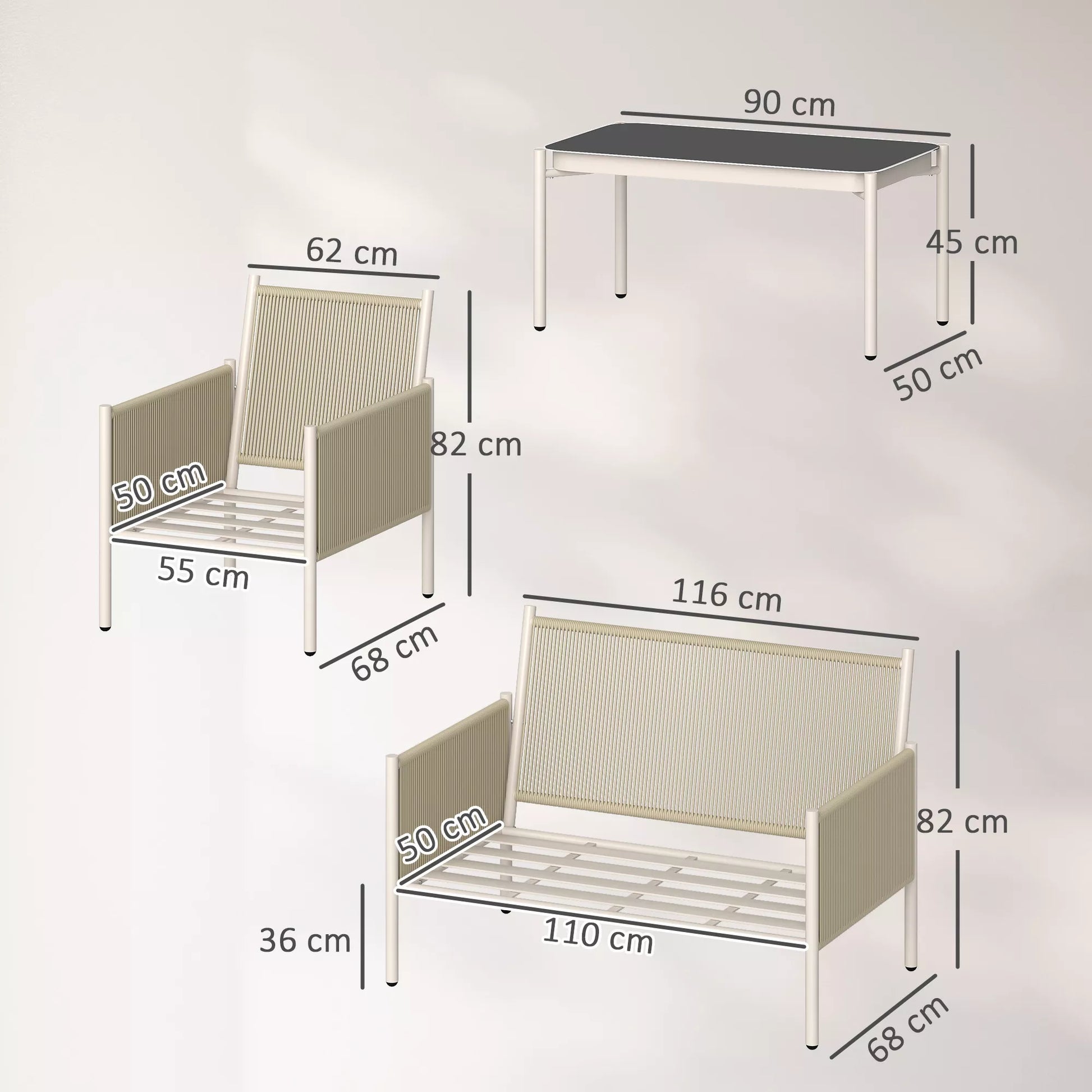 Paverskite savo sodą ramybės oaze su šiuo keturių dalių poliratano sodo baldų komplektu. Jį sudaro du patogūs foteliai, jaukus dvivietis suolas ir elegantiškas kavos staliukas su grūdinto stiklo stalviršiu – puikiai tinka rytinei kavai ar vakariniams kokteiliams. Mūsų poliratano lauko baldų komplektas su milteliais dengtu plieniniu rėmu ir PE ratanu apima lengvai valomus, skalbiamus pagalvių užvalkalus.