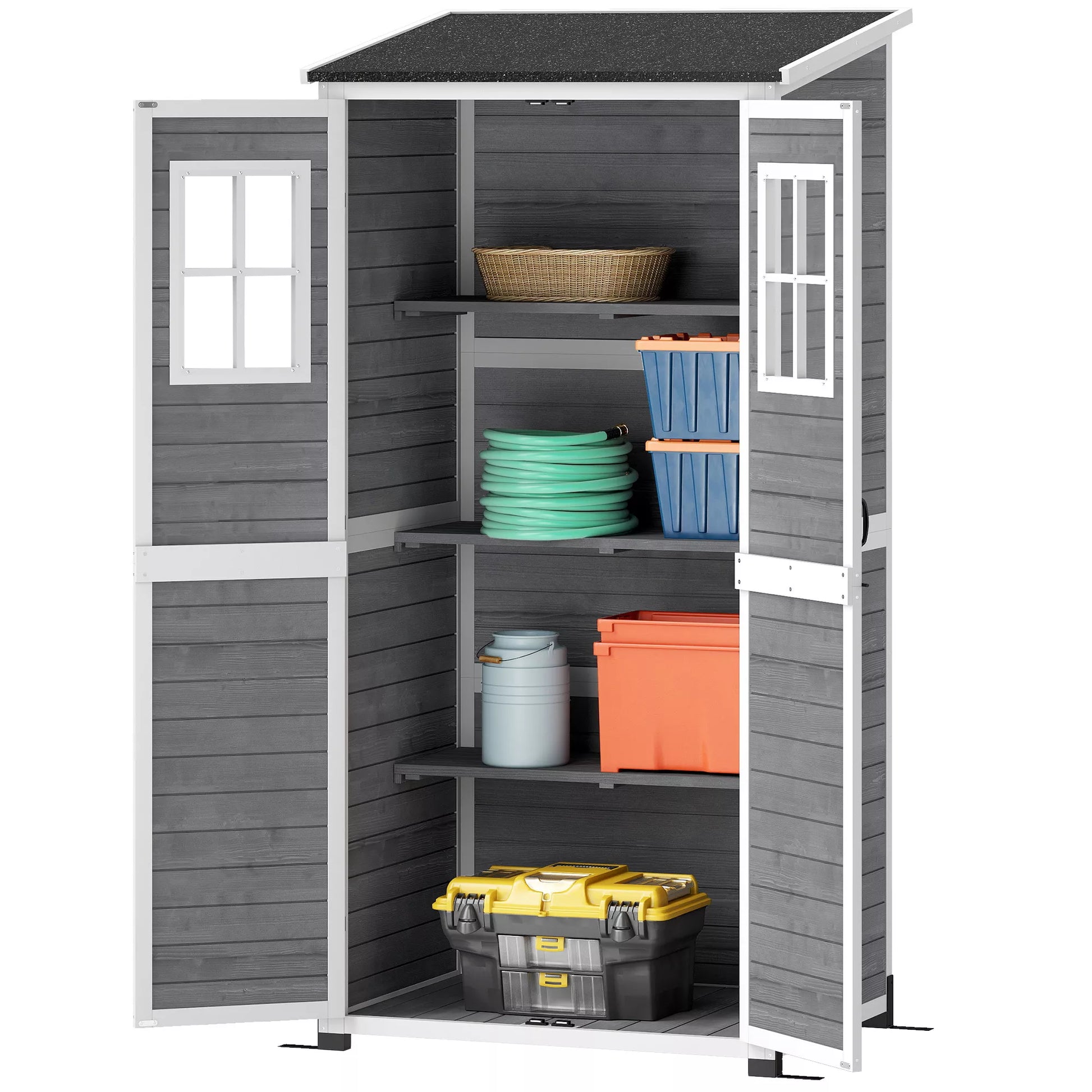 Sodo saugykla, įrankių namelis su 2 langais, žemės kuoliukai, asfaltuotas stogas, 91 x 69 x 192 cm, eglės mediena, šviesiai pilka