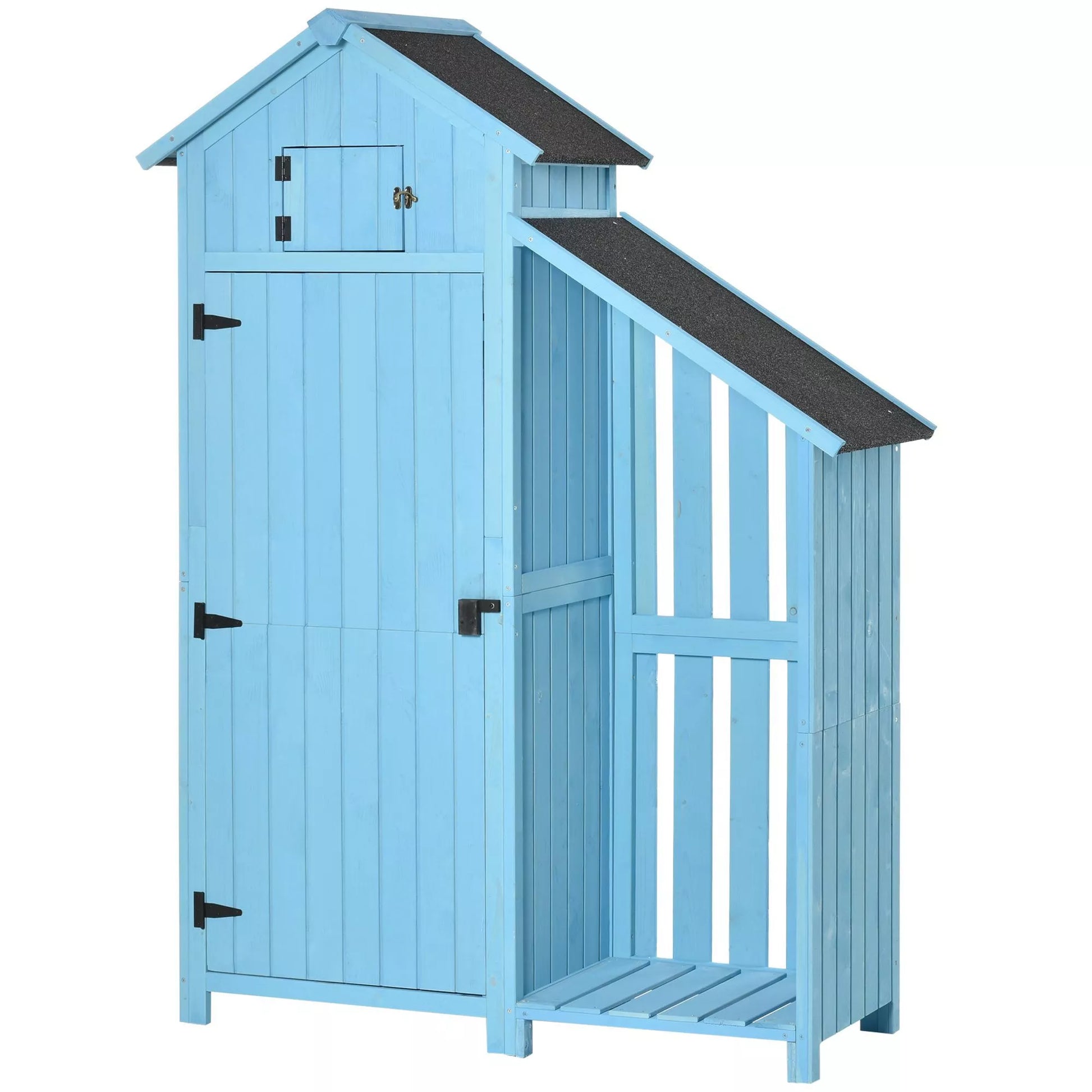 Sodo namelis įrankių sandėliukas su malkine, 3 lentynomis, asfalto danga, eglės mediena, dangaus mėlynumo, 130 x 54,5 x 180 cm