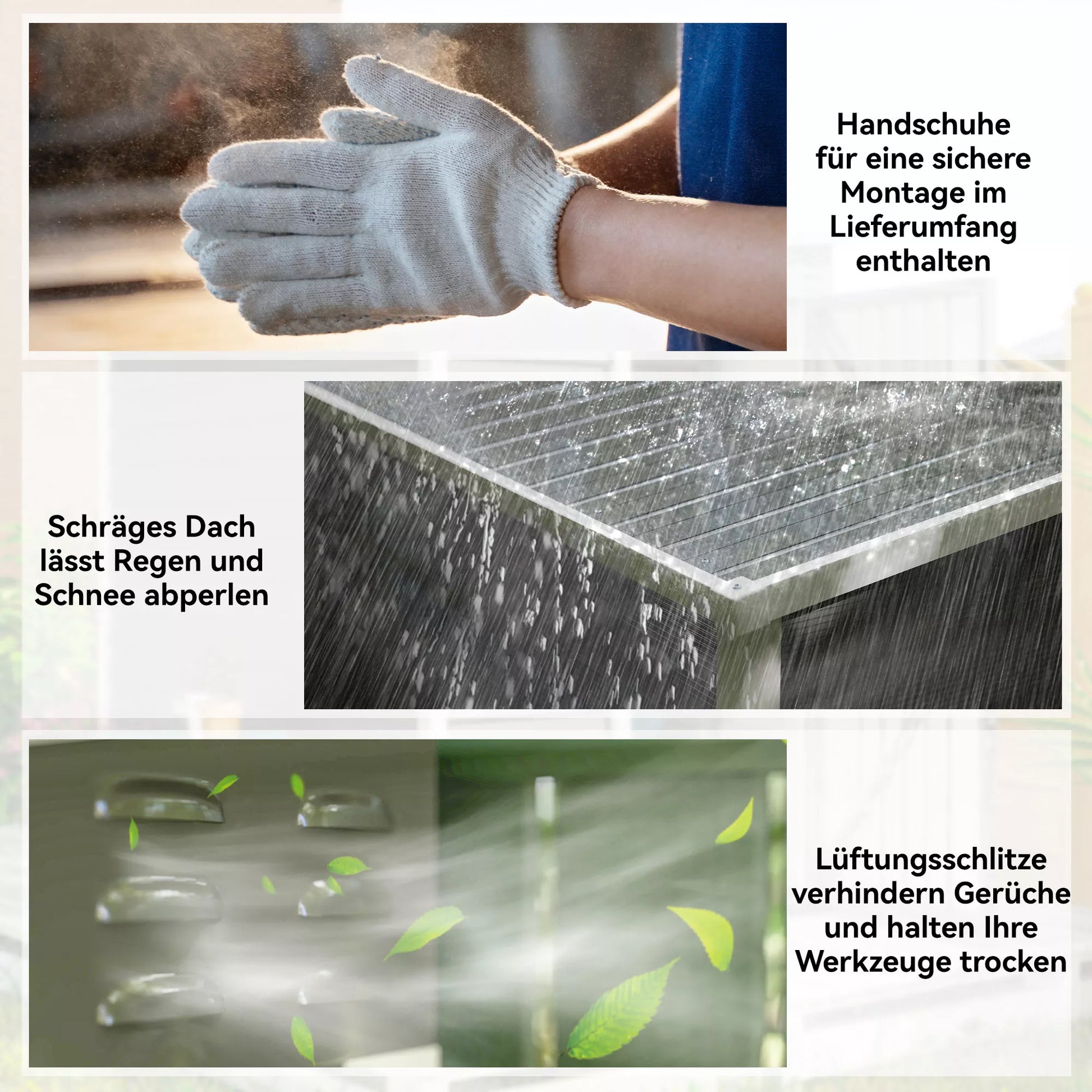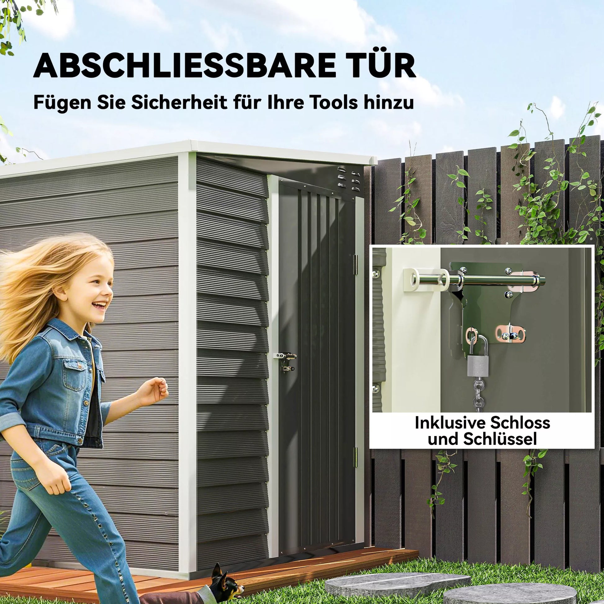 Ši moderni sodo įrankių namelė su horizontaliais skydeliais gerokai palengvina surinkimą. Su užrakinamomis durimis ir pridėtais raktais, šis metalinis įrankių namelis apsaugo jūsų daiktus ir suteikia lengvą prieigą. Du integruoti metalinio sodo namelio ventiliacijos angų užtikrina oro cirkuliaciją ir apsaugo nuo drėgmės. Optimali daiktų saugojimo vieta jūsų lauko erdvei.
