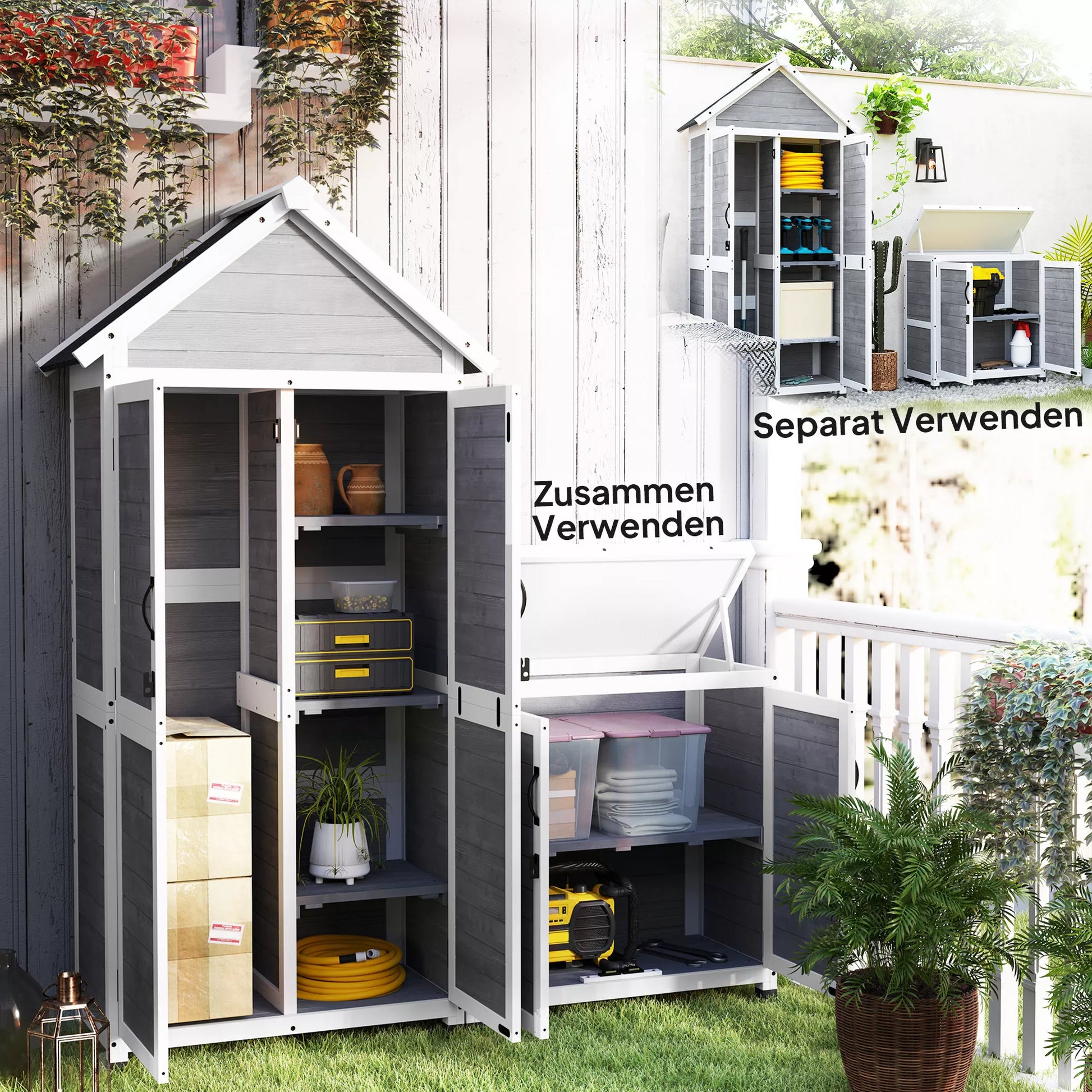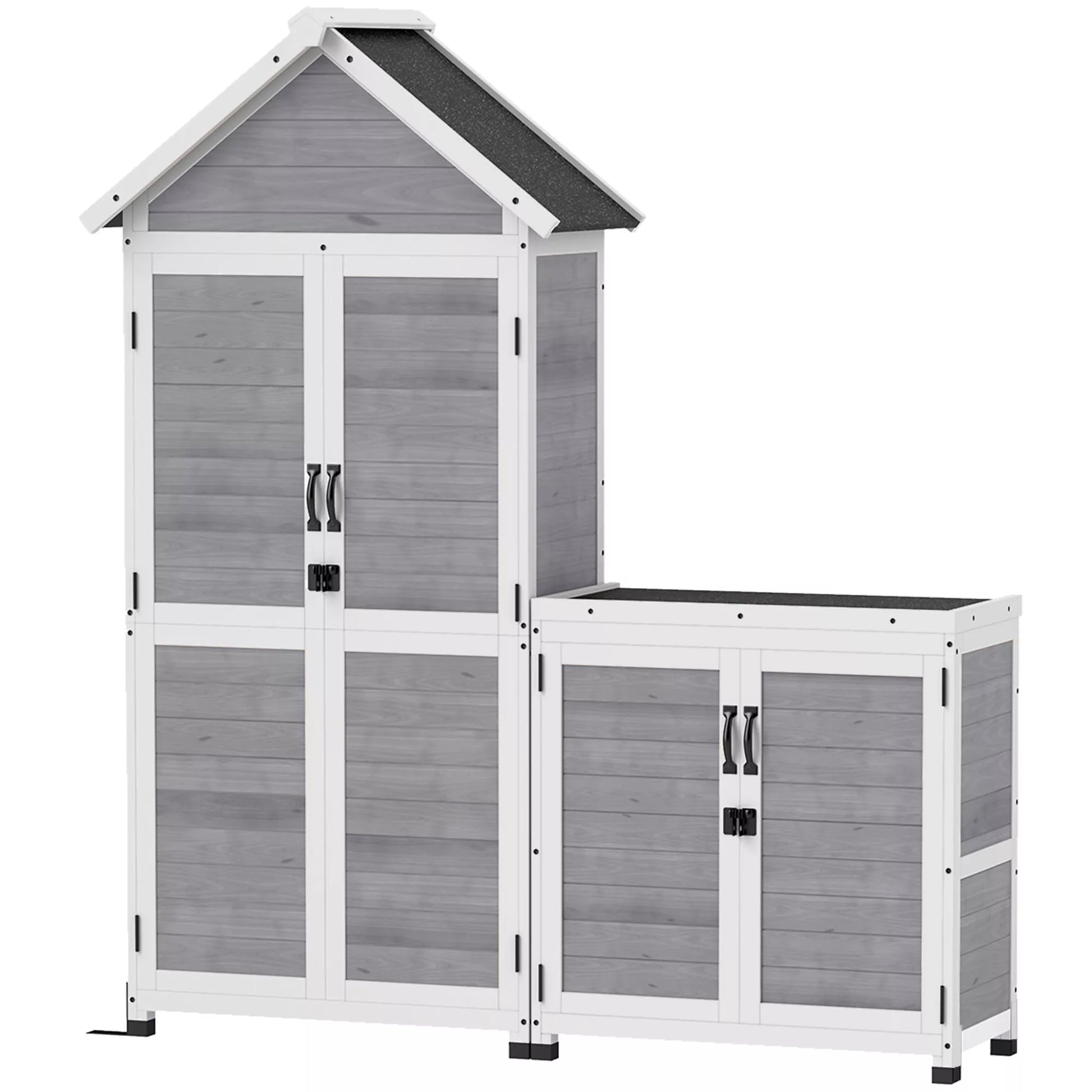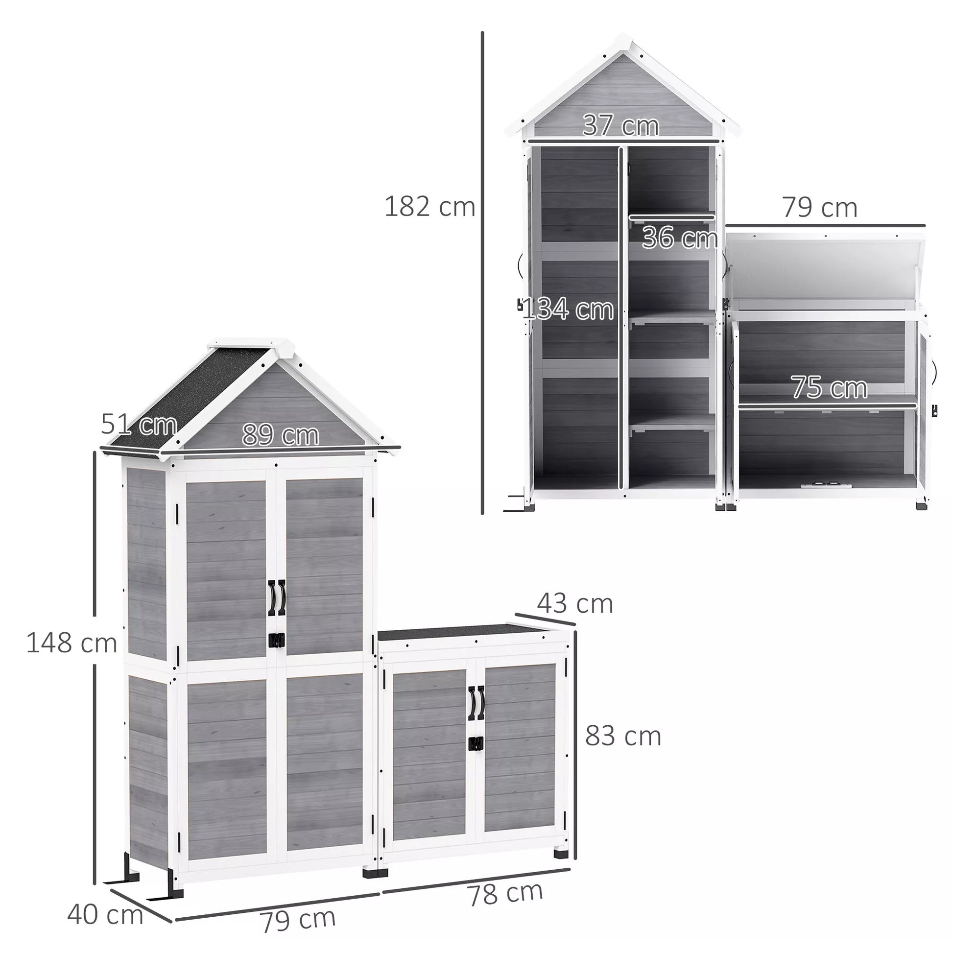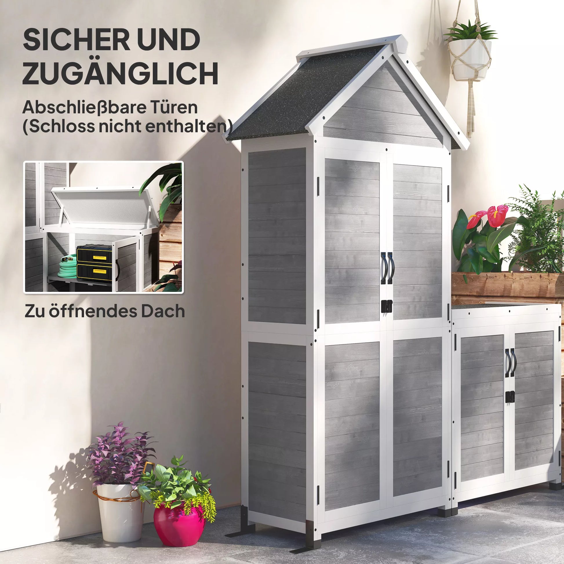Sodo namelis su laikymo spintele, reguliuojamos lentynos, užrakinamos durys, atsparus vandeniui, eglės mediena, šviesiai pilka