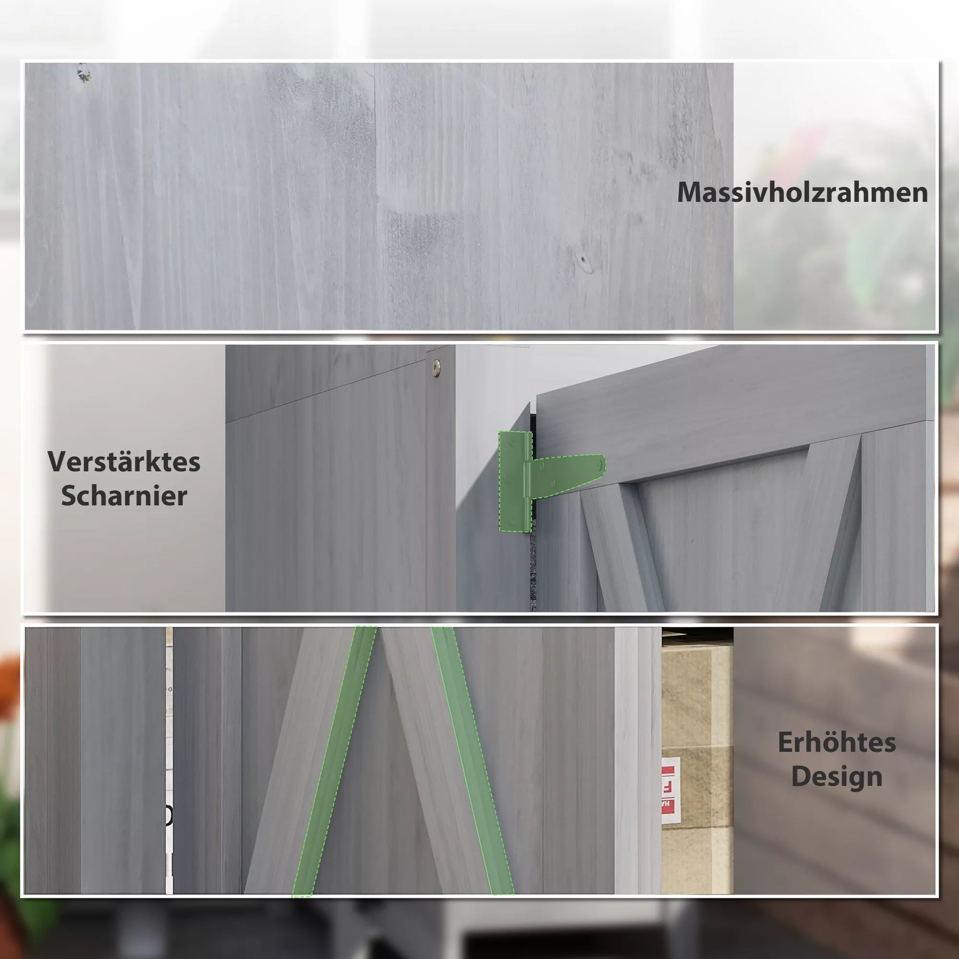 - ✔ Masyvus medinis rėmas su apsaugine danga mediniame sodo įrankių skyriuje užtikrina ilgaamžiškumą