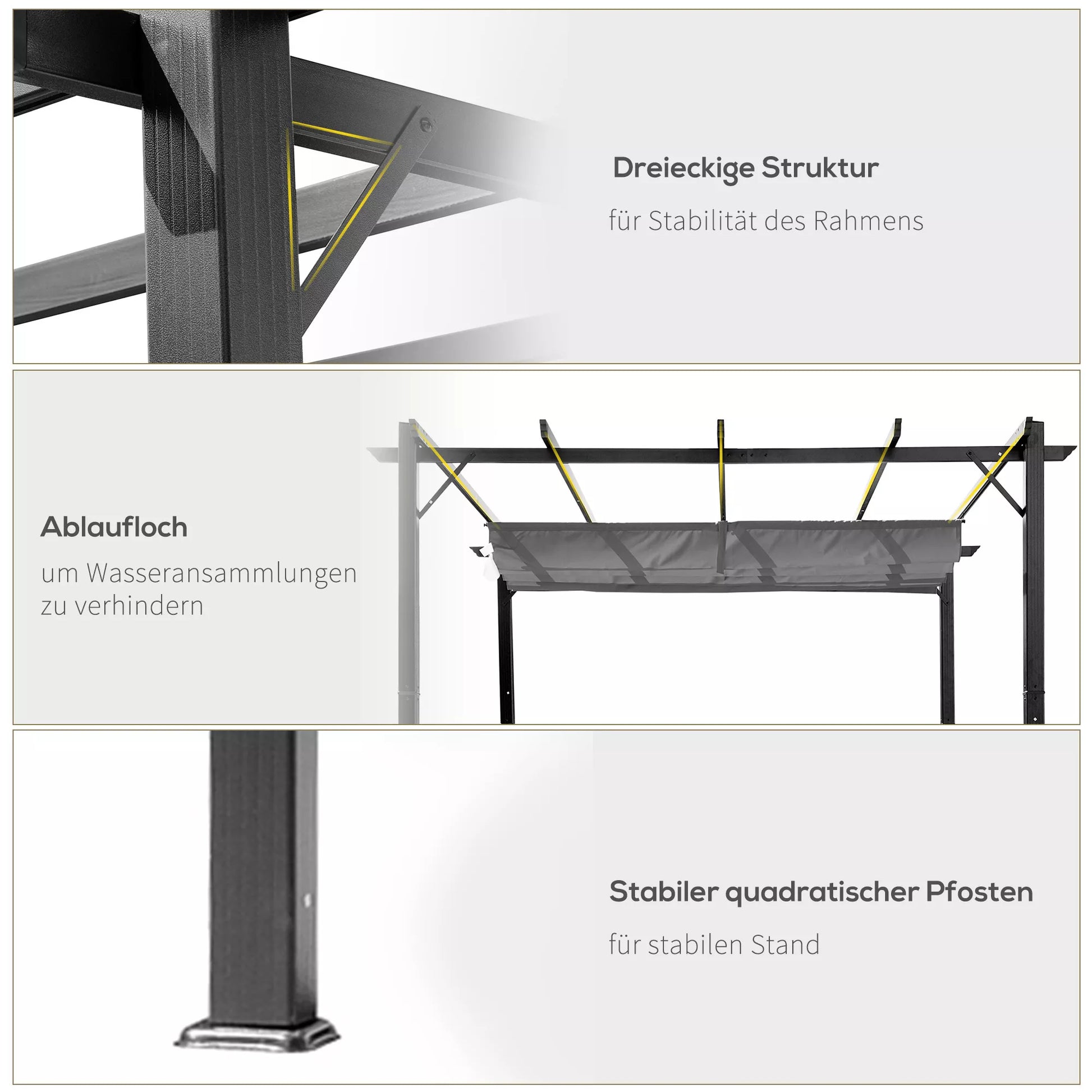 Jei norite patogiai sėdėti pavėsyje saulėtomis dienomis, mūsų pavėsinė yra tinkamas pasirinkimas. Dėl atviros konstrukcijos mūsų pavėsinę galima naudoti kaip sodo paviljoną, terasos stoginę ar stogelį, ji suteikia pakankamą apsaugą nuo tiesioginių saulės spindulių ir lengvo lietaus. Dėl aukštos kokybės milteliniu būdu dengto aliuminio rėmo užtikrinamas stabilumas. Universalus, puikiai pagamintas ir apgalvotas. Su mūsų pavėsine vasara gali prasidėti!