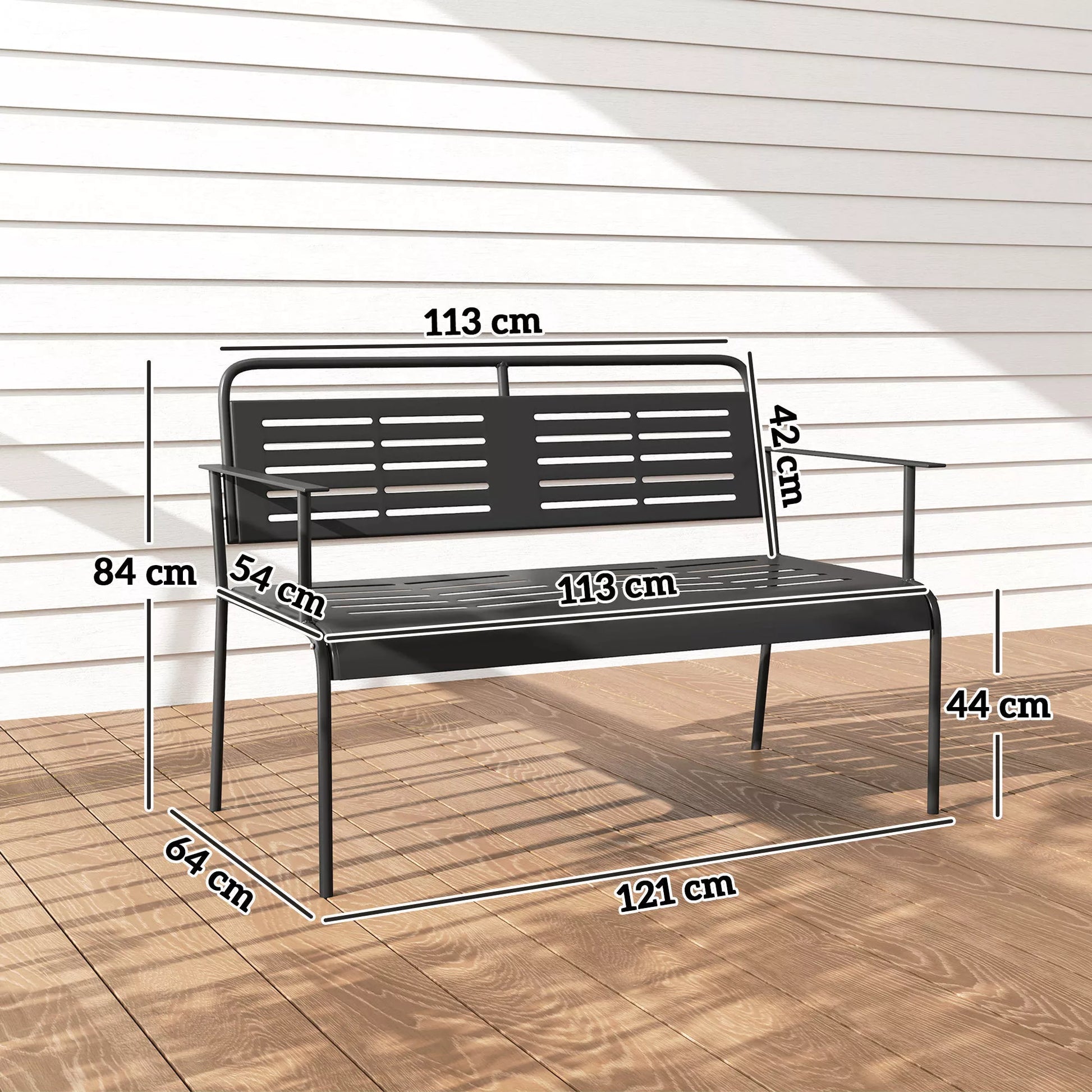 Mėgaukitės ramia laisvalaikiu ant elegantiškos lauko suoliuko. Tvirtas sodo suoliuko plieninis rėmas yra atsparus rūdims ir padengtas milteliais. Sodo suoliukas išlaiko iki 240 kg svorio ir patogiai talpina du suaugusius žmones. Atlošas yra šiek tiek daugiau nei 90° kampu pasviręs, todėl užtikrina optimalų komfortą, o paprastas dizainas puikiai dera prie bet kokios lauko aplinkos.