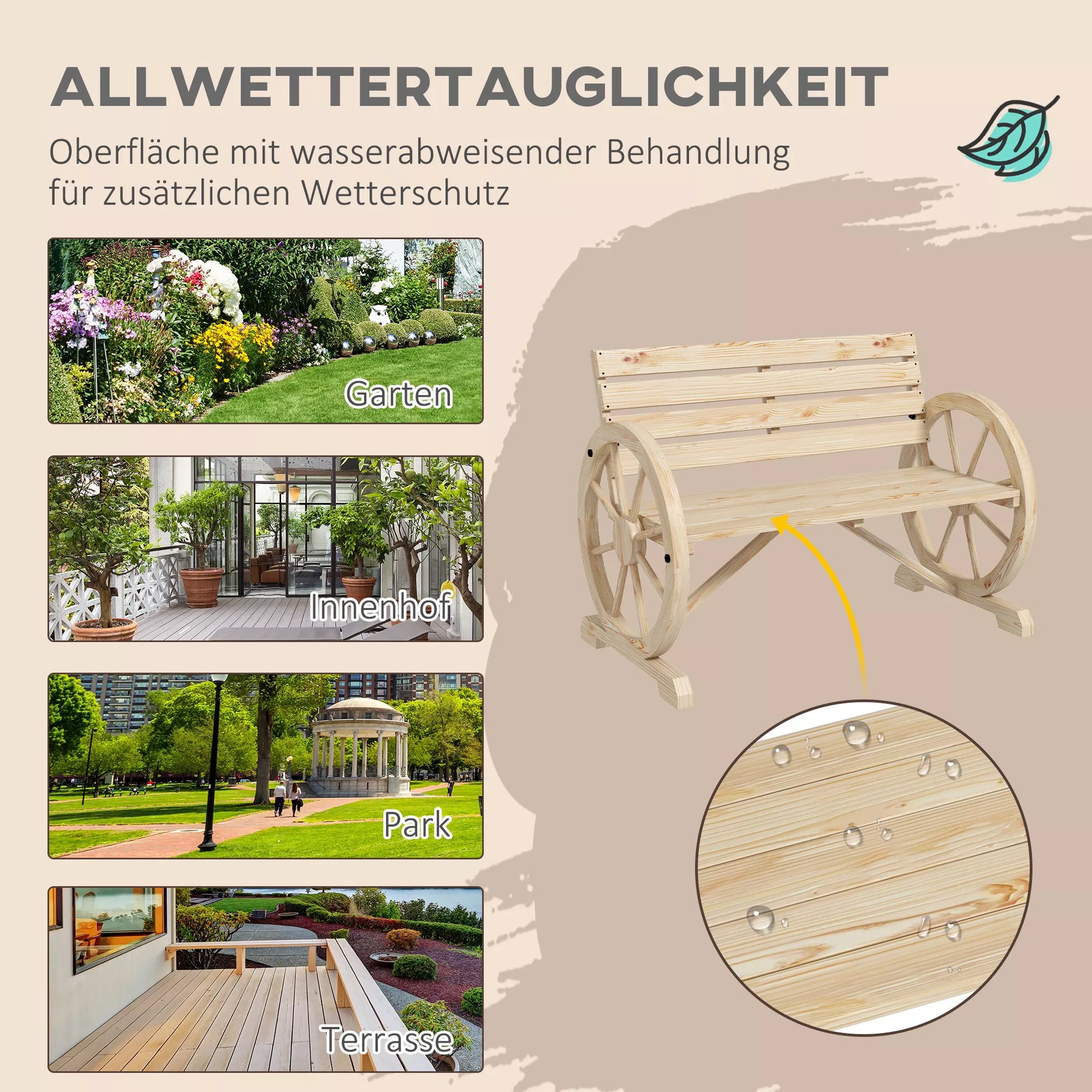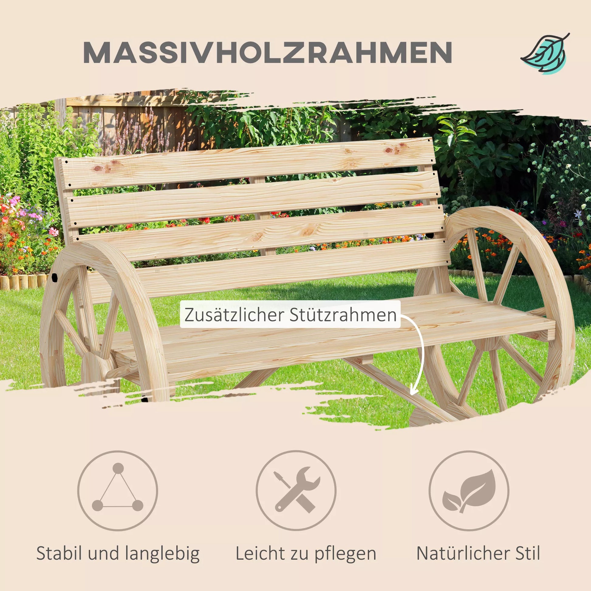 Papildykite savo terasą ar sodą šia kaimiško stiliaus suoliuku, ant kurio galėsite sėdėti ir ilsėtis mėgaudamiesi mėgstama lauko erdve. Šis suoliukas, pagamintas iš tvirtos pušies medienos, yra patvariai pagamintas, kad iki dviejų žmonių galėtų atsipalaiduoti saulėje ar pavėsyje. Abi porankiai turi unikalų vežimo ratų dizainą, kuris suteikia vietos jūsų rankoms ir neabejotinai pavers šį suoliuką pokalbių objektu.