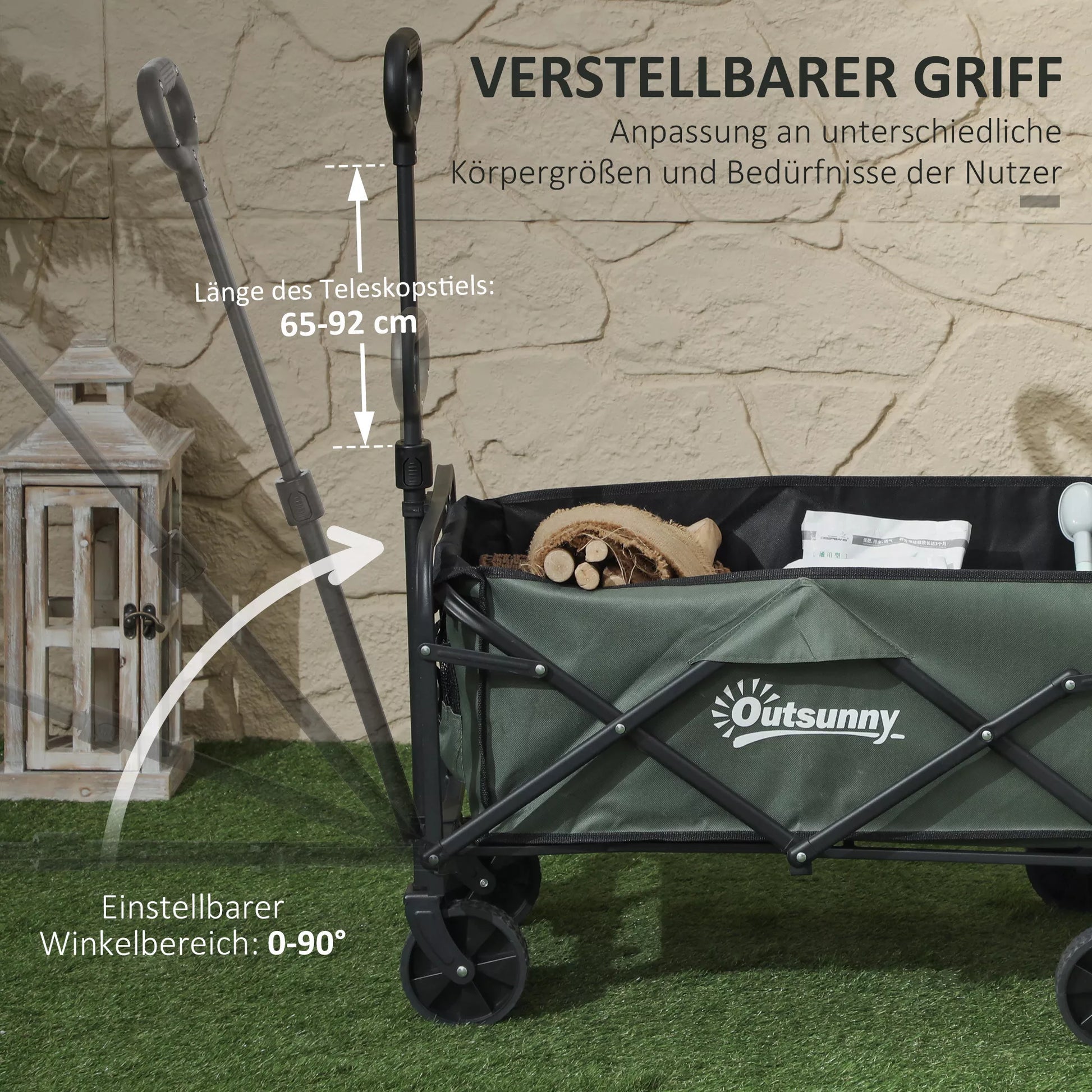 Sodo vežimėlis, kurio keliamoji galia 90 kg, sulankstomas transportavimo vežimėlis su nuimamu tentu, rankena, ratais, 72 litrų talpos, žalios spalvos