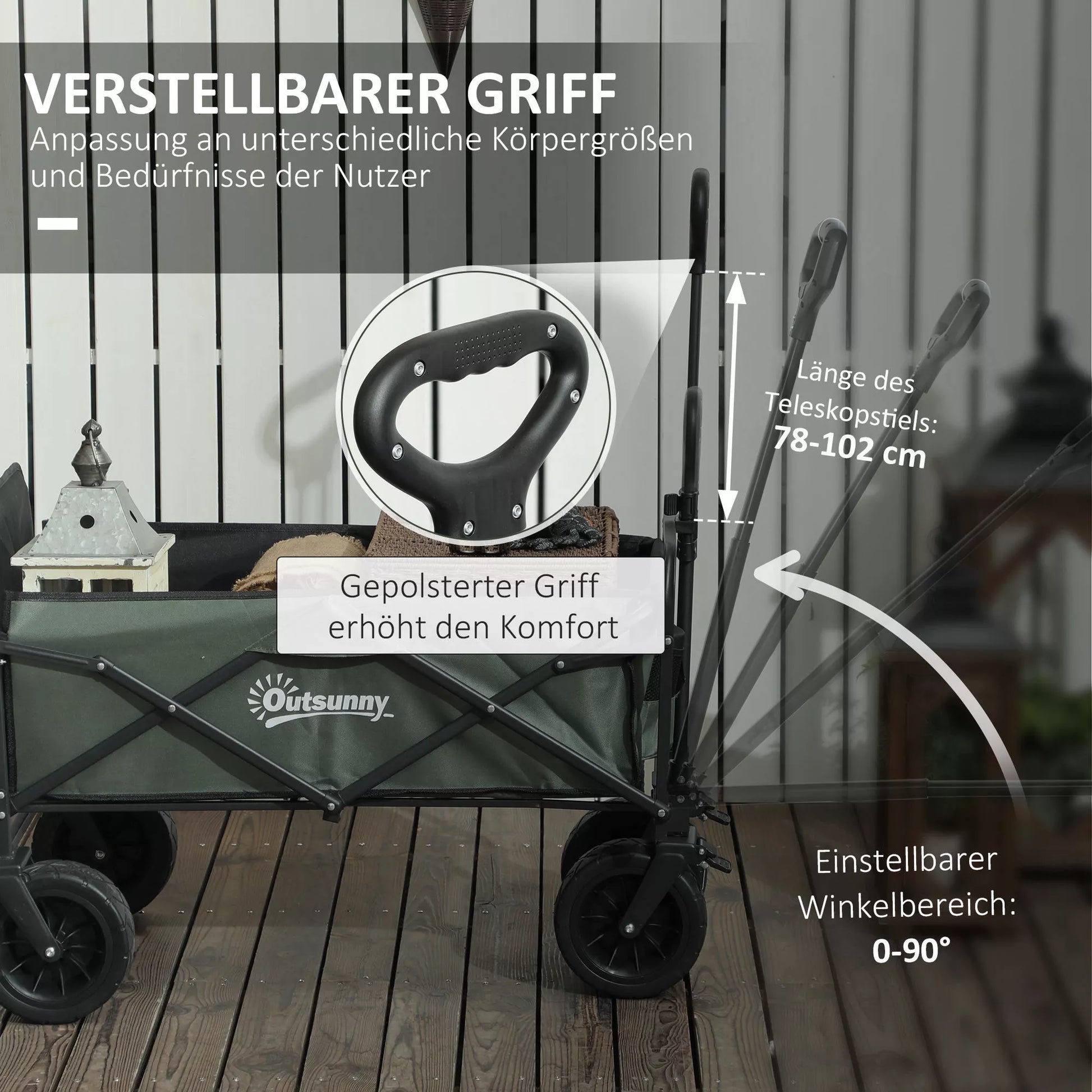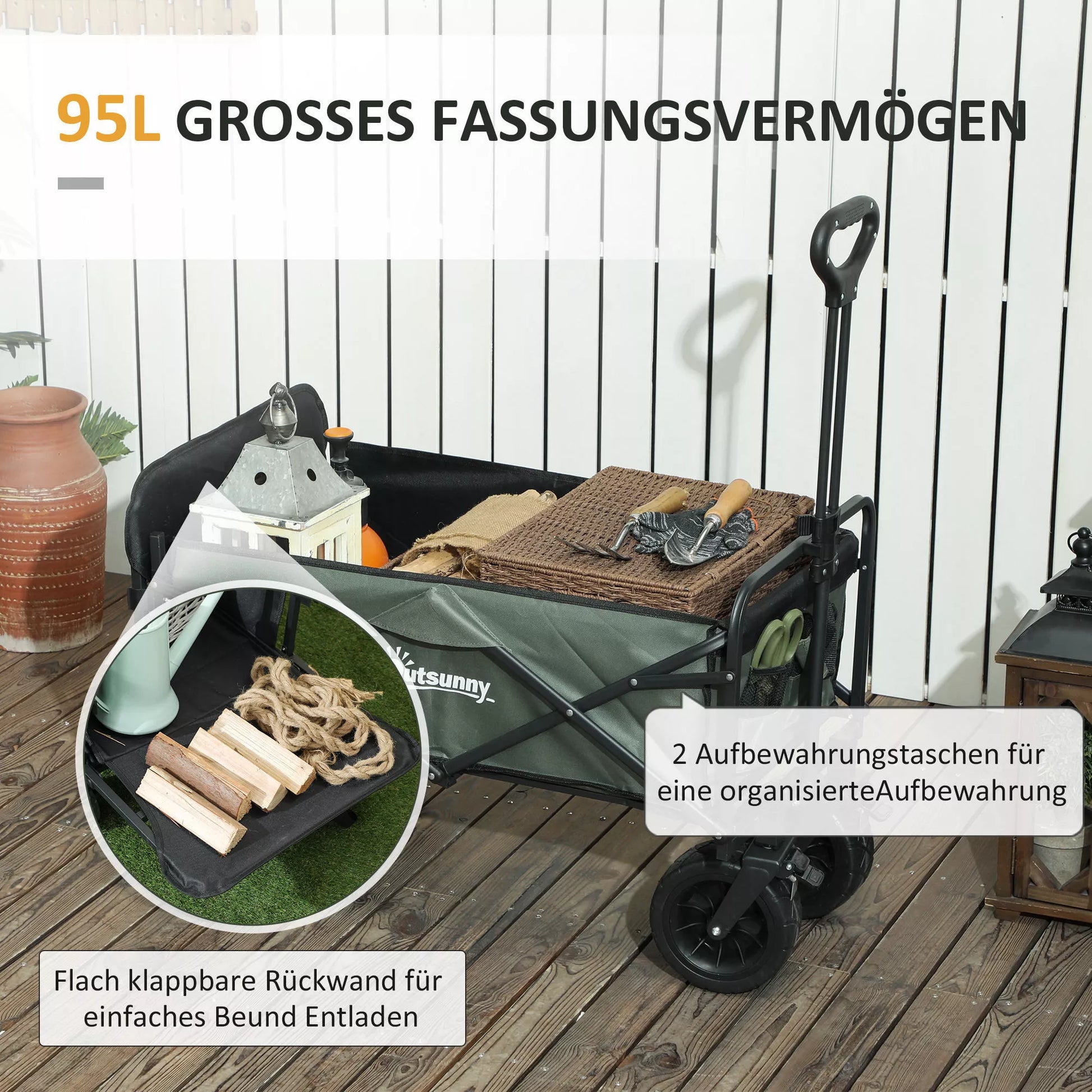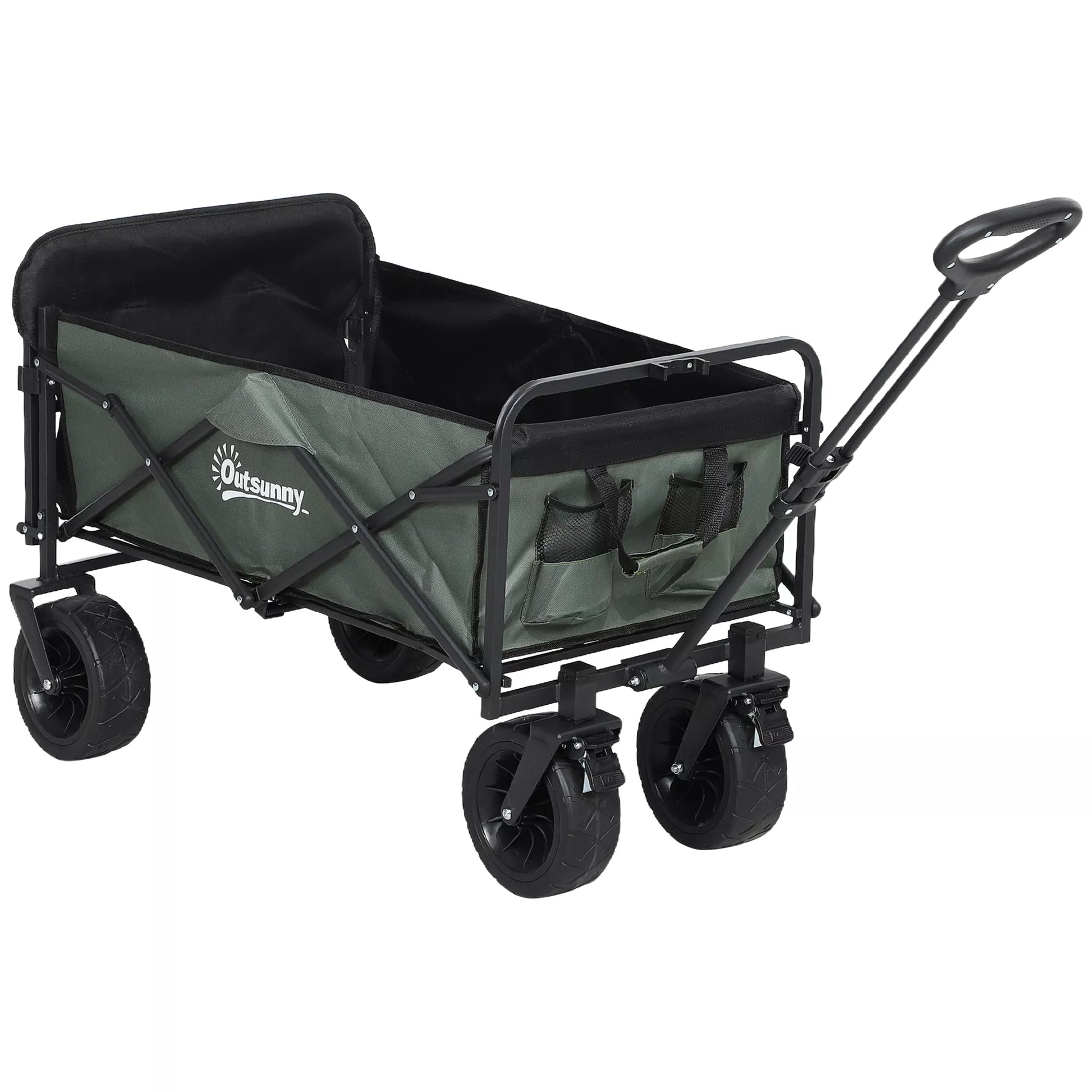 Outsunny Sodo vežimėlis, keliamosios galios 120 kg, sulankstomas transportavimo vežimėlis su nuimamu tentu, rankena, ratais 95 litrai žalias