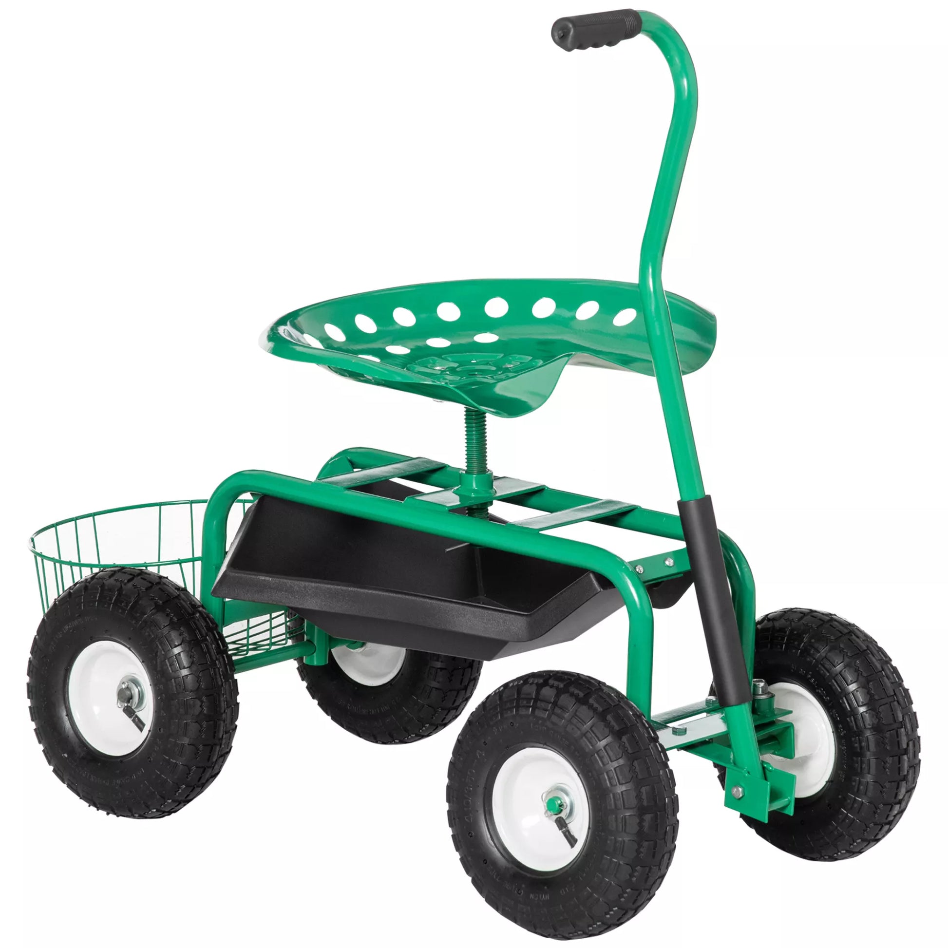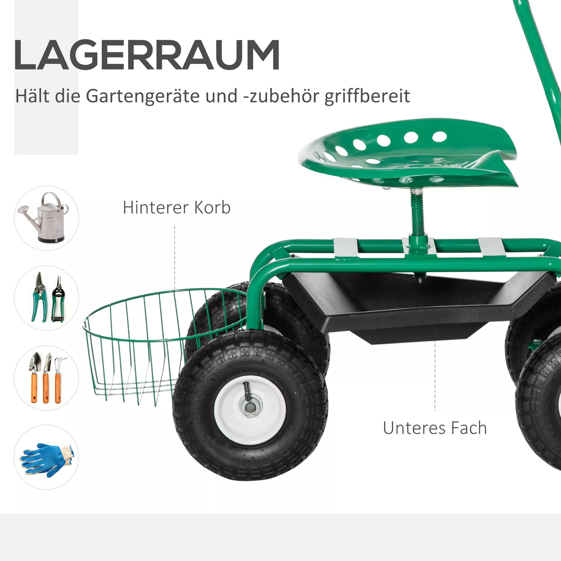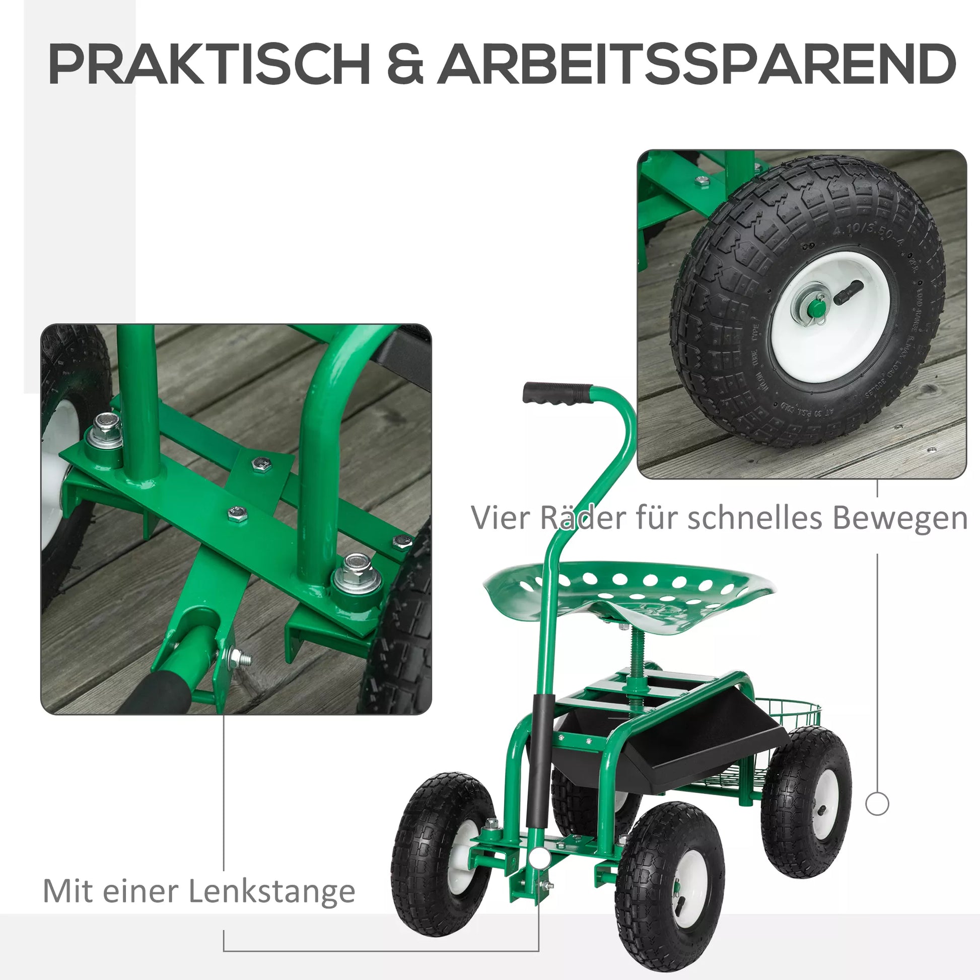 Sodo vežimėlis su ratuku iki 150 kg su padėklu, krepšiu mažiesiems sodo įrankiams, ratinis dirbtuvių vežimėlis, reguliuojama kryptimi, sėdynės aukštis 46-59 cm, reguliuojamas aukštis, metalas, guma, žalias