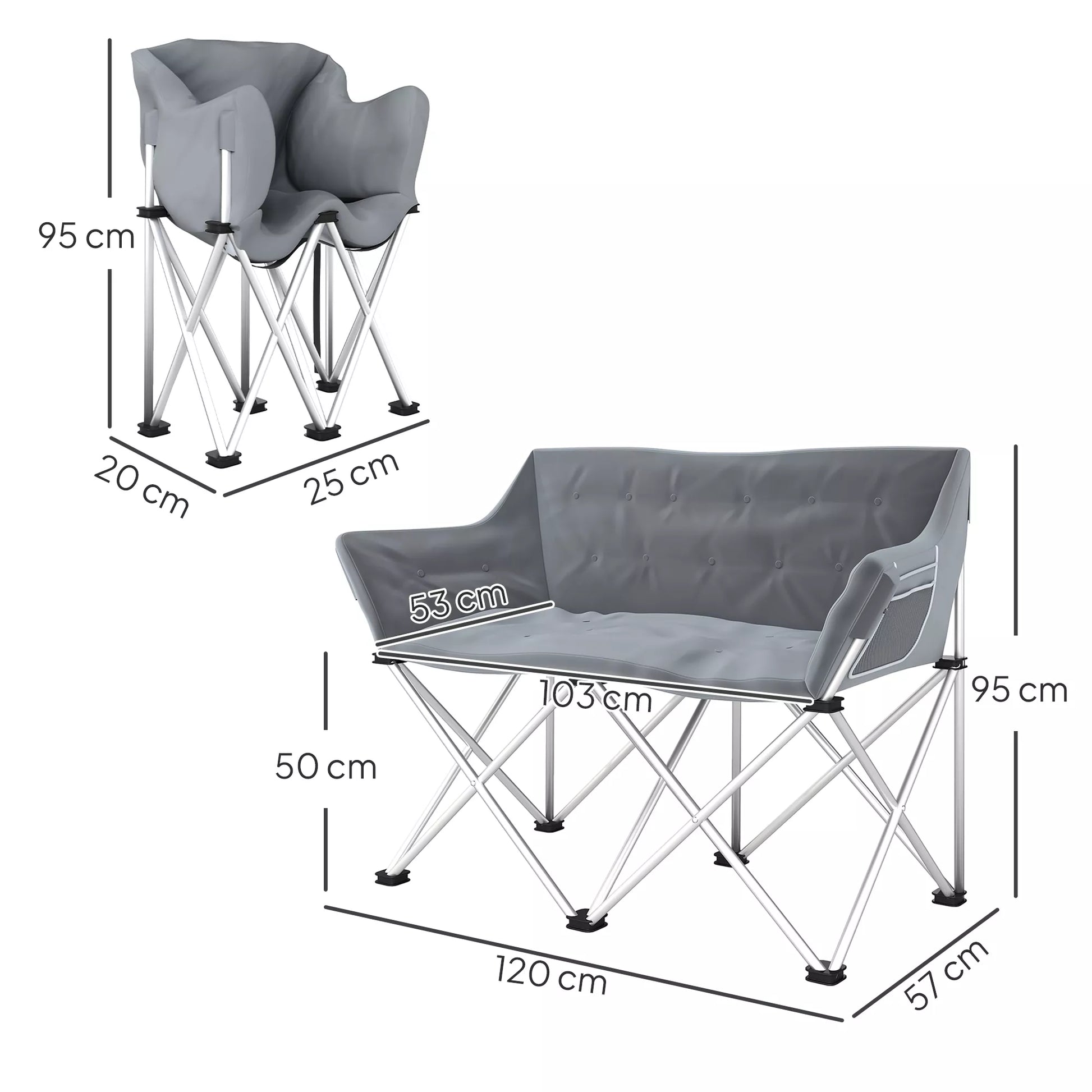 Sulankstoma 2 vietų kempingo kėdė su porankiais, šonine kišene, atlaiko iki 240 kg, pilka