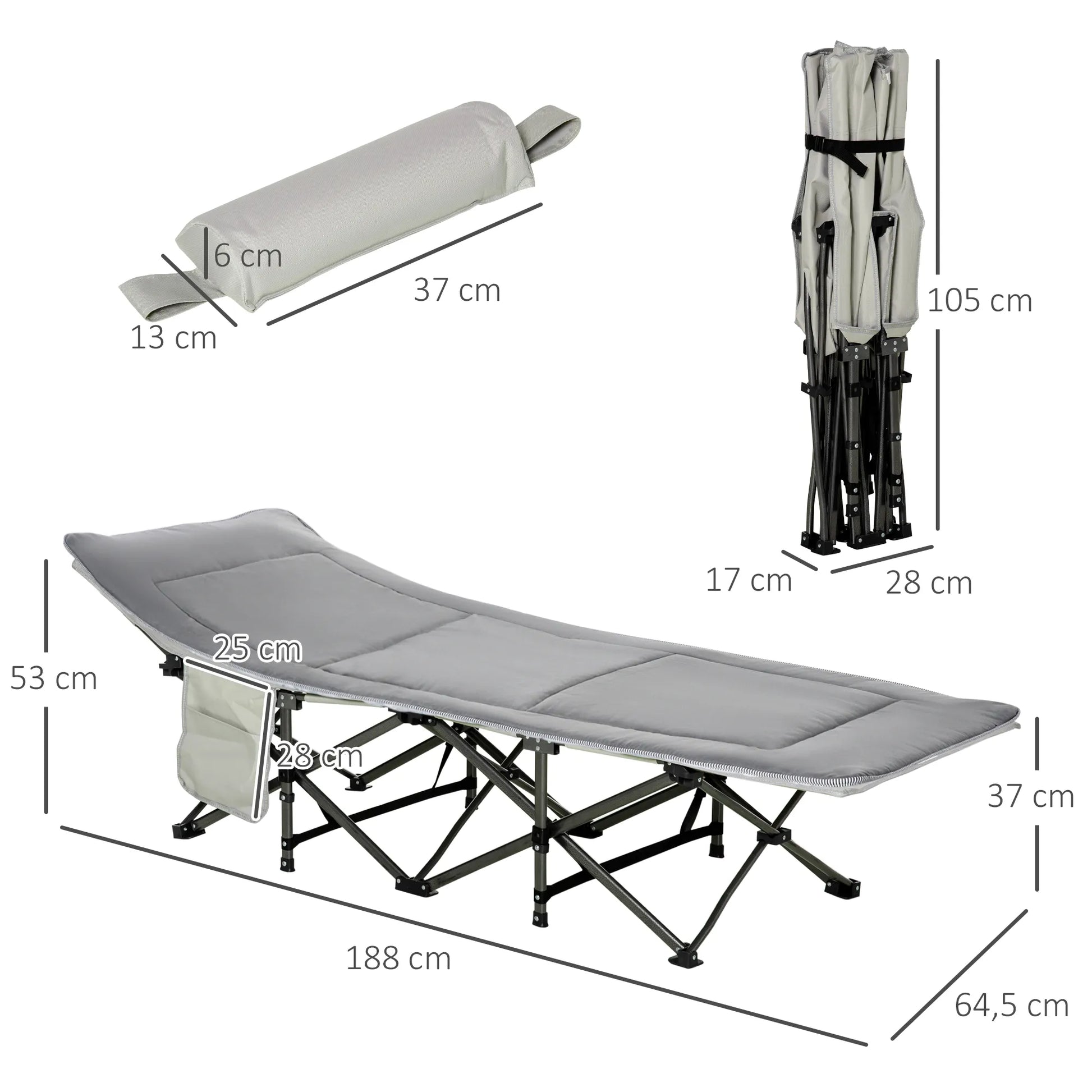 Sulankstoma stovyklavietės lova su čiužiniu ir nešiojimo krepšiu, 188 x 64,5 x 53 cm. Svečių lova, atlaikanti iki 150 kg. Stovyklavietės gultas suaugusiems. Sulankstoma lova lauko reikmenims, sodui, stovyklavimui, kelionėms. Šviesiai pilka.