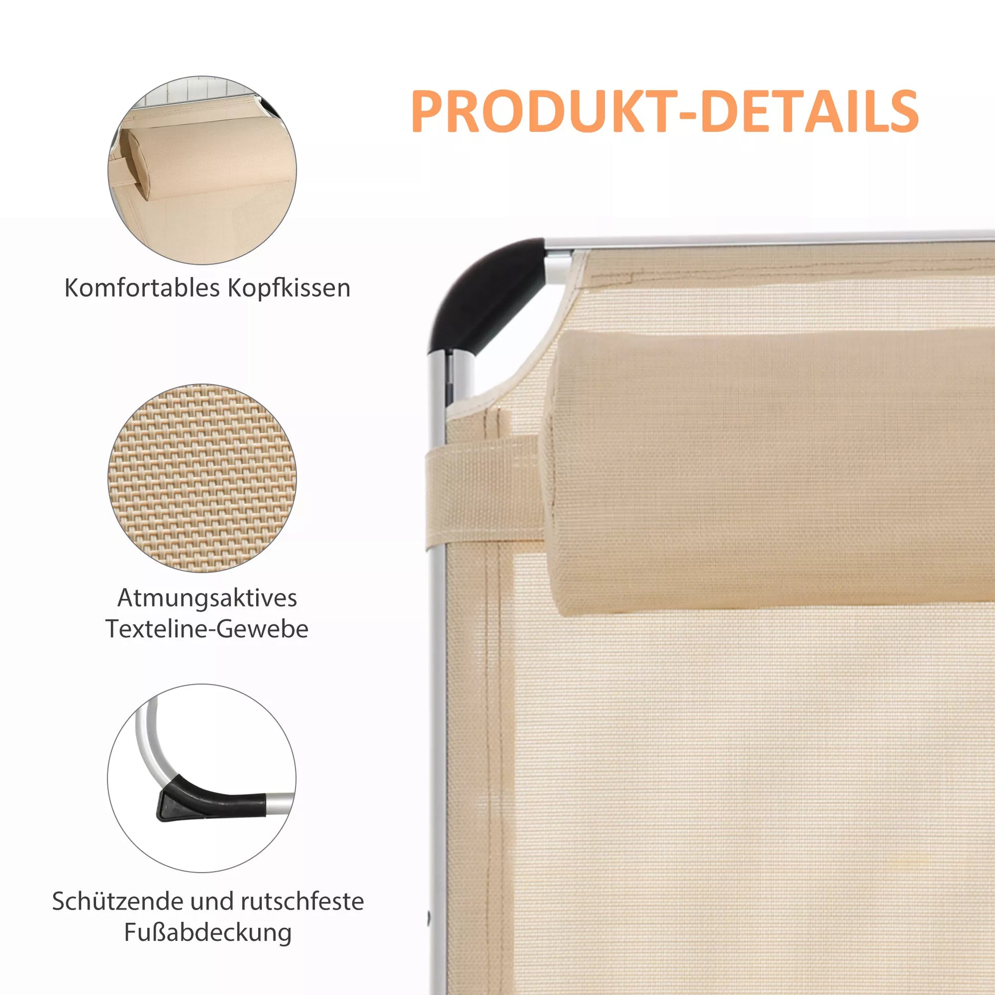 Sulankstomas gultukas su pagalvėle, ergonomiškas poilsio gultukas su 4 pakopų reguliuojama atlošu, aliuminio, atlaiko iki 120 kg, sodui, terasai, baseinui, paplūdimiui, smėlio spalvos