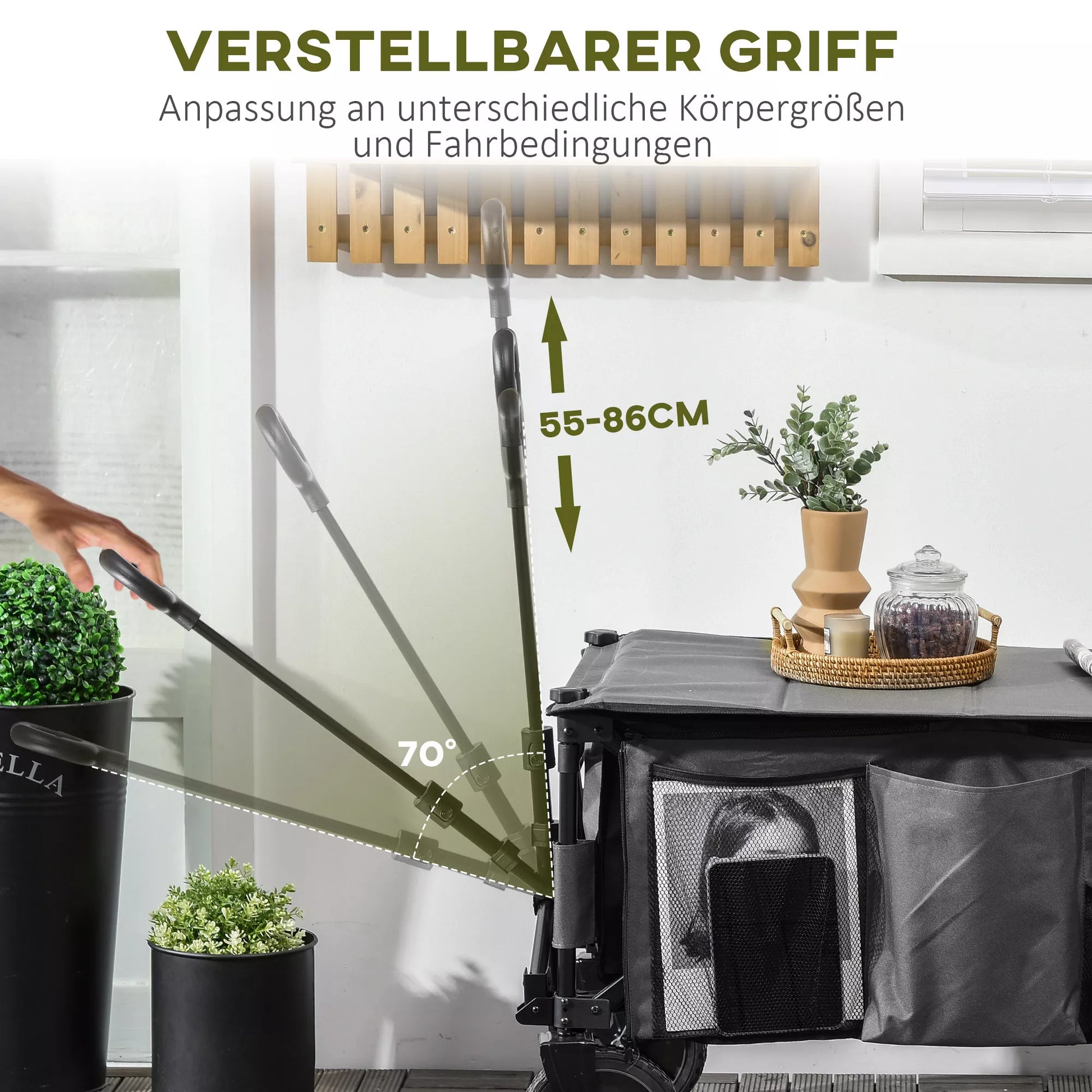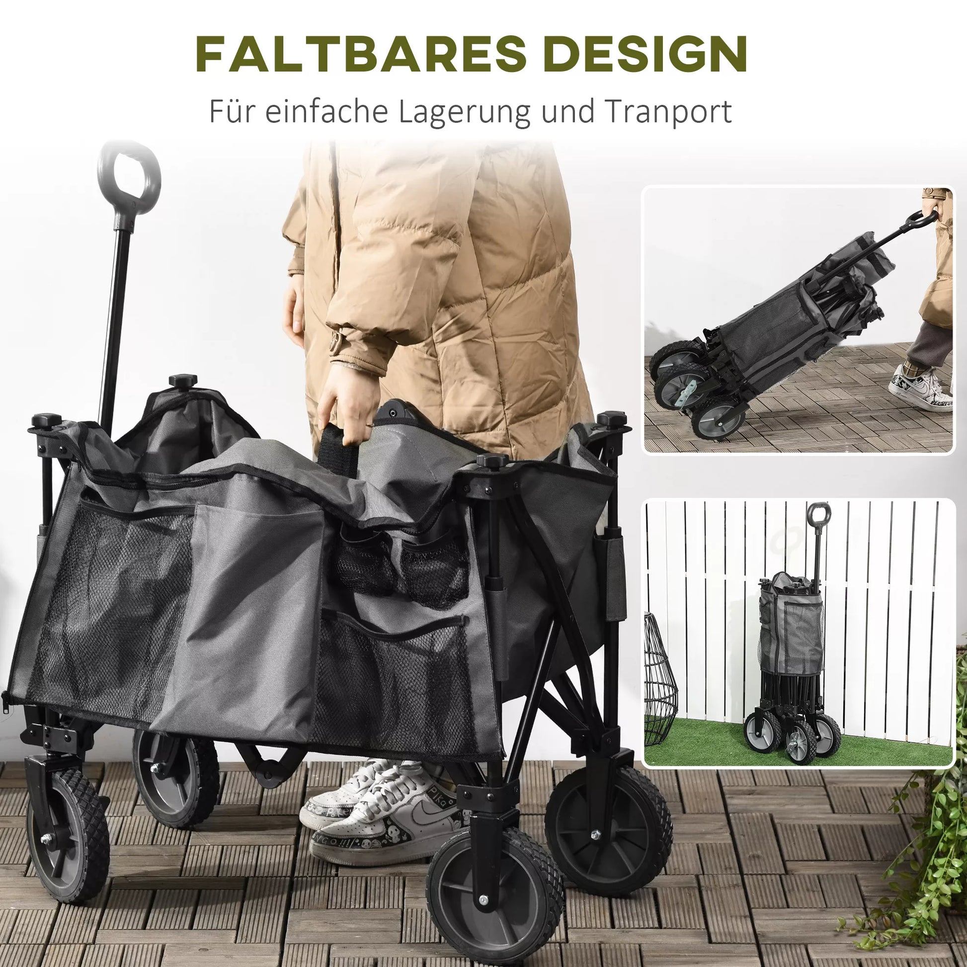 Šis sulankstomas vežimėlis palengvina Jūsų naštą! Jei keliaujate į stovyklą, važiuojate į paplūdimį ar vežate daug žaislų į žaidimų aikštelę, Jums nebereikės didelių kelioninių krepšių. Nenaudojamą sulankstomą vežimėlį tiesiog sulankstykite ir vežkitės bagažinėje. Pirkdami ar dirbdami sode, šis sulankstomas vežimėlis taip pat pasitarnaus kaip neįtikėtinai praktiškas pagalbininkas, kuris palengvins darbą ir sumažins Jūsų nešamą svorį.