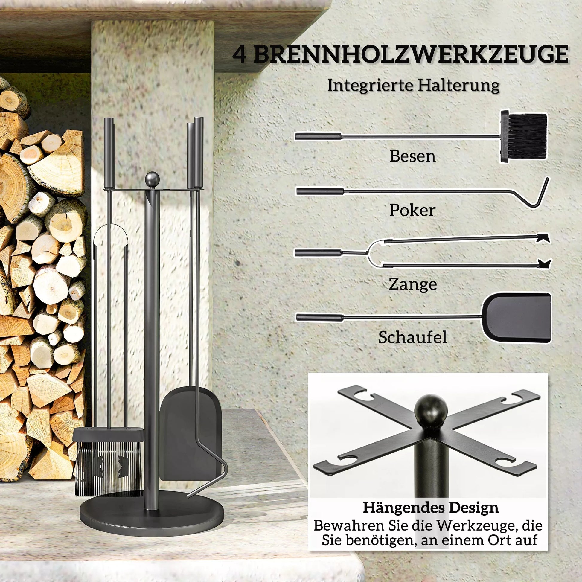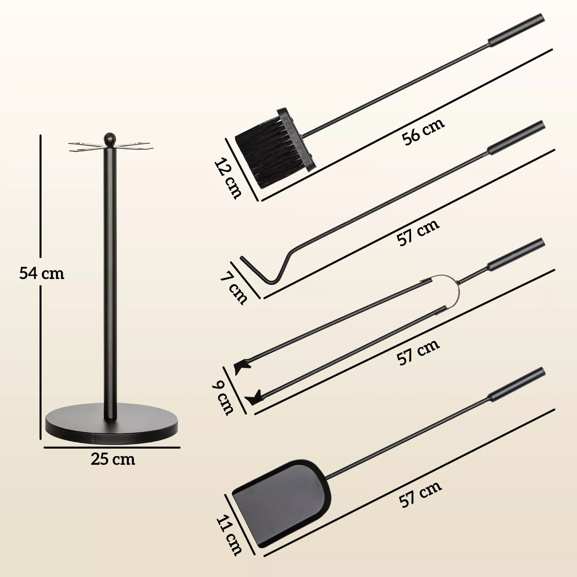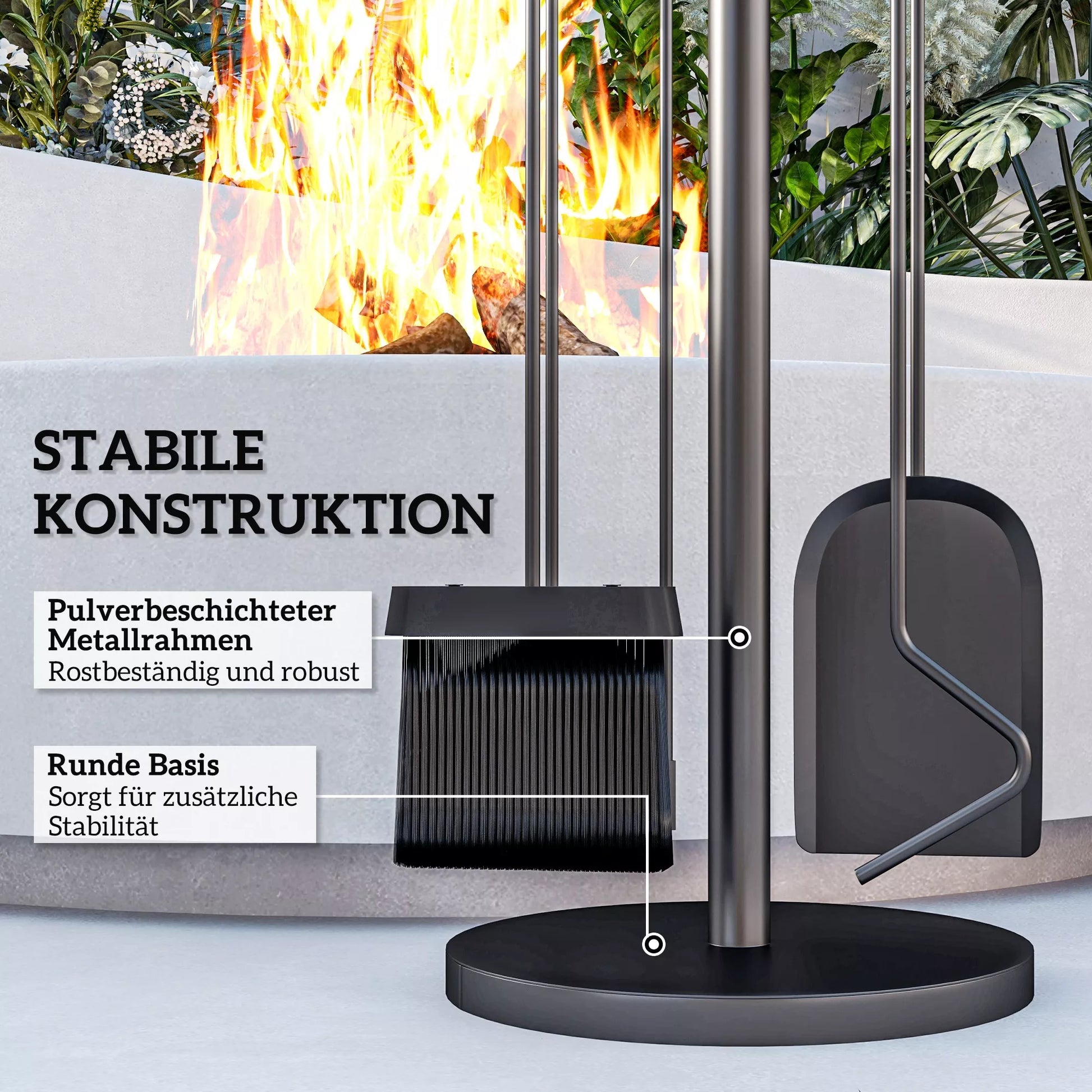 Židinio įrankių rinkinys, 5 dalių, šepetys, kastuvas, žnyplės, angliaraktis ir stovas, ugniai atsparus metalas, juodas