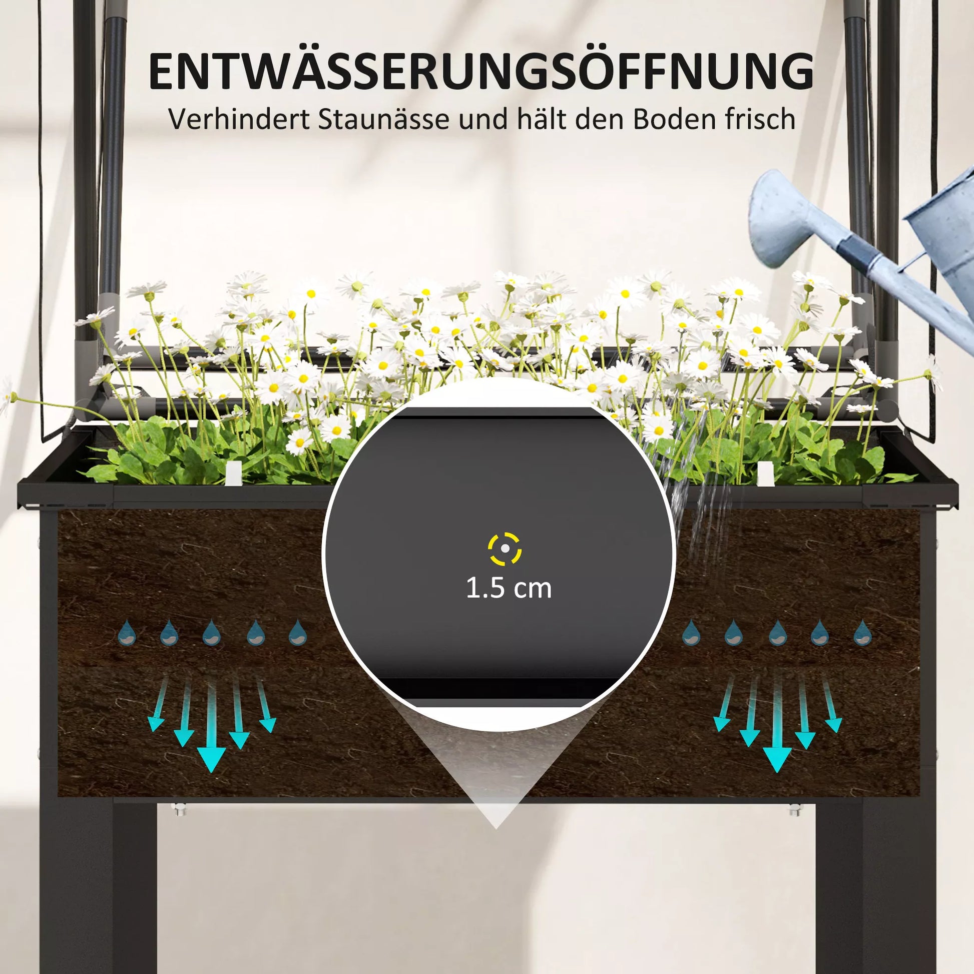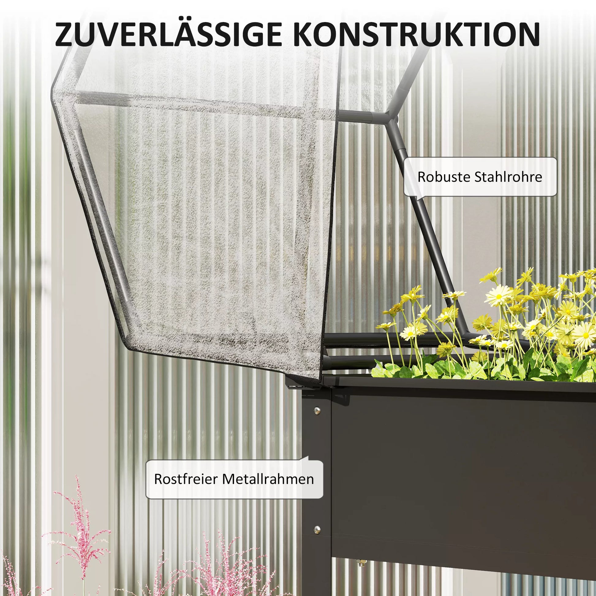 - ✔ Pakelta gėlių dėžės konstrukcija sumažina poreikį lenktis, apsaugo augalus nuo piktžolių ir kenkėjų