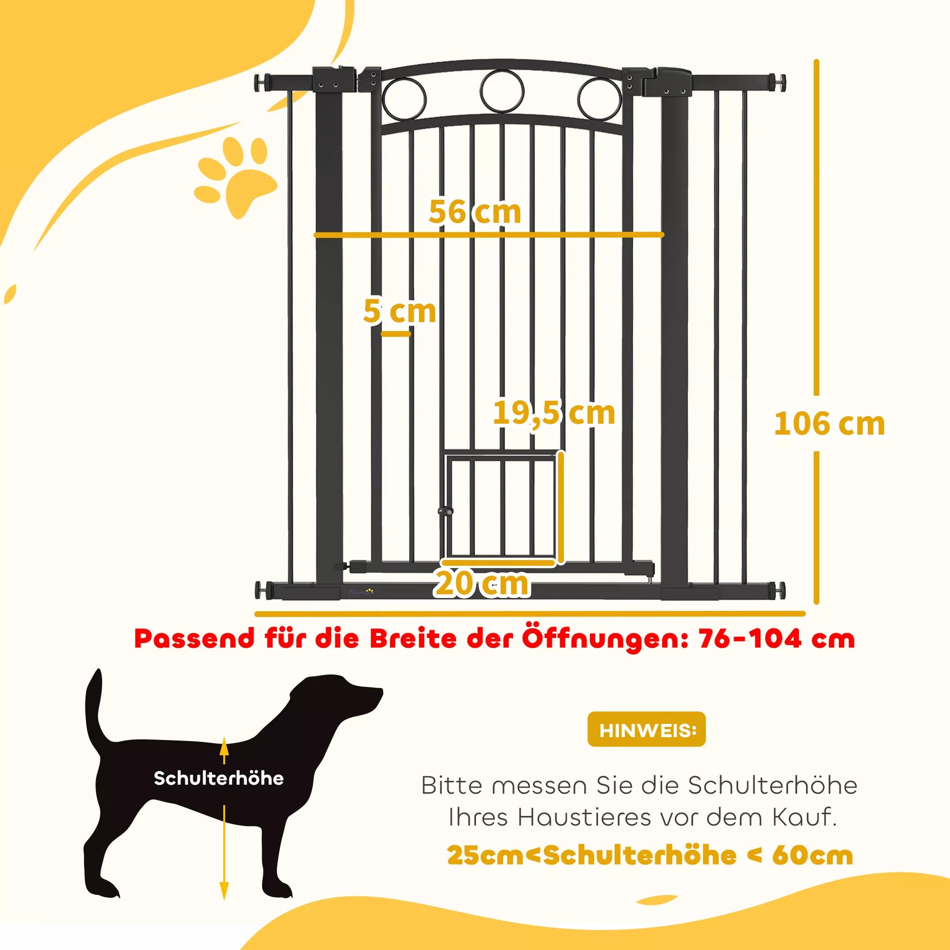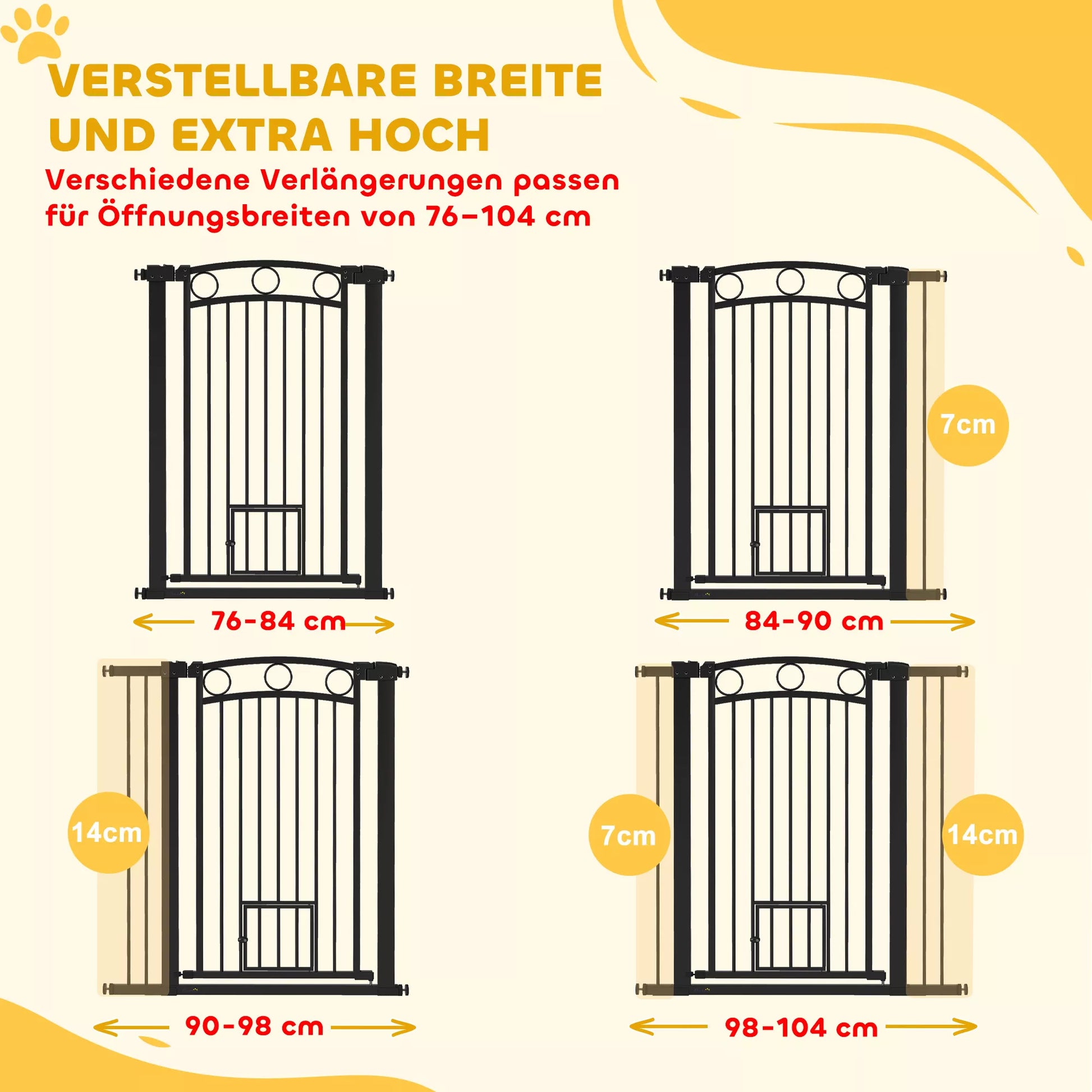 106 cm aukščio reguliuojamo pločio gyvūnų varteliai su integruotomis katės durelėmis, skirti laiptams ir durų staktoms, juodi