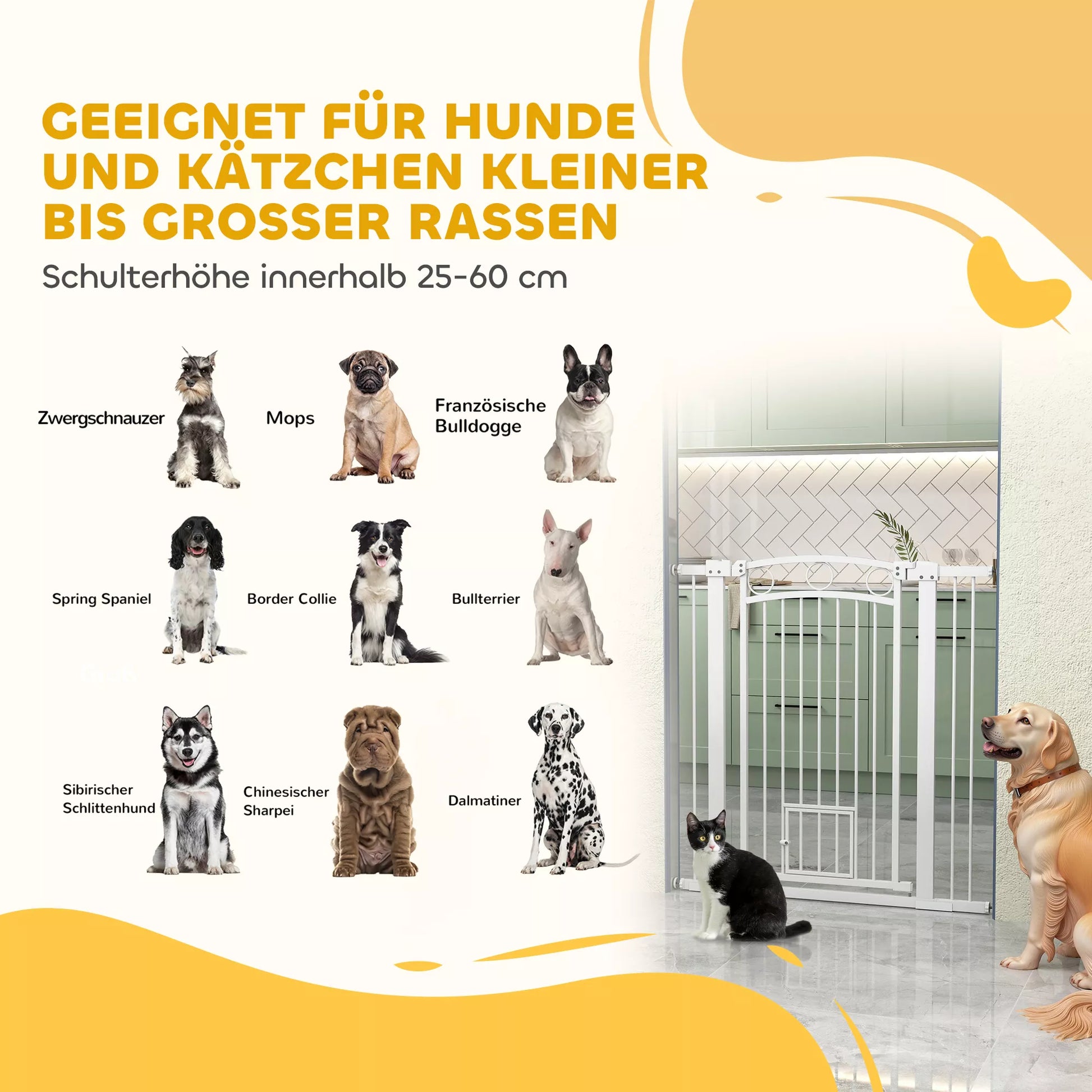 Atraskite laiptų apsauginį vartelį šunims: lankstus sprendimas, kaip saugiai laikyti jūsų augintinius. Šis aukštas ir platus laiptų vartelis reguliuojamas nuo 76 iki 104 cm, idealiai tinka įvairioms erdvėms. Dėl dvigubos užrakto sistemos ir praktiško kačių durelių šis laiptų apsauginis vartelis puikiai tinka namams, kuriuose gyvena keli augintiniai. Stilingas ir praktiškas – nepakeičiamas aksesuaras kiekvienam augintinio savininkui.