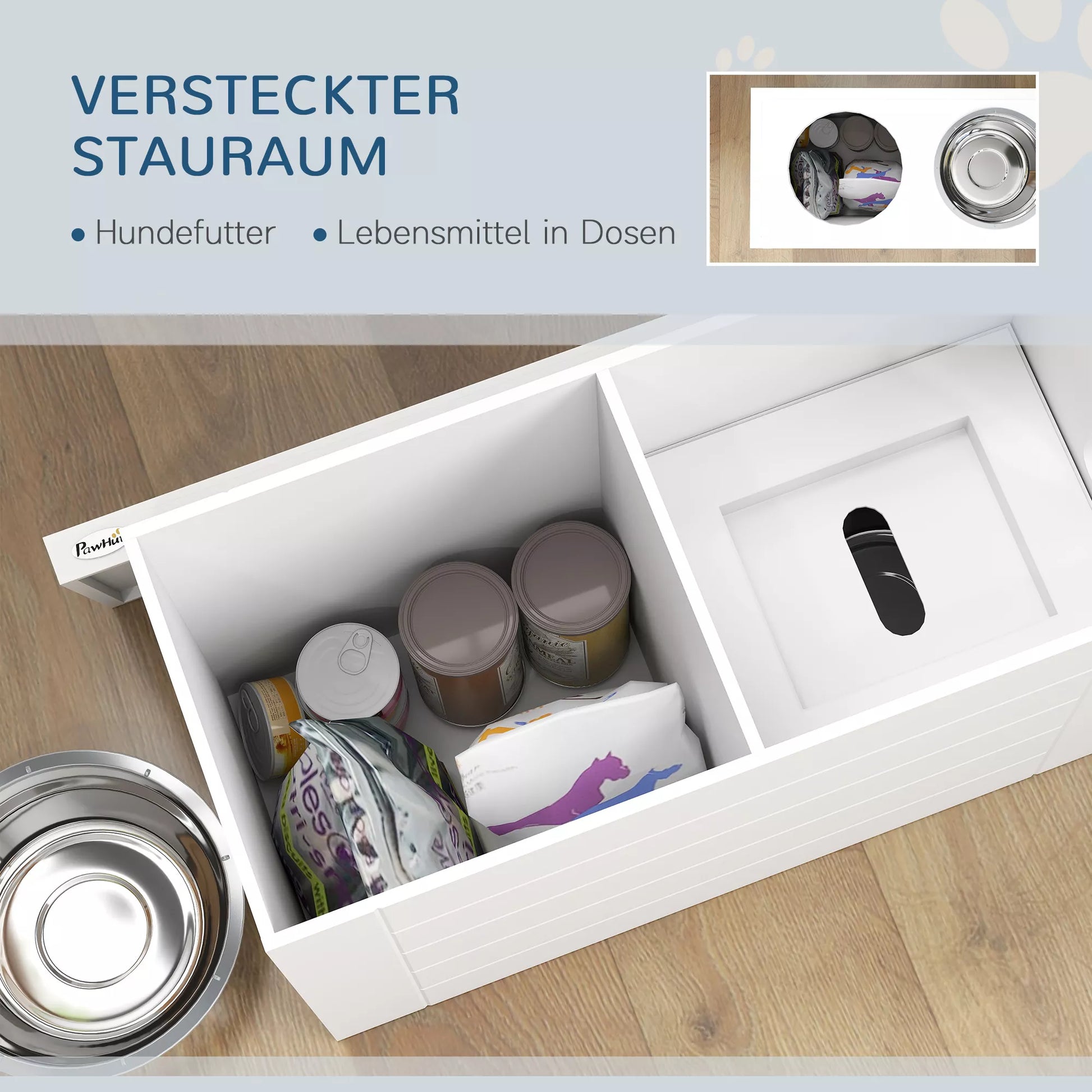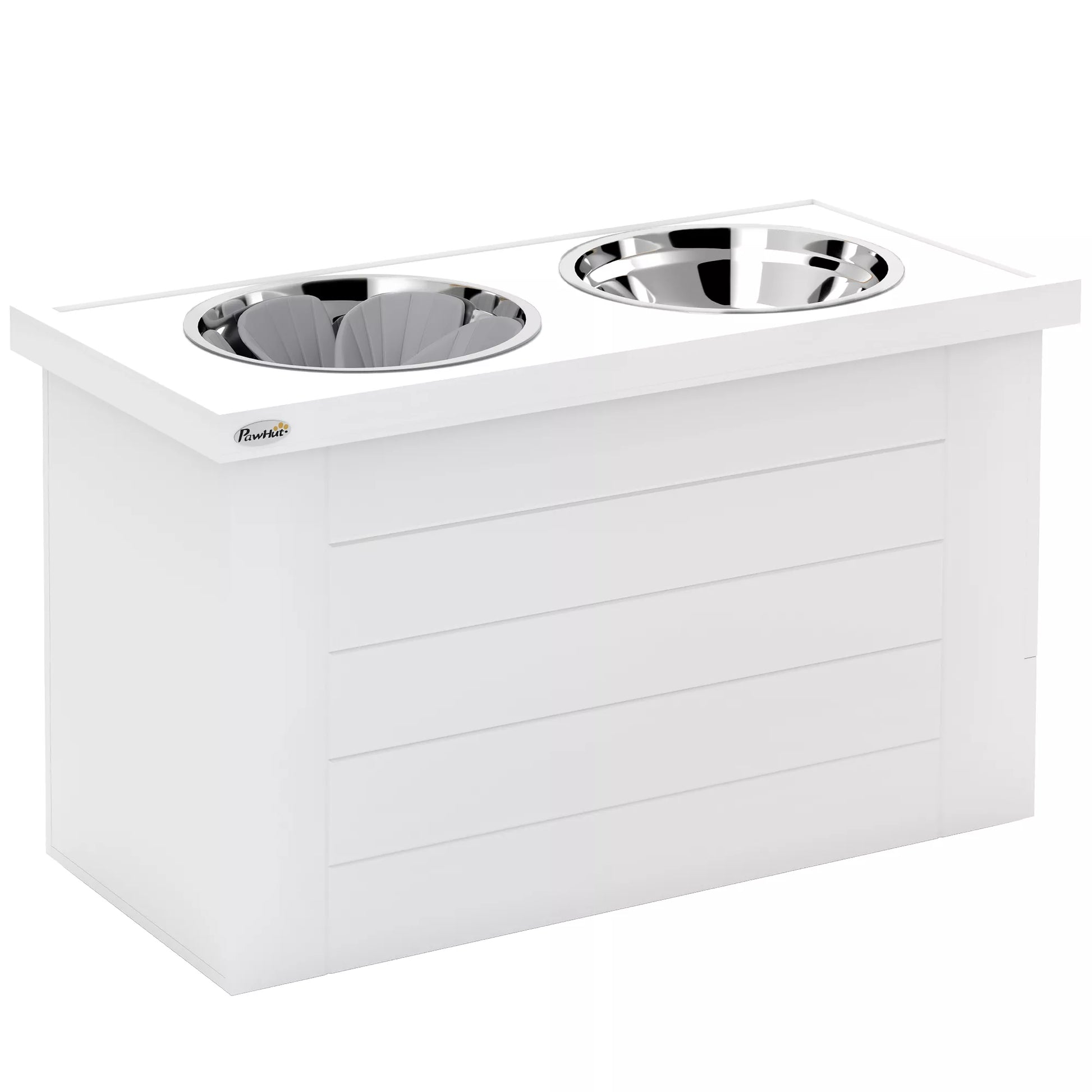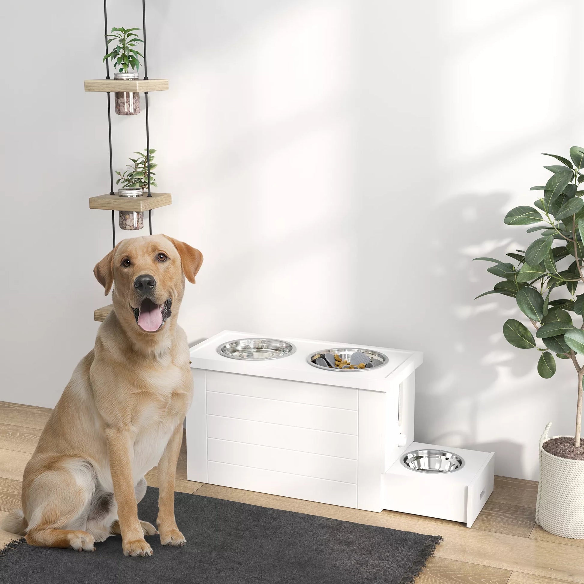 PawHut 2-in-1 paaukštintas šunų dubenėlis, reguliuojamo aukščio maisto dubenėlis su stovu, 2 x 2L nerūdijančio plieno dubenėliai, baltas