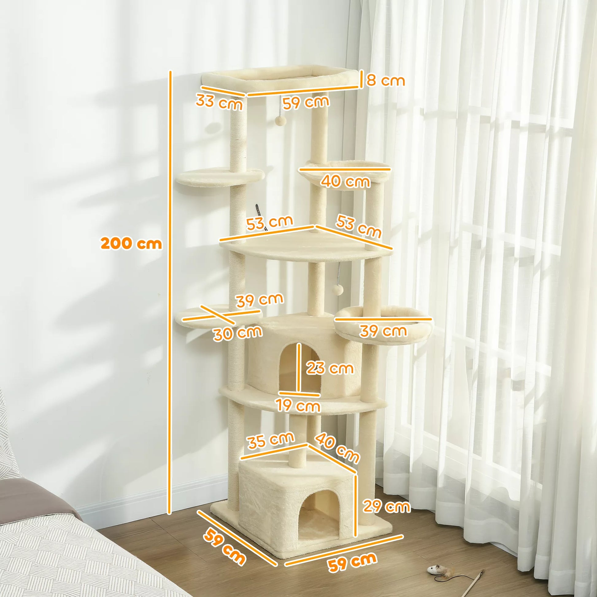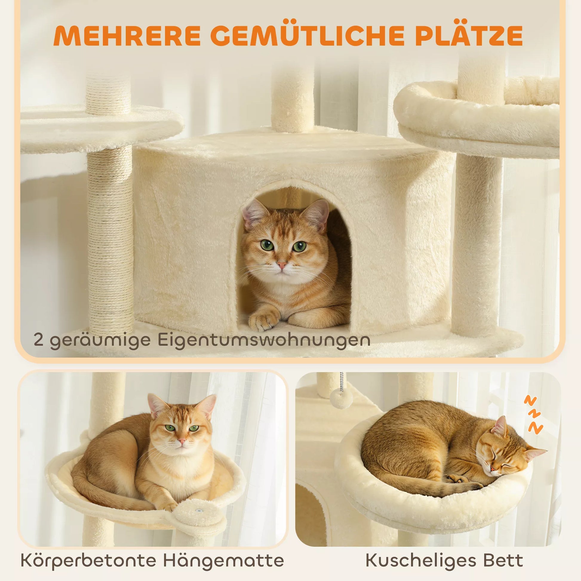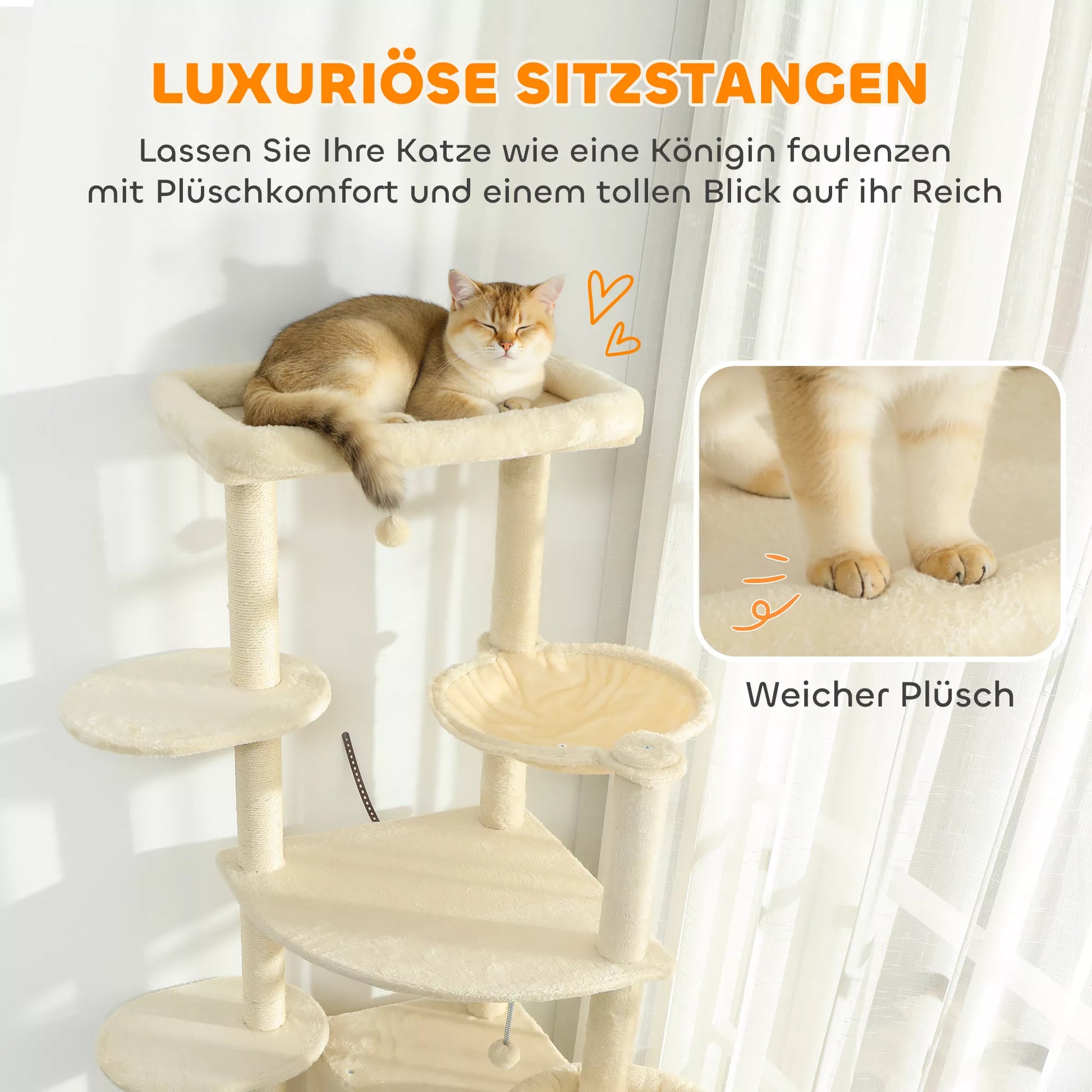 2 metrų aukščio draskyklė 2-3 katėms, draskymo stulpeliai, urvai, hamakas, slėptuvės, daugiaaukštis dizainas, sizalis, mediena, pliušas, smėlio spalvos